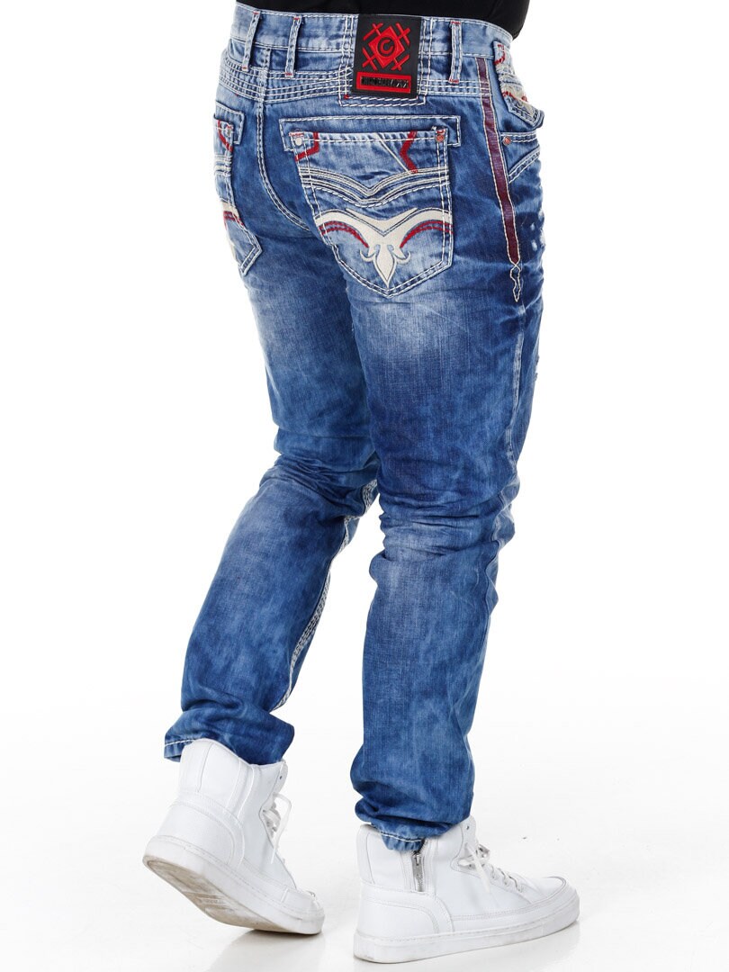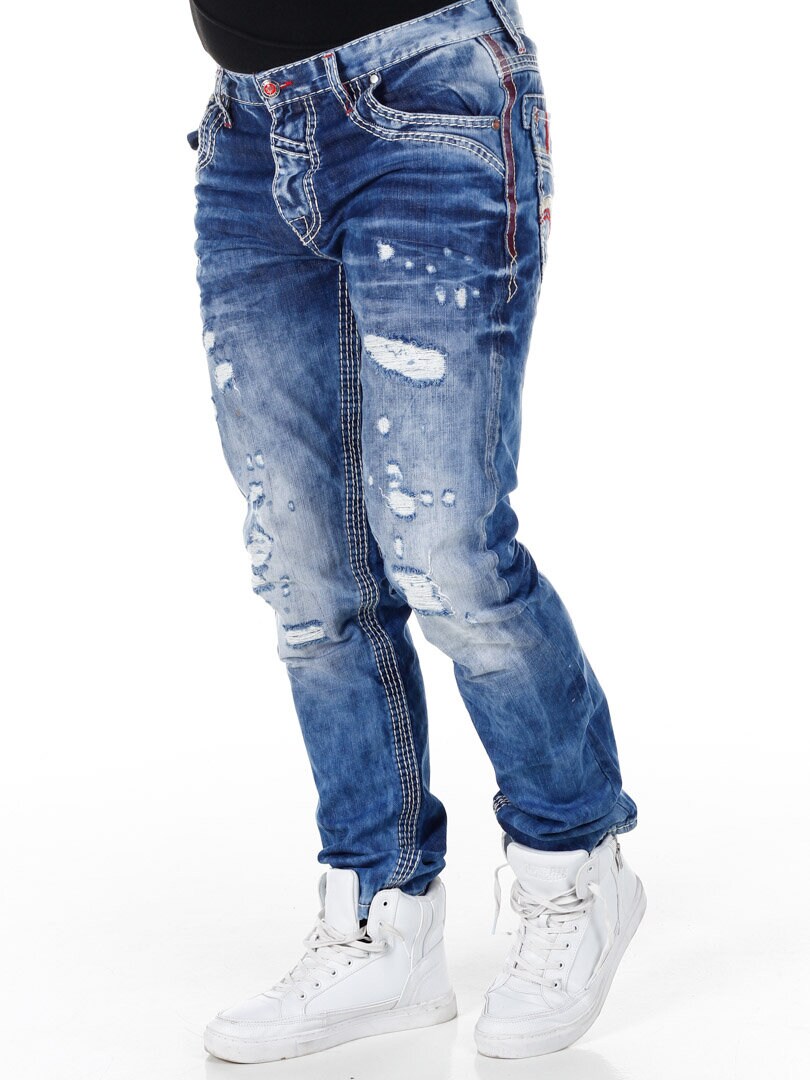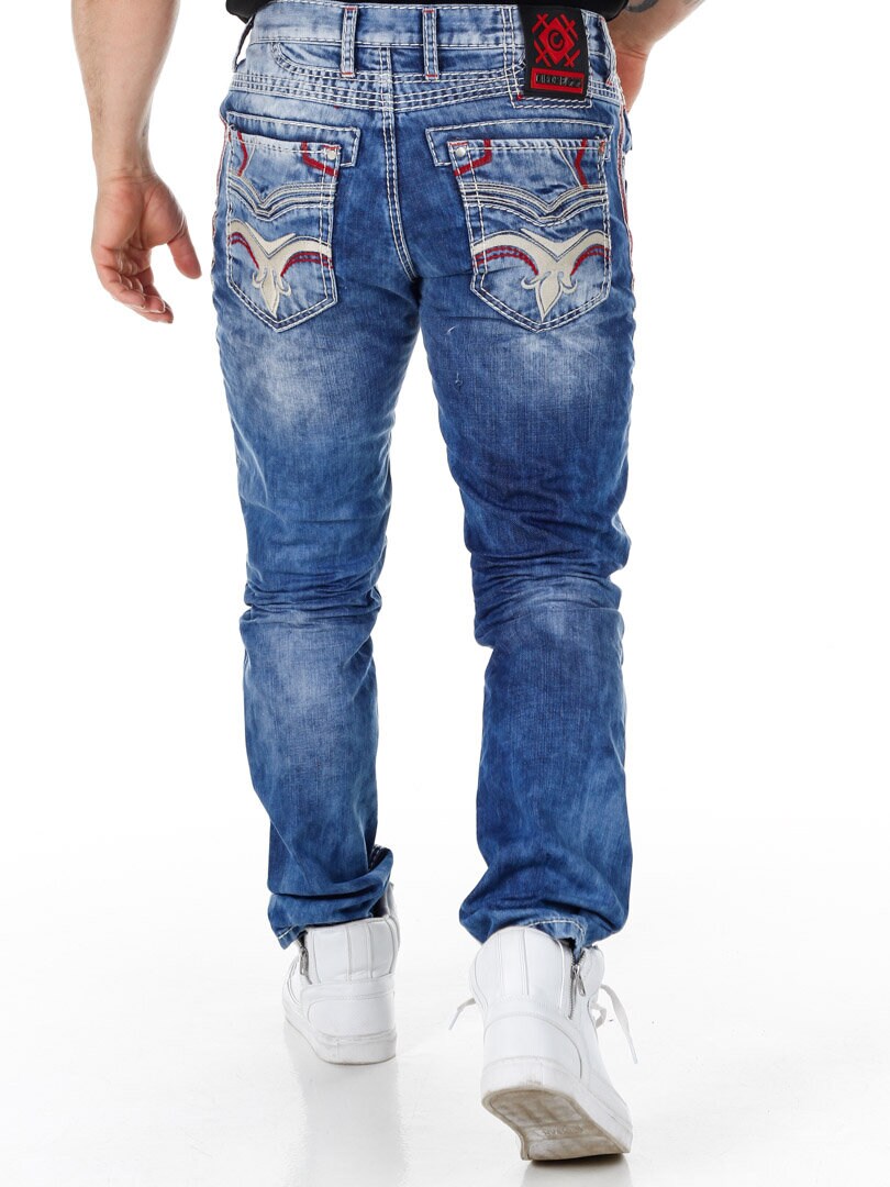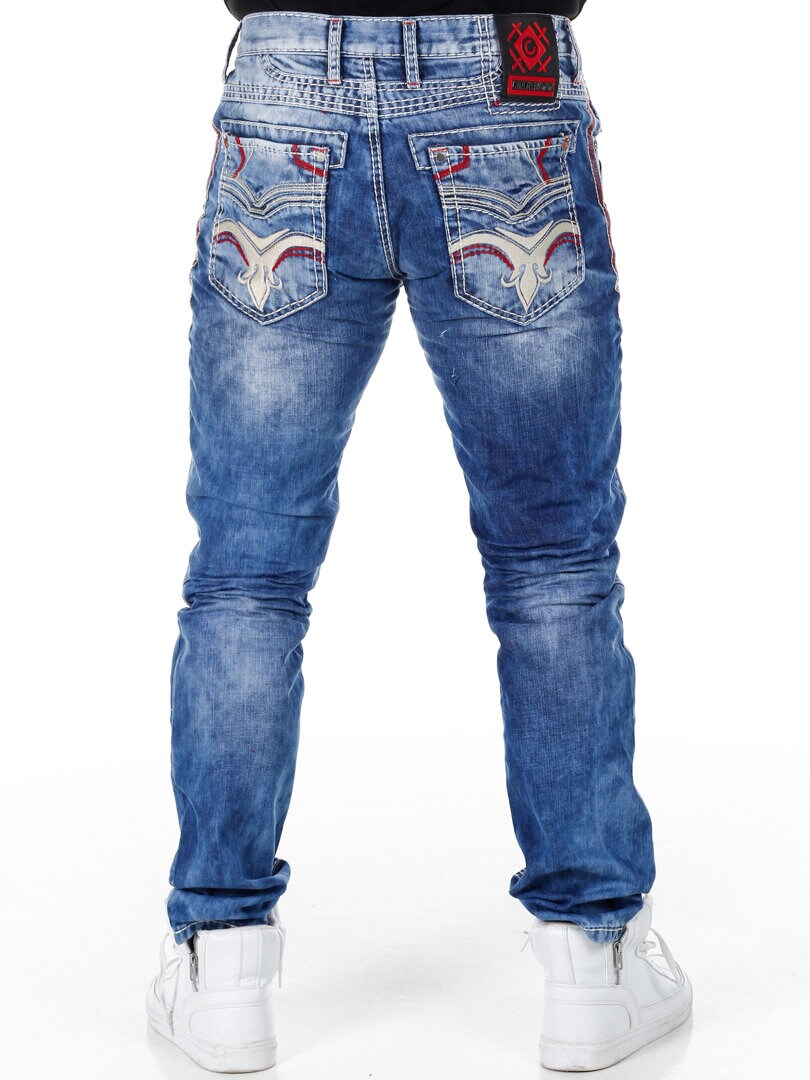Bukser i en mellemblå denim med lyse slitager. Dette er en model med 5 lommer og en klassisk pasform. Bukserne er designede med grove sømme og skræddersyede baglommer der kmmer i kontrastfarver.