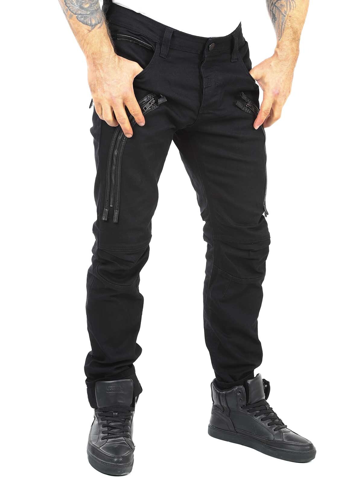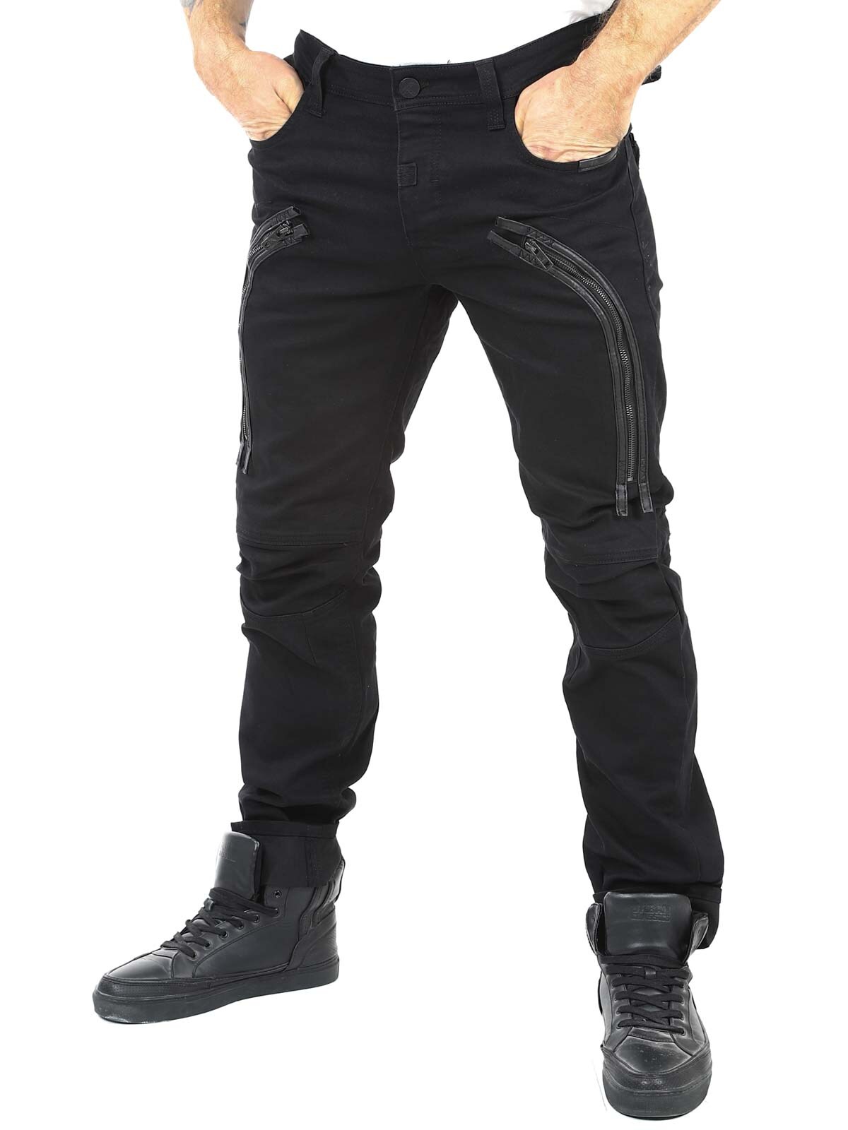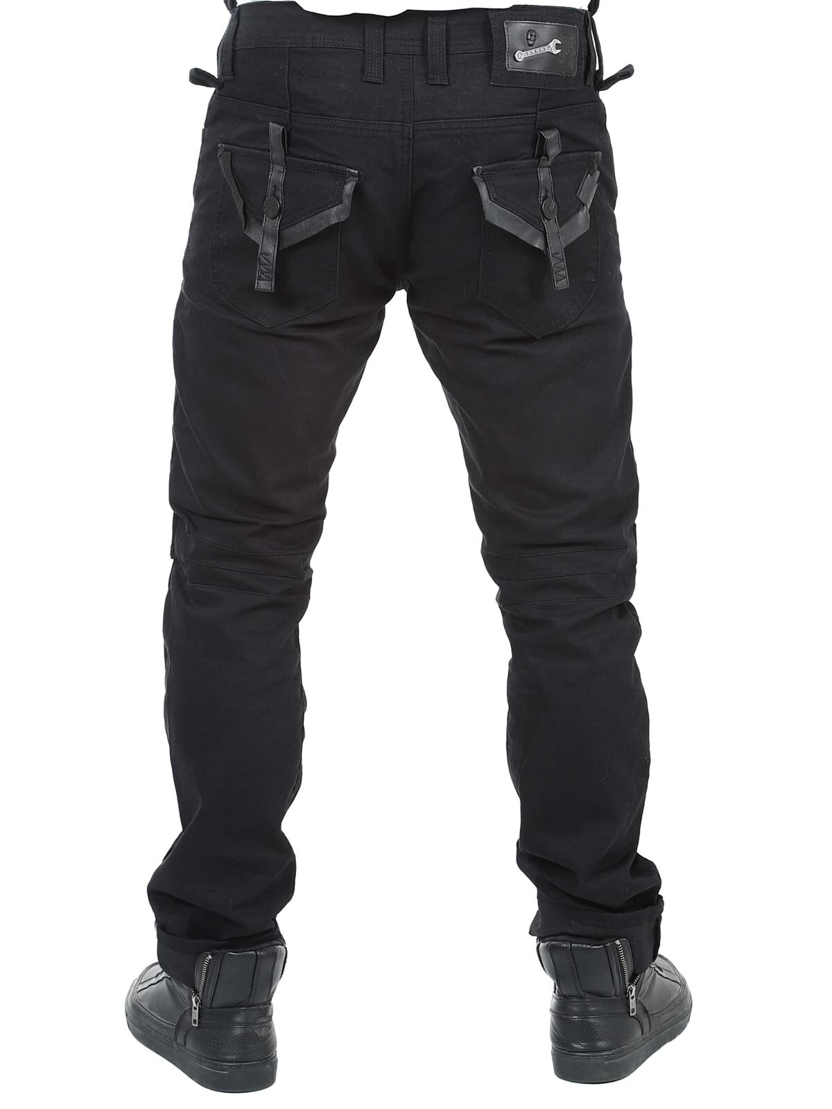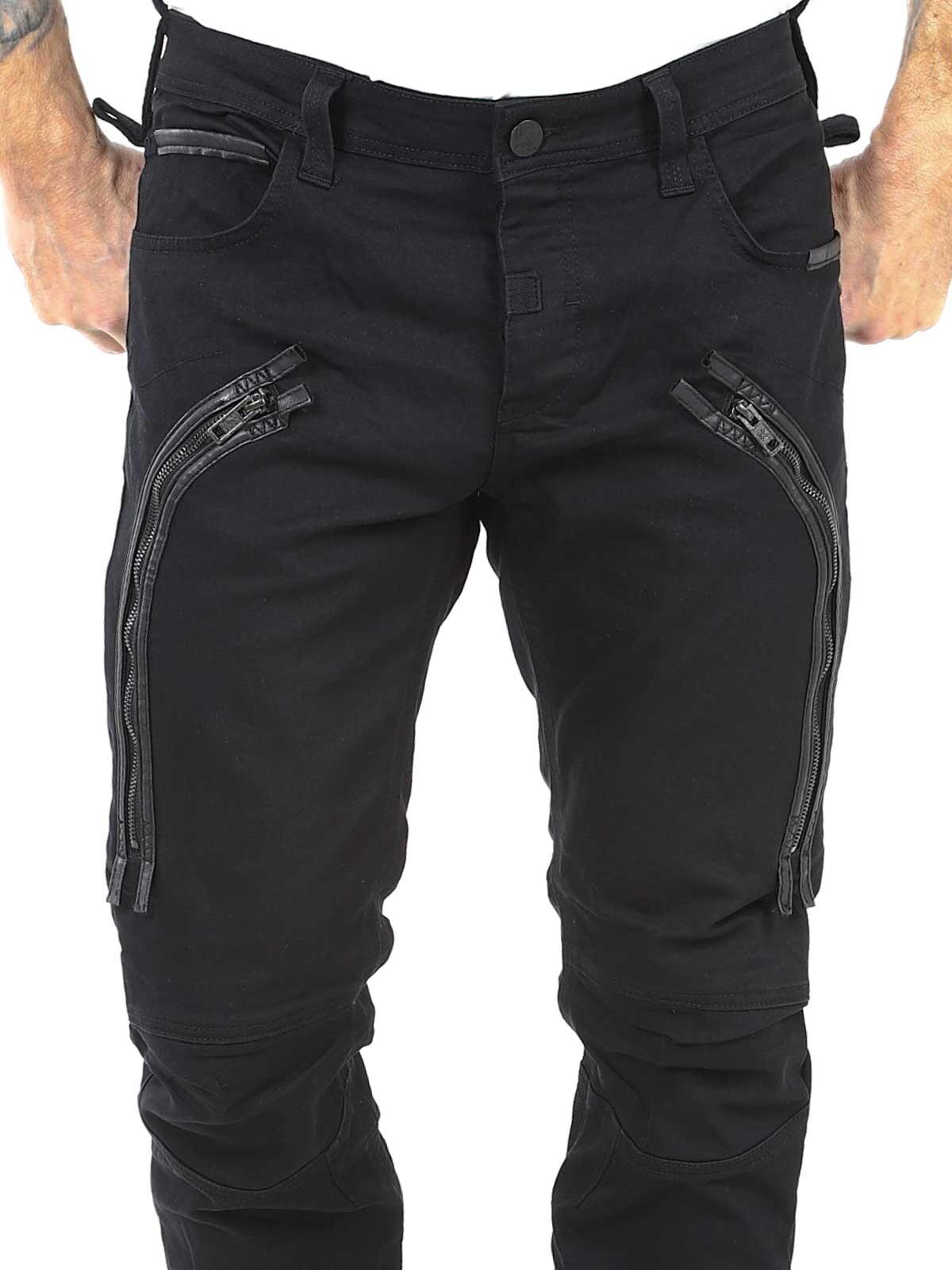 Sorte bukser i denim med stræk og en smal pasform. De har tre åbne lommer fortil, samt to lommer der kan lukkes. Herudover findes der knapper i gylpen. De er designede med lynlåse samt stropper i en skindimitation.