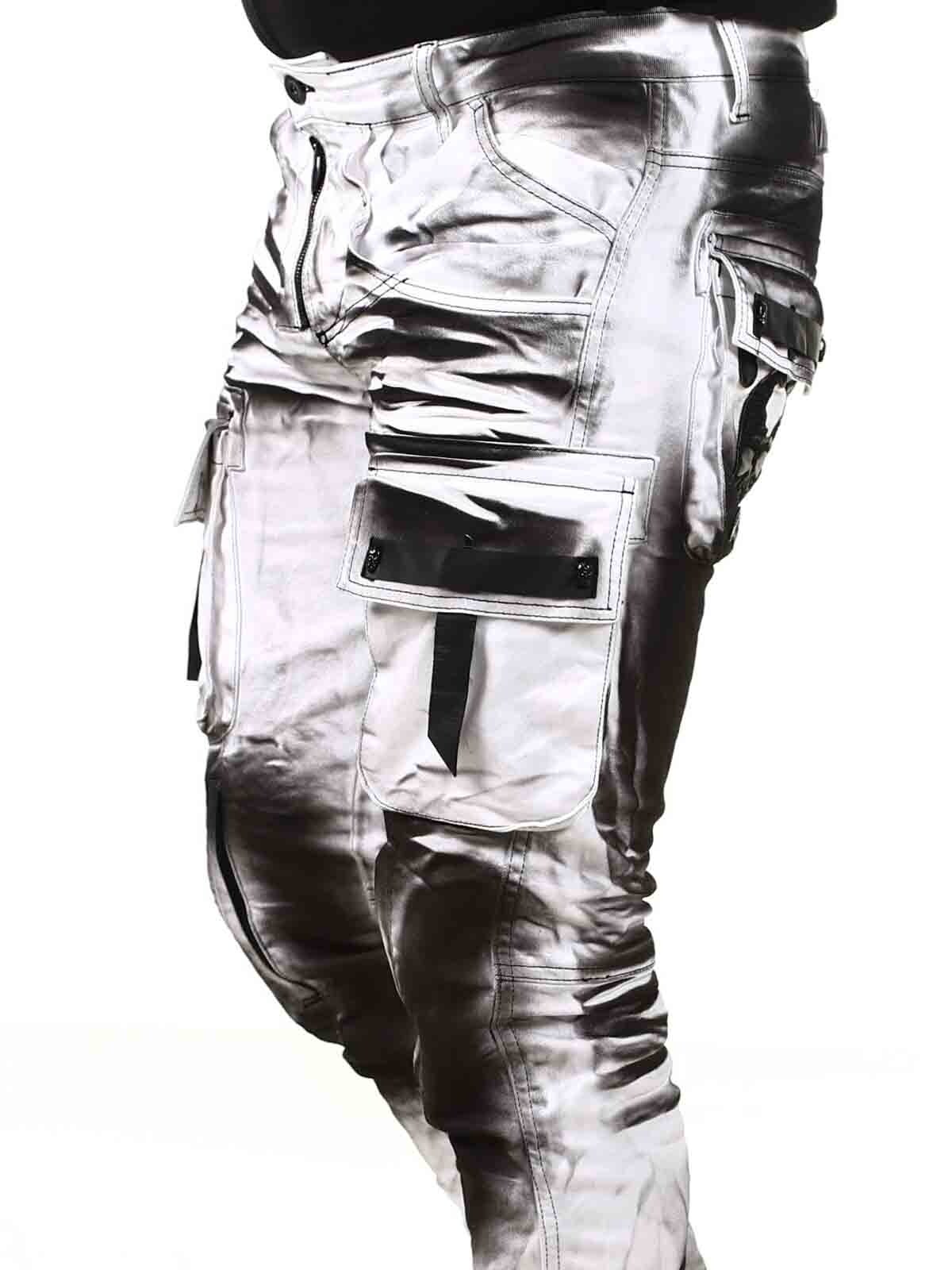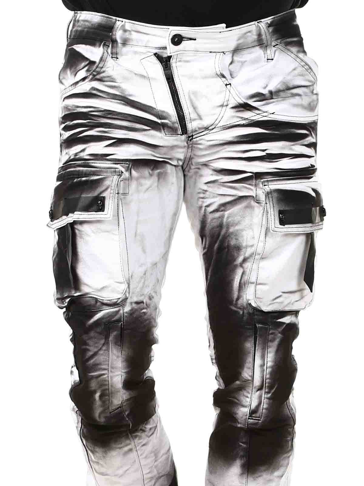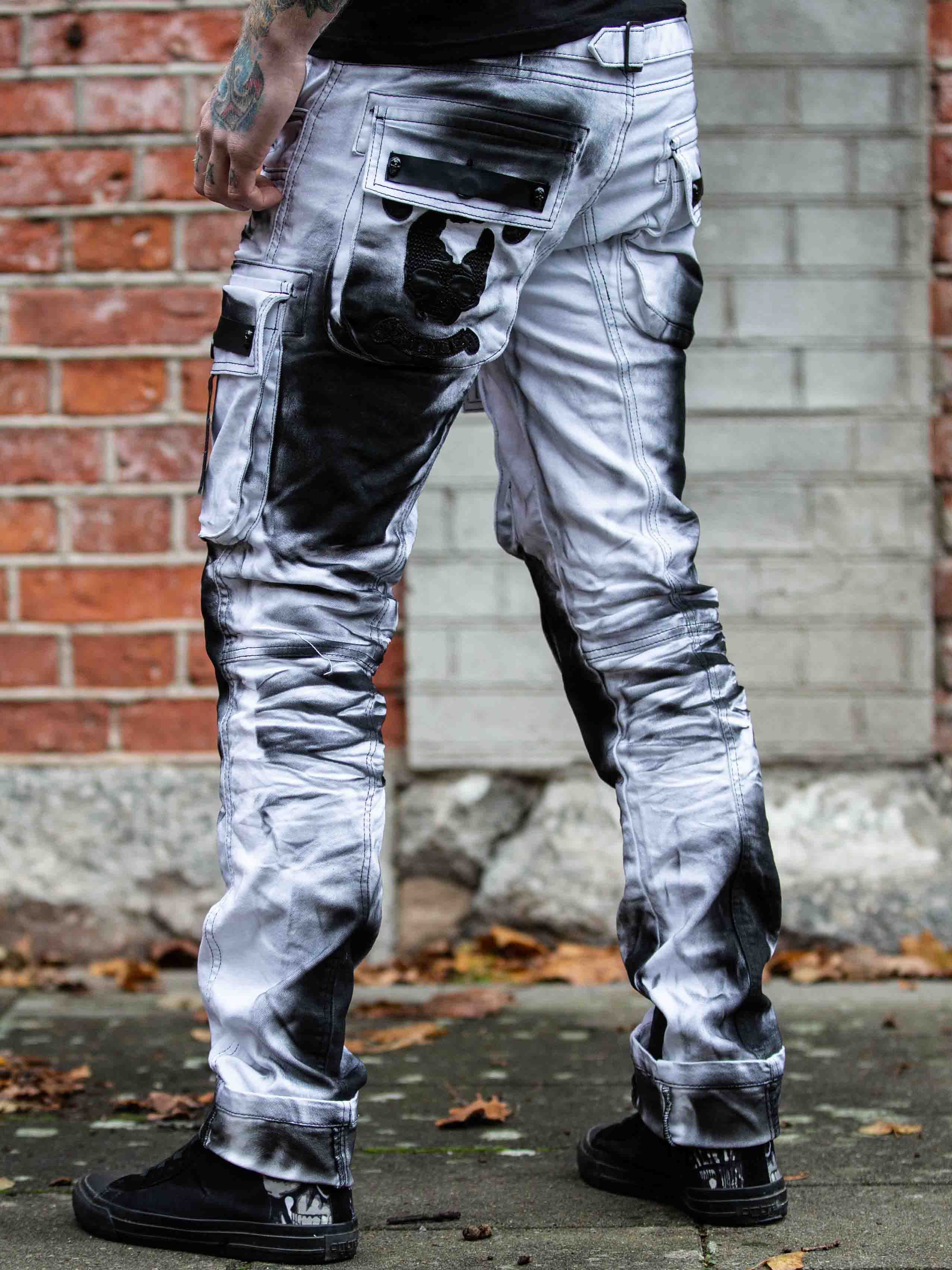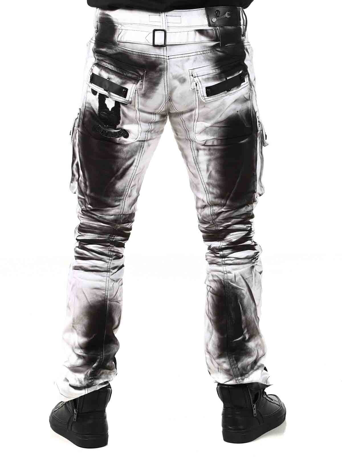 Unikke jeans med flere lommer og malede effeker. De er cool detaljerede med nitter formet som dødningehoveder, remme i læder og lynlåse på knæene. Disse jeans lukkes ved hjælp af en lynlås i gylpen, og desuden har de remme, i taljen, til bæltet.