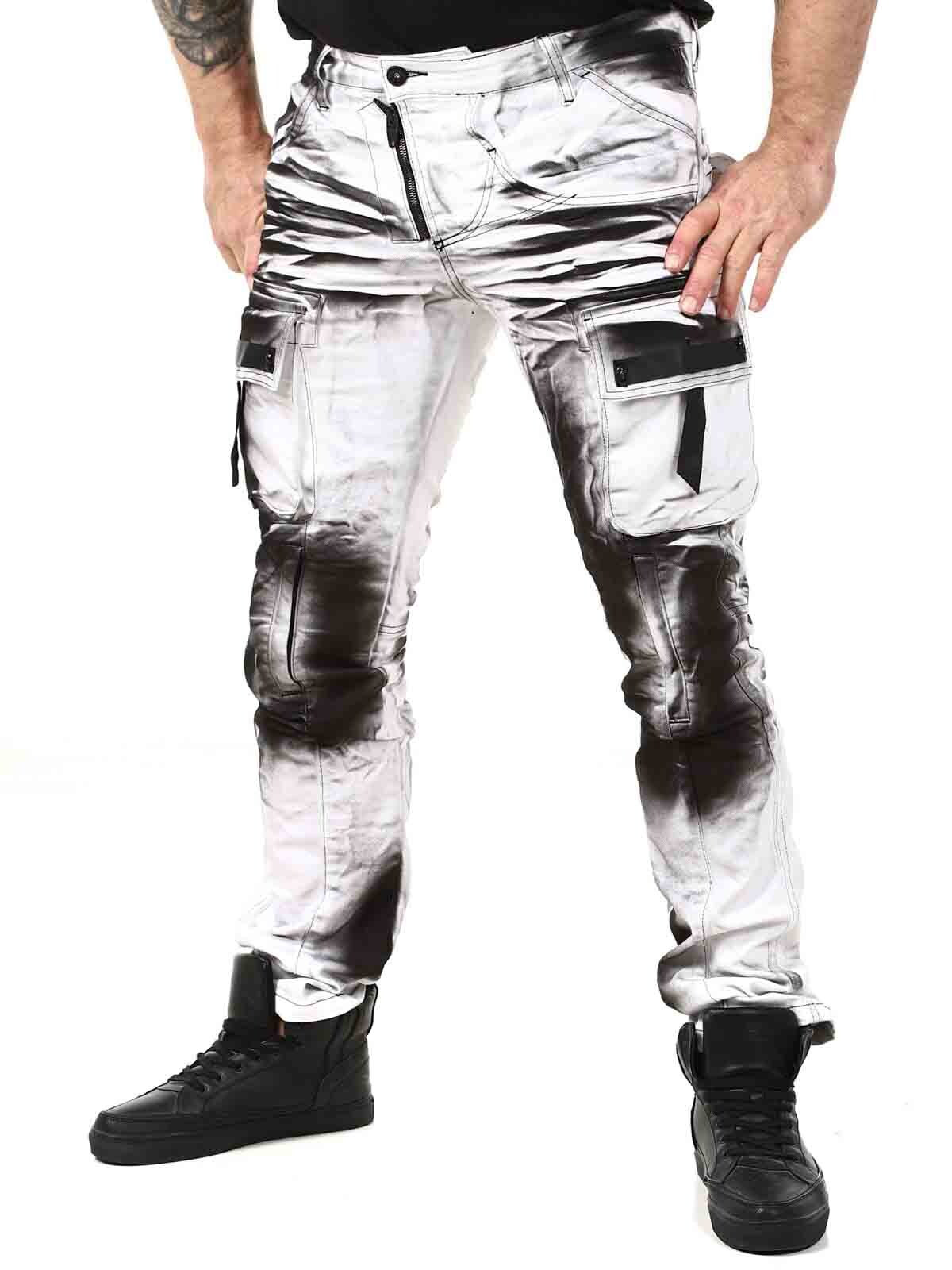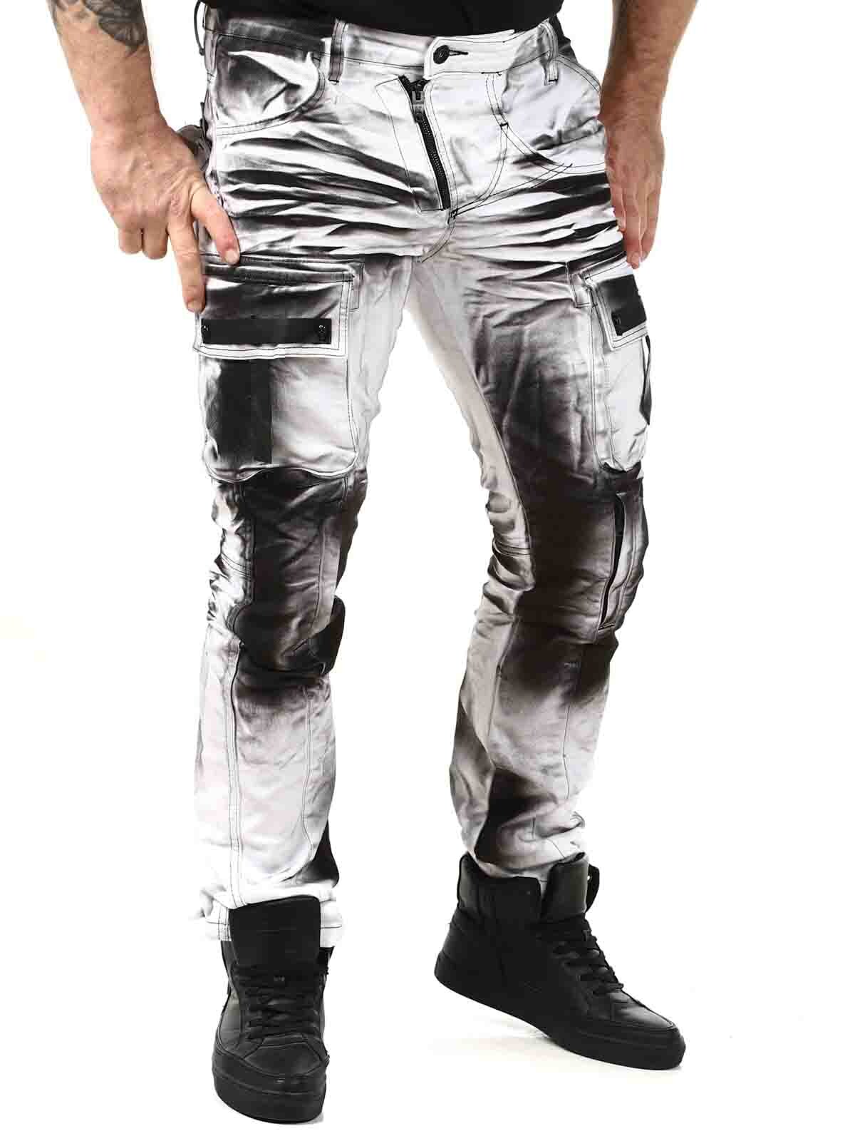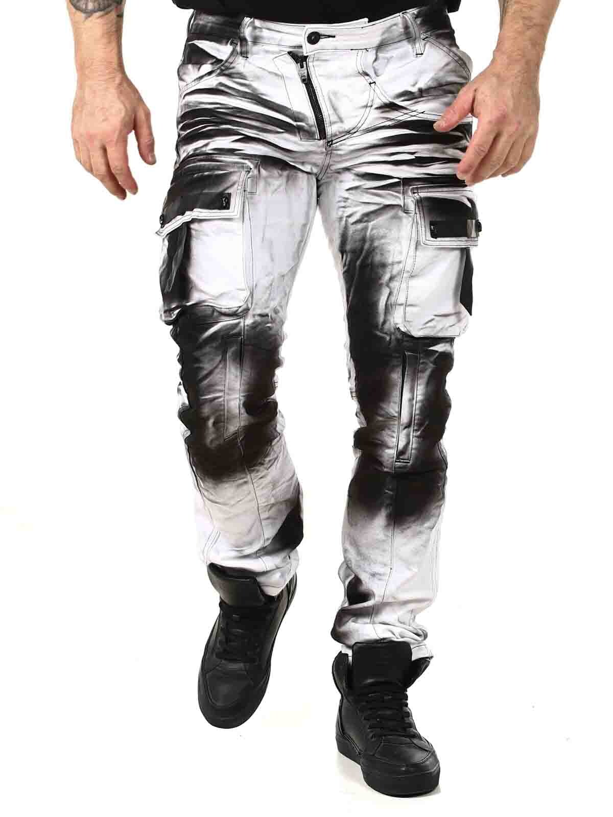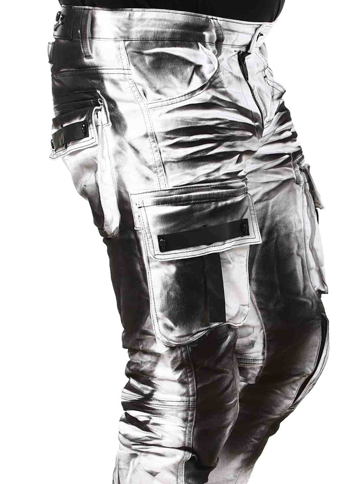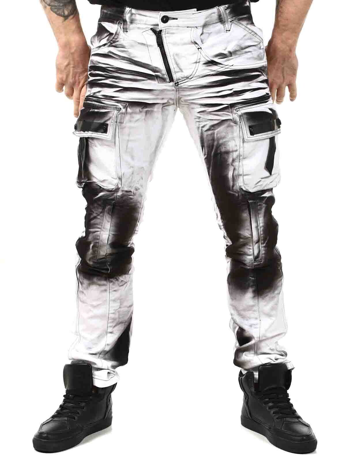Unikke jeans med flere lommer og malede effeker. De er cool detaljerede med nitter formet som dødningehoveder, remme i læder og lynlåse på knæene. Disse jeans lukkes ved hjælp af en lynlås i gylpen, og desuden har de remme, i taljen, til bæltet.