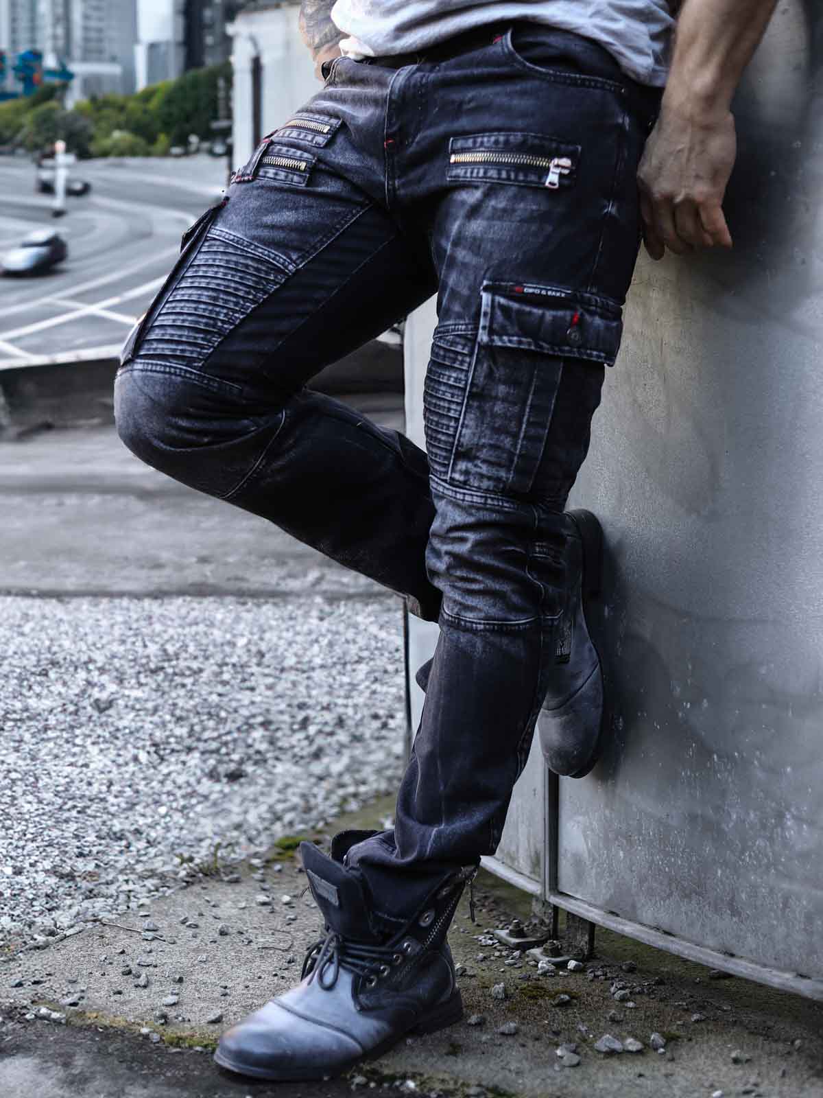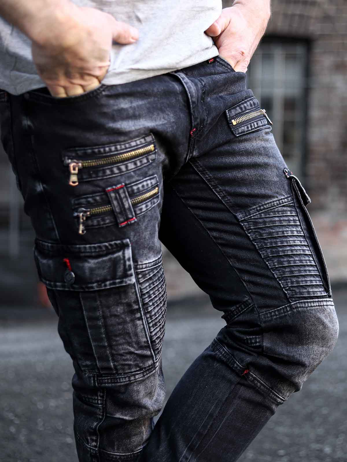 Cool bukser i en sort denim med et slidt look. De er designede med markerede sømme, lynlåse og et riflet parti. De har flere lommer og en klassisk pasform.