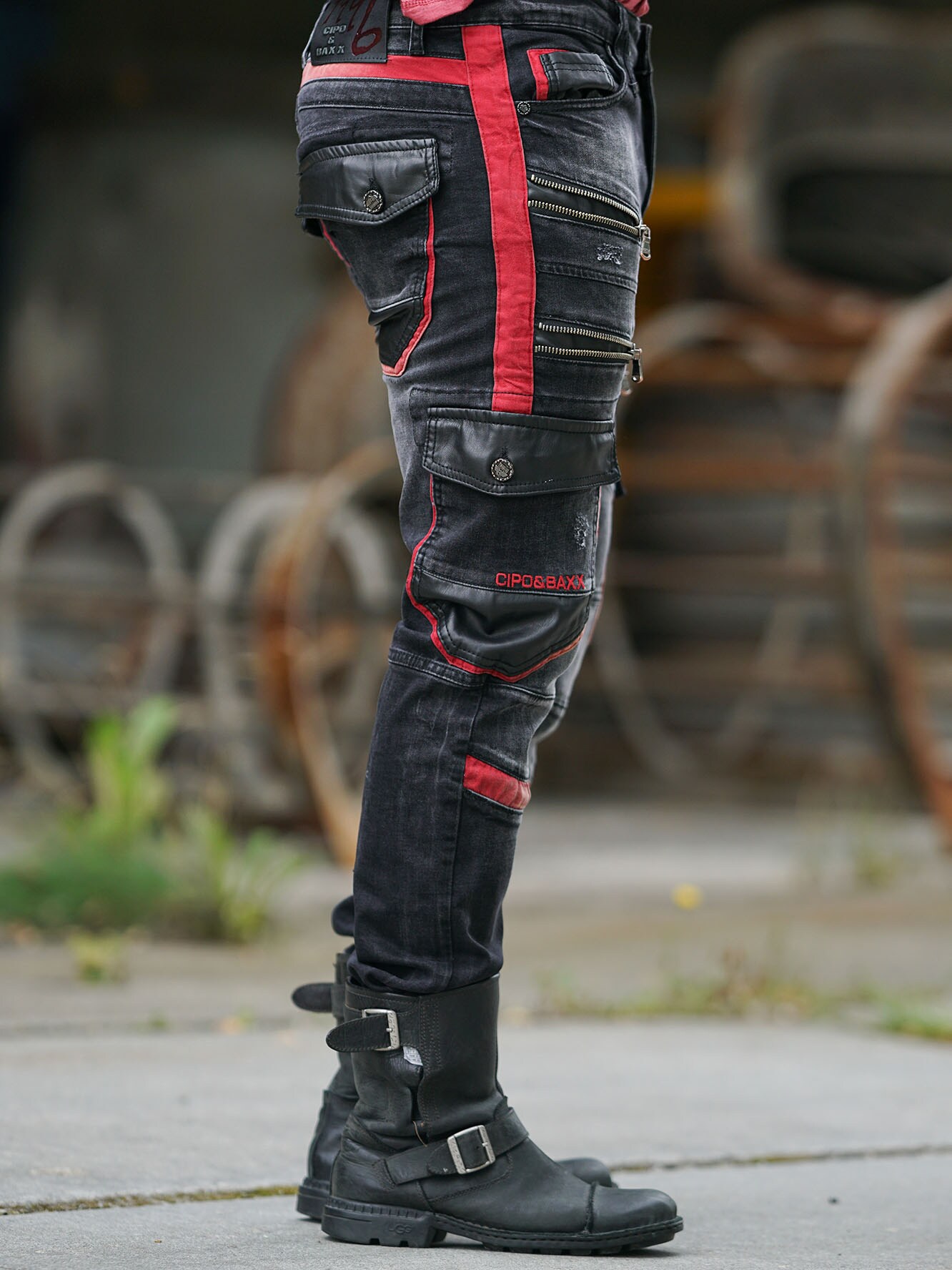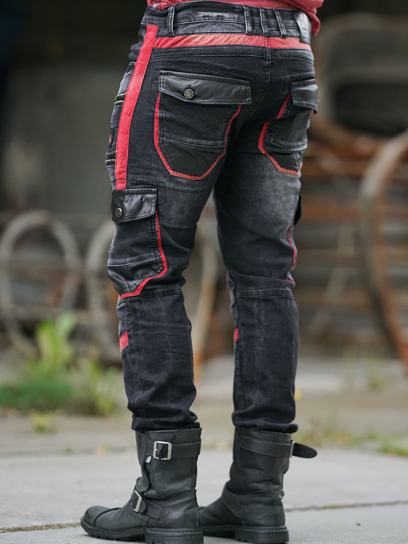 Sorte, smalle jeans med rå detaljer og flotte slitager. Materialet føles stretchigt, og modellen har fire lommer fortil og to bagpå. Bukserne har et unikt design med røde kontraster, lynlåse og sorte læderimitationer.
