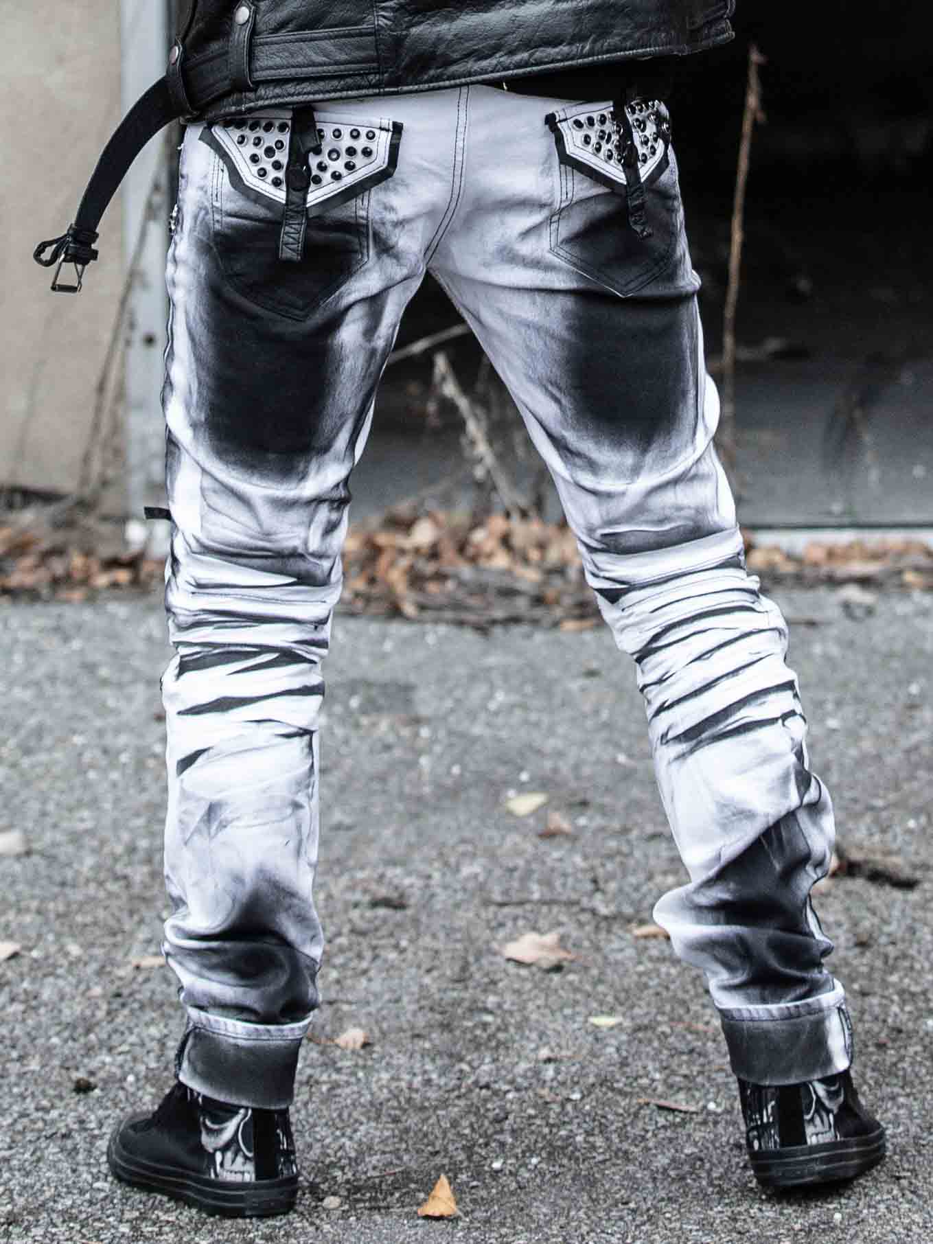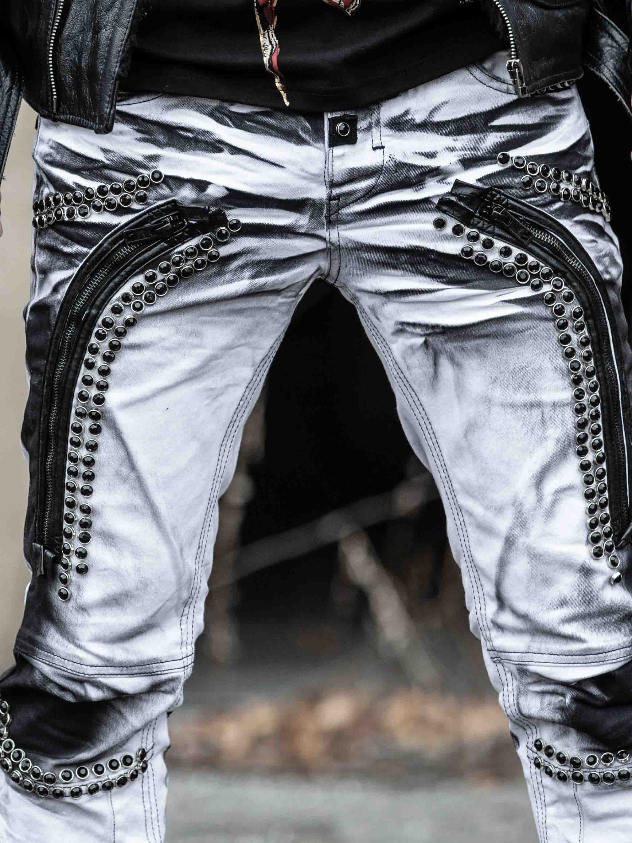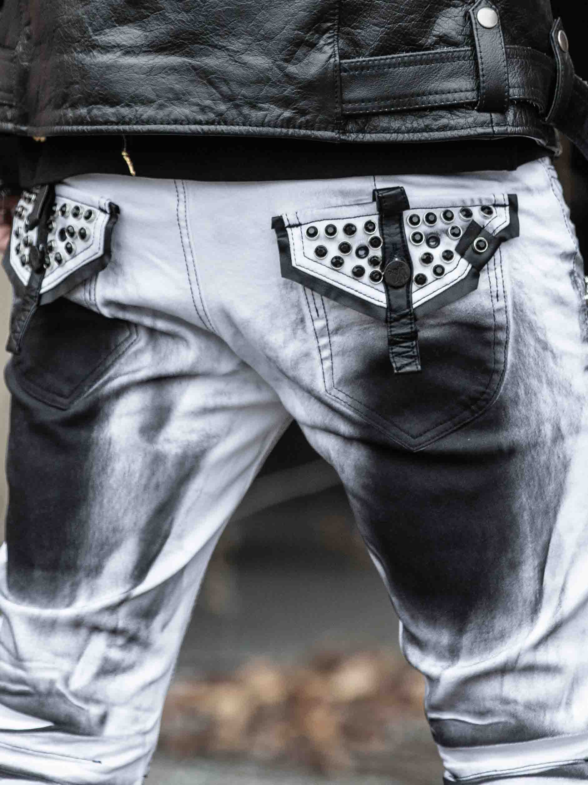 Hvide bukser i denim med stræk og en smal pasform. De har tre åbne lommer fortil, samt to lommer der kan lukkes. Herudover findes der knapper i gylpen. De er designede med sorte nitter i sten, lynlåse samt stropper i en skindimitation.