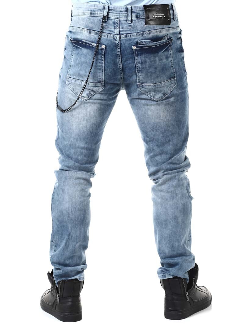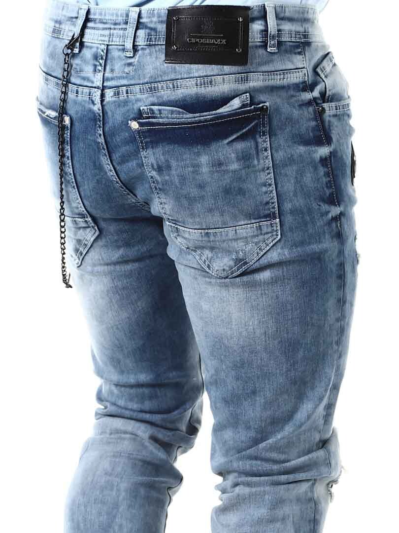 Bukser i en blød denim med aftagelig kæde og rummelige lommer. Hårdt design med slitager, revner, kontraststof og lapper af stof.