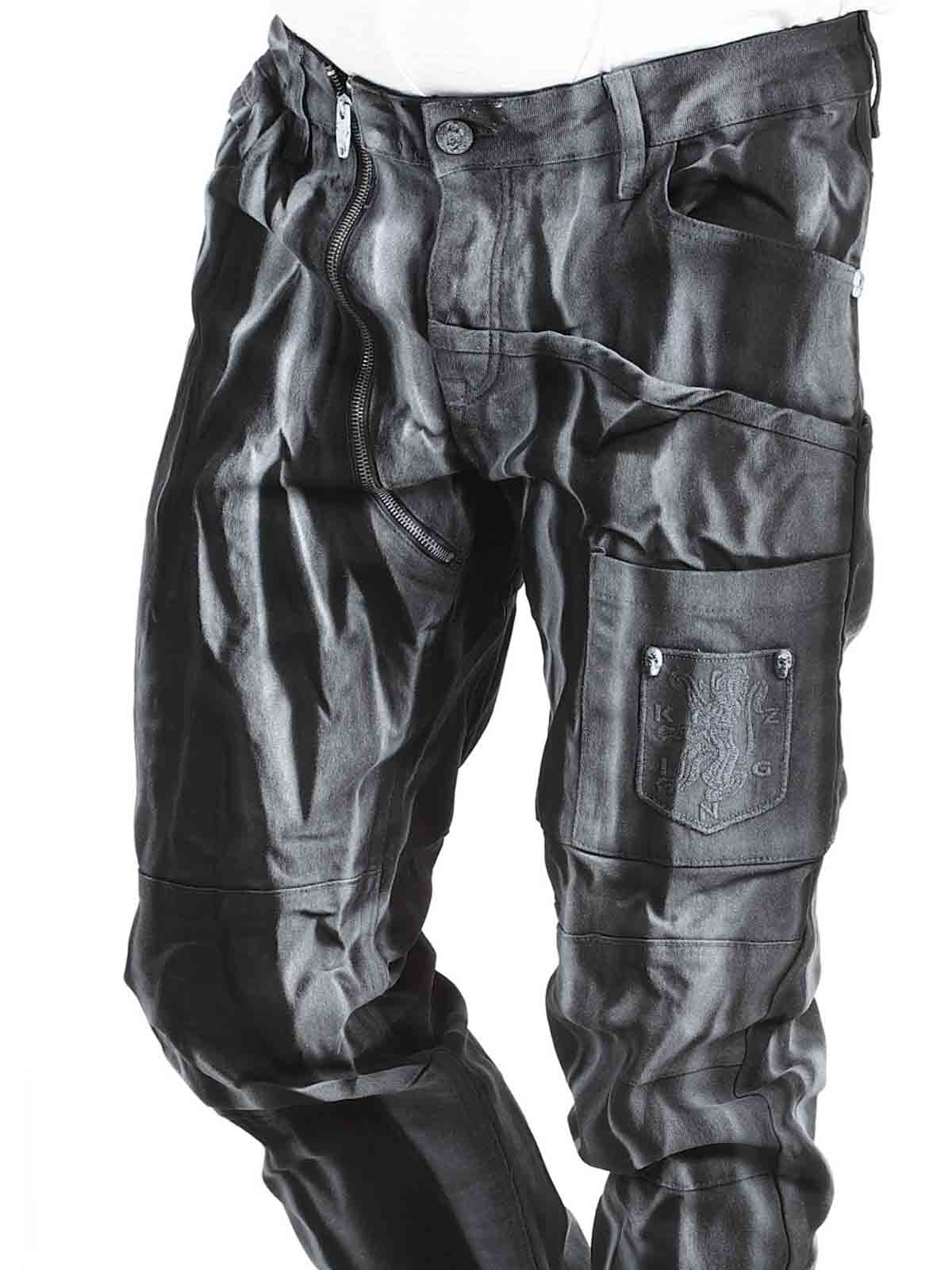 Jeans med stræk og remme i taljen til bæltet. De har detaljer som lommer med logobroderier og lynlåse som giver et cool look. Disse jeans kan lukkes ved hjælp af knapper i gylpen eller med en separat lynlås til venstre for knappen i taljen. Med disse Kingz-jeans er du klar til at gå alle udfordringer i møde med både stil og attitude.