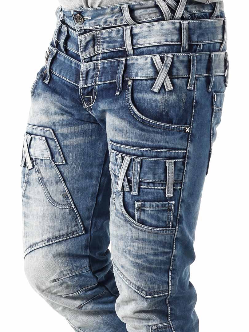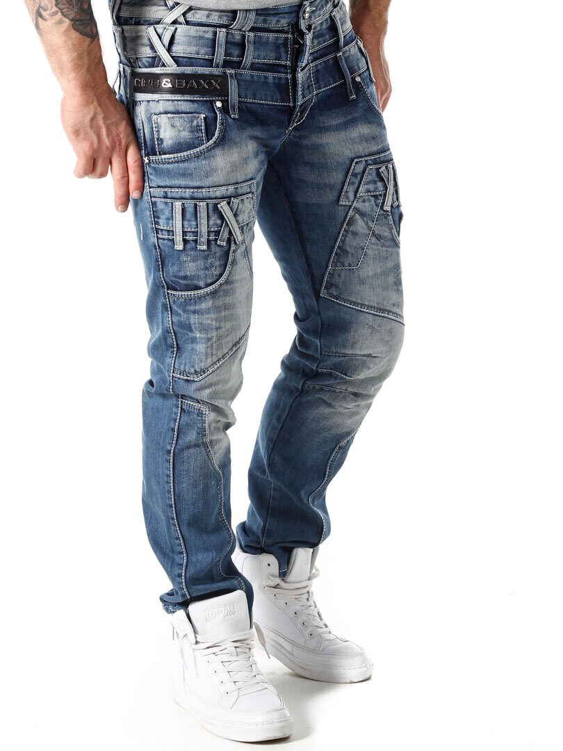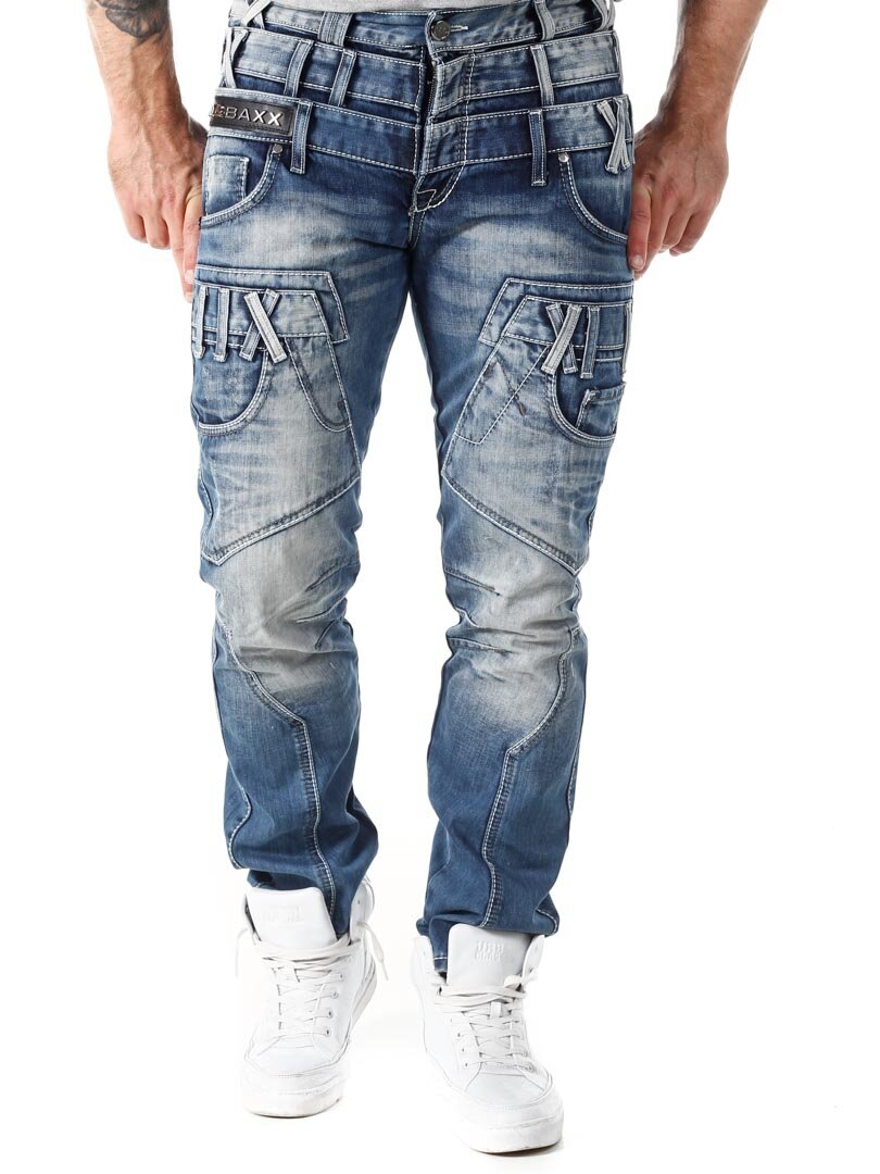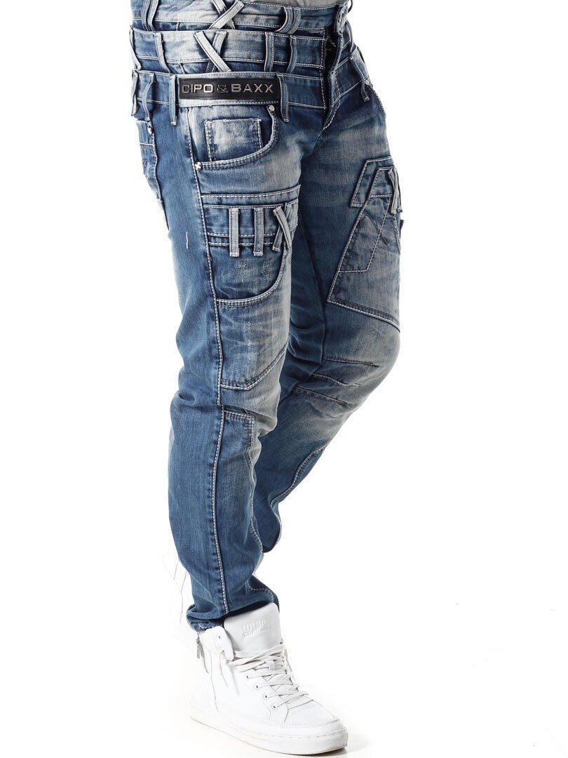 Blå bukser med lysere partier og slitage. Disse bukser er designede med detaljer som remme, lommer og fremstrædende sømme. Logoet ses tydeligt fortil.