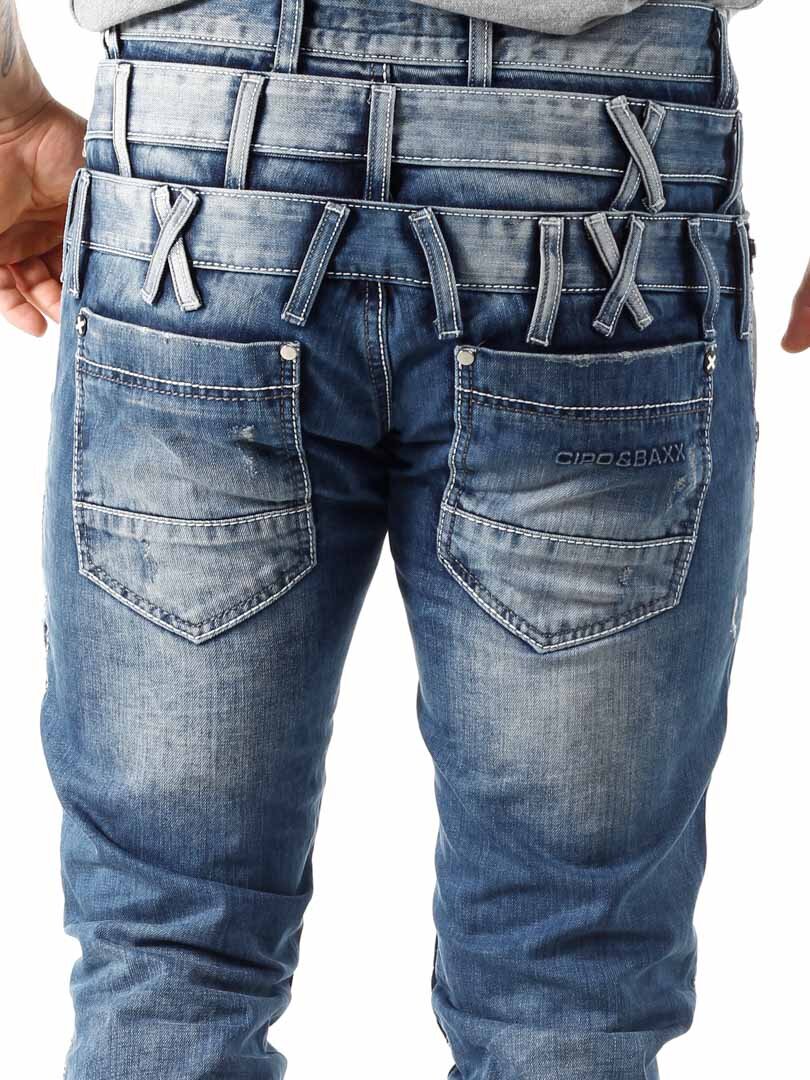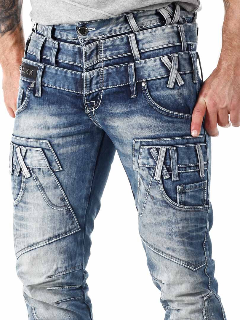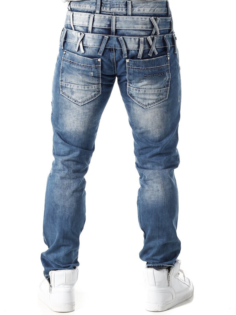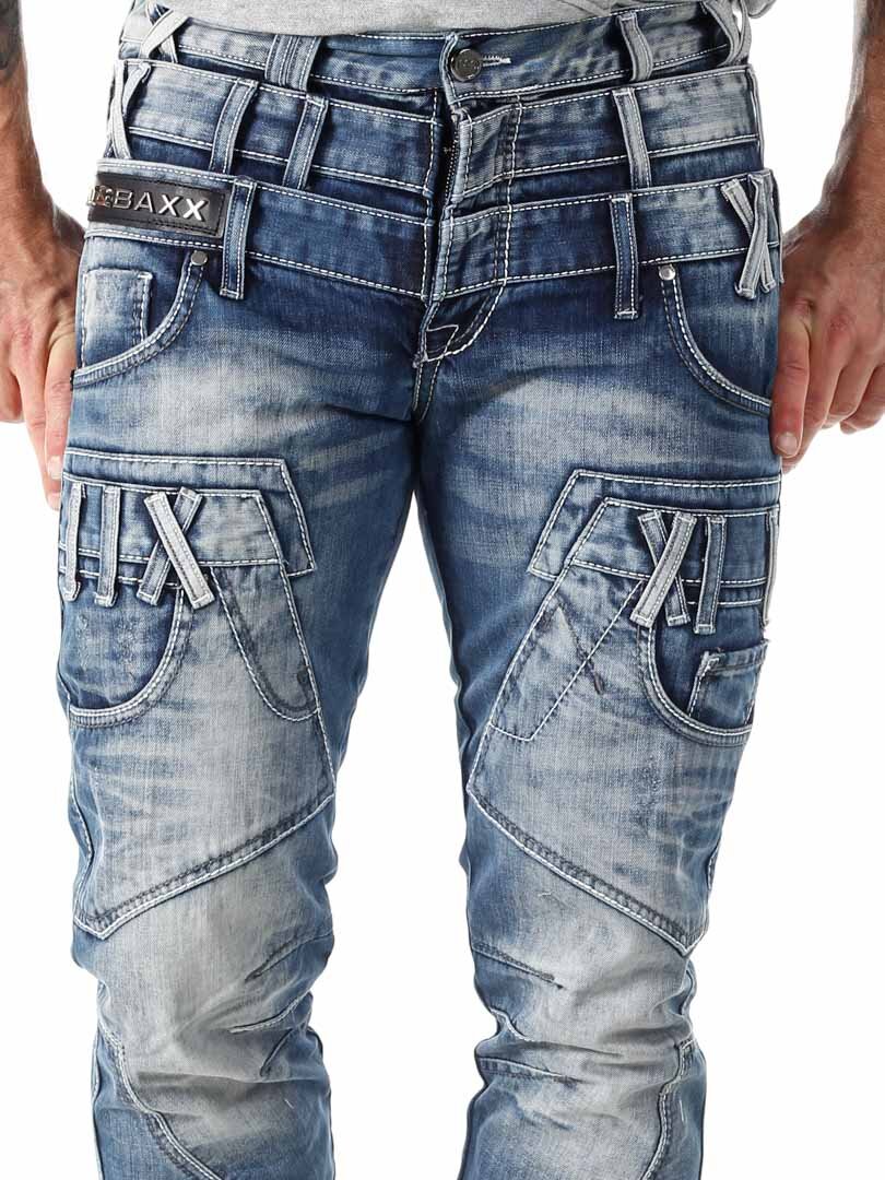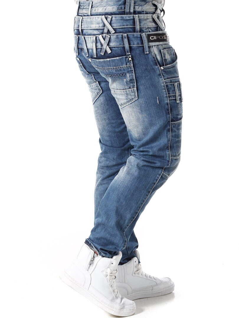Blå bukser med lysere partier og slitage. Disse bukser er designede med detaljer som remme, lommer og fremstrædende sømme. Logoet ses tydeligt fortil.