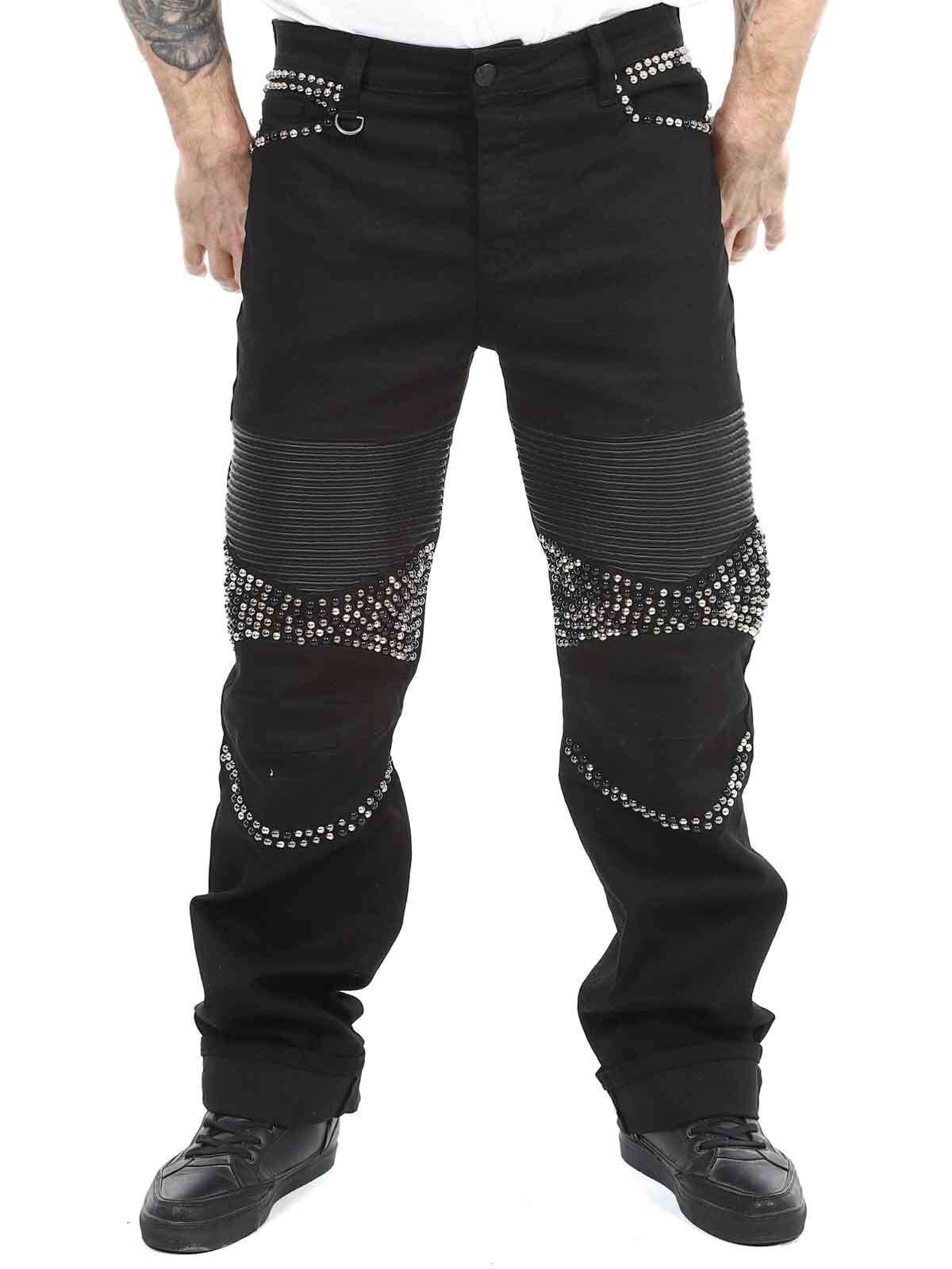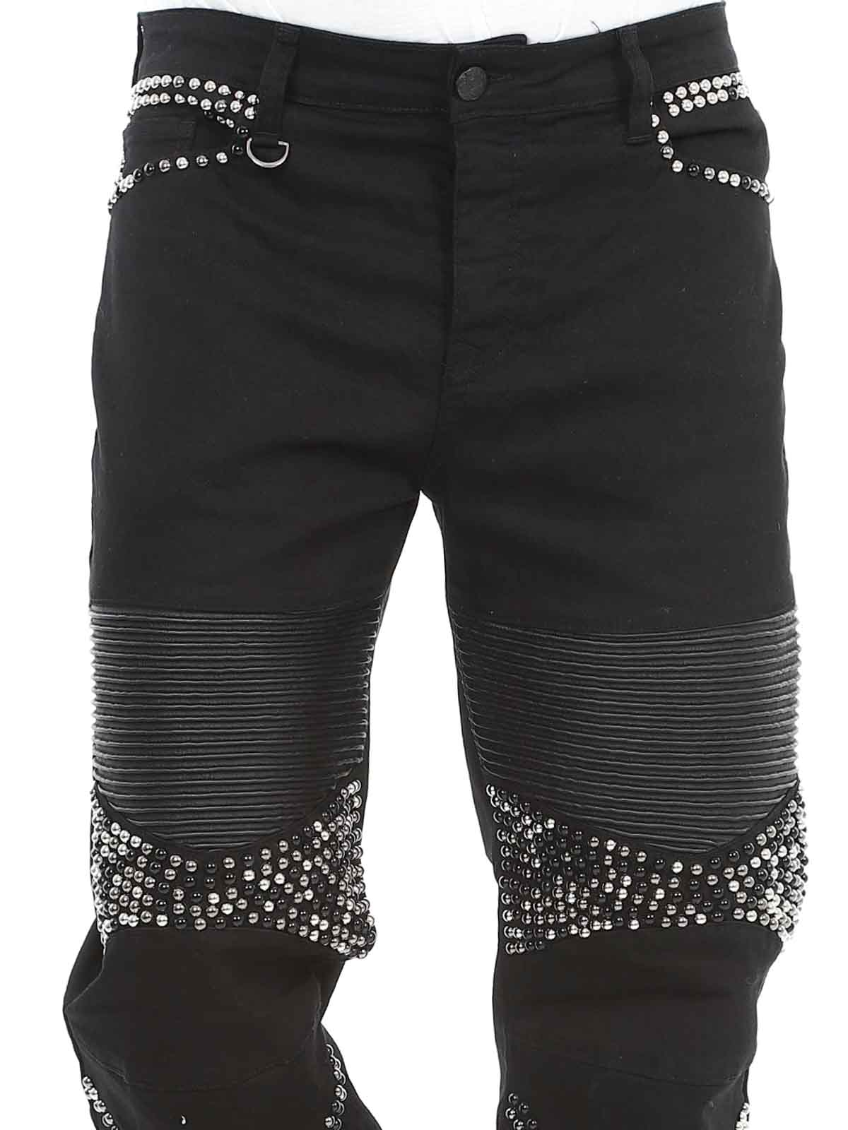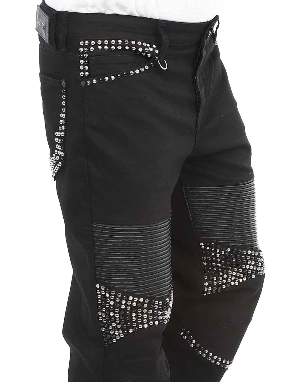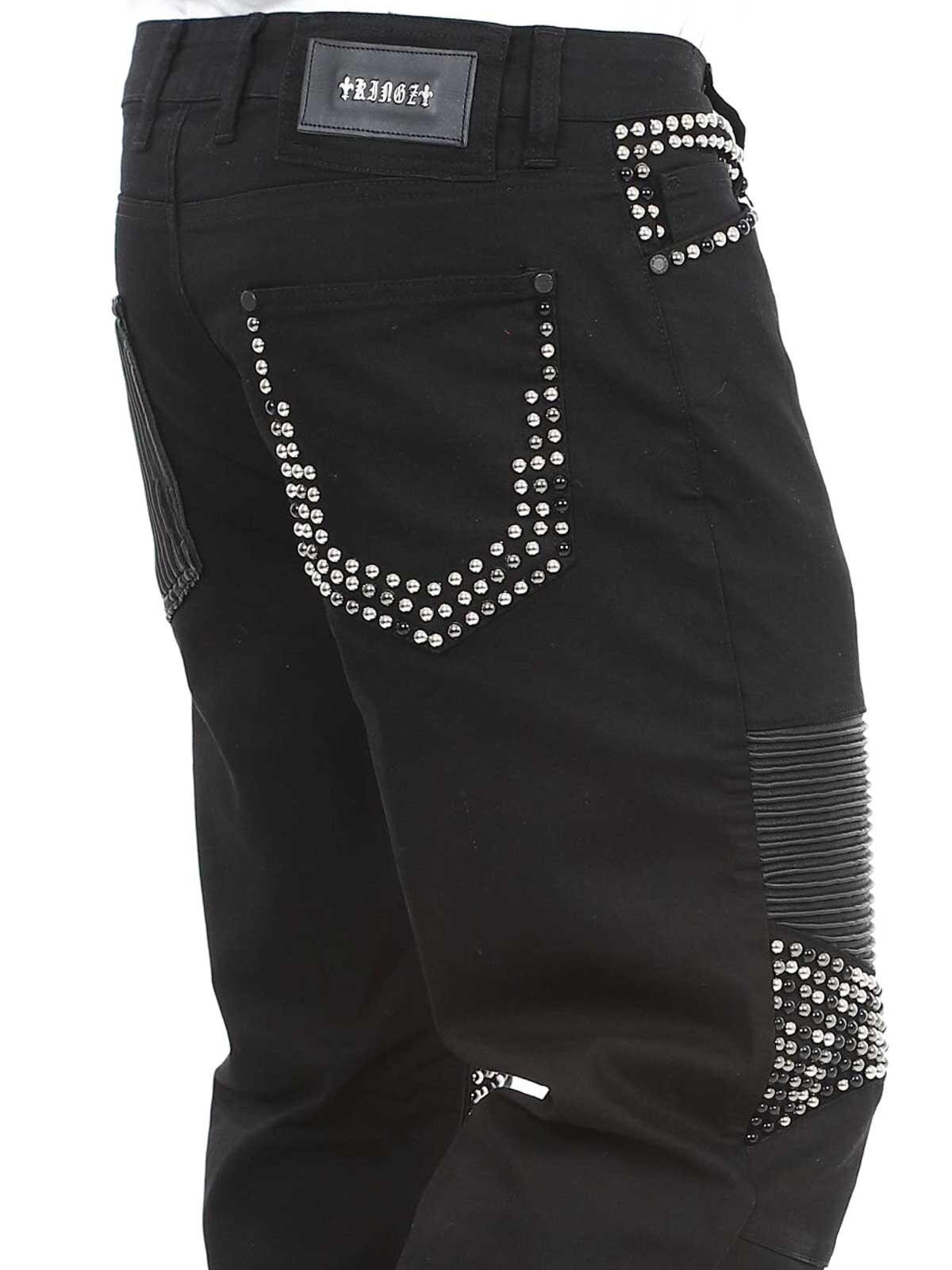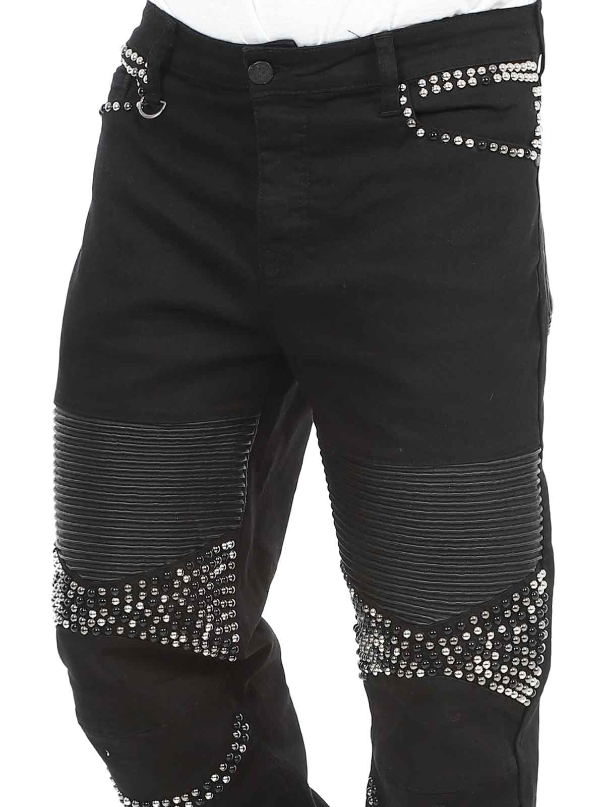 Behagelige jeans der er designede med nitter og en imitation af læder på lårene samt en lomme bagtil. De har fem lommer, stropper i taljen til bæltet og de lukkes ved hjælp af knapper i gylpen.