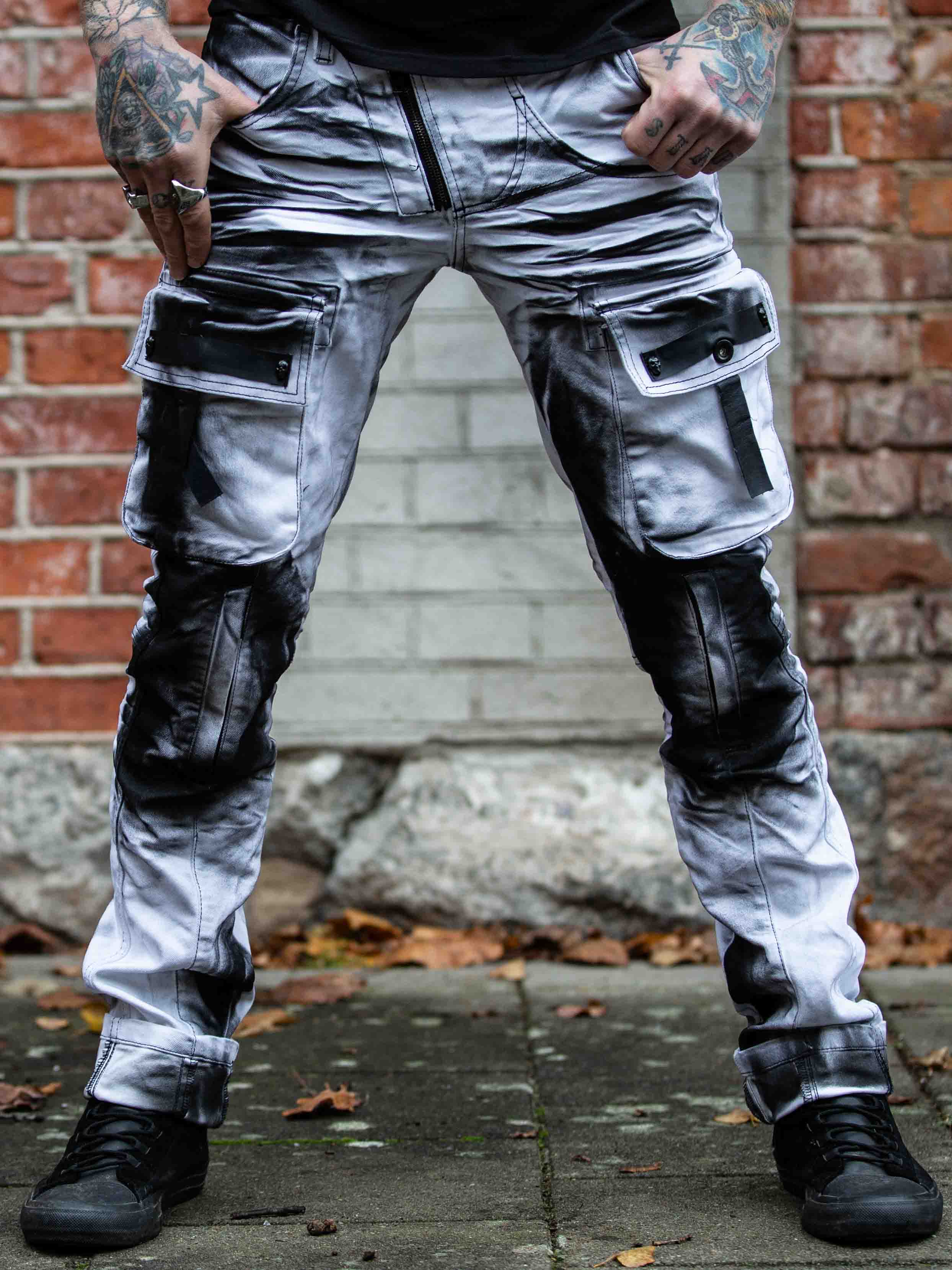Unikke jeans med flere lommer. De er cool detaljerede med nitter formet som dødningehoveder, remme i læder og lynlåse på knæene. Disse jeans lukkes ved hjælp af en lynlås i gylpen, og desuden har de remme, i taljen, til bæltet.