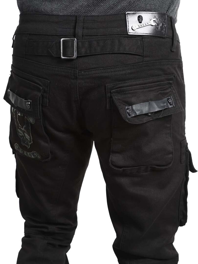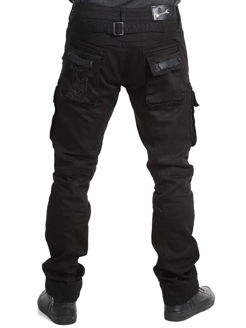 Unikke jeans med flere lommer. De er cool detaljerede med nitter formet som dødningehoveder, remme i læder og lynlåse på knæene. Disse jeans lukkes ved hjælp af en lynlås i gylpen, og desuden har de remme, i taljen, til bæltet.