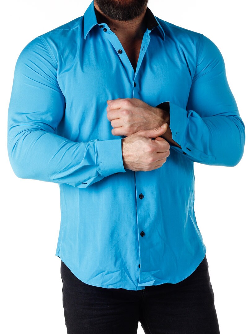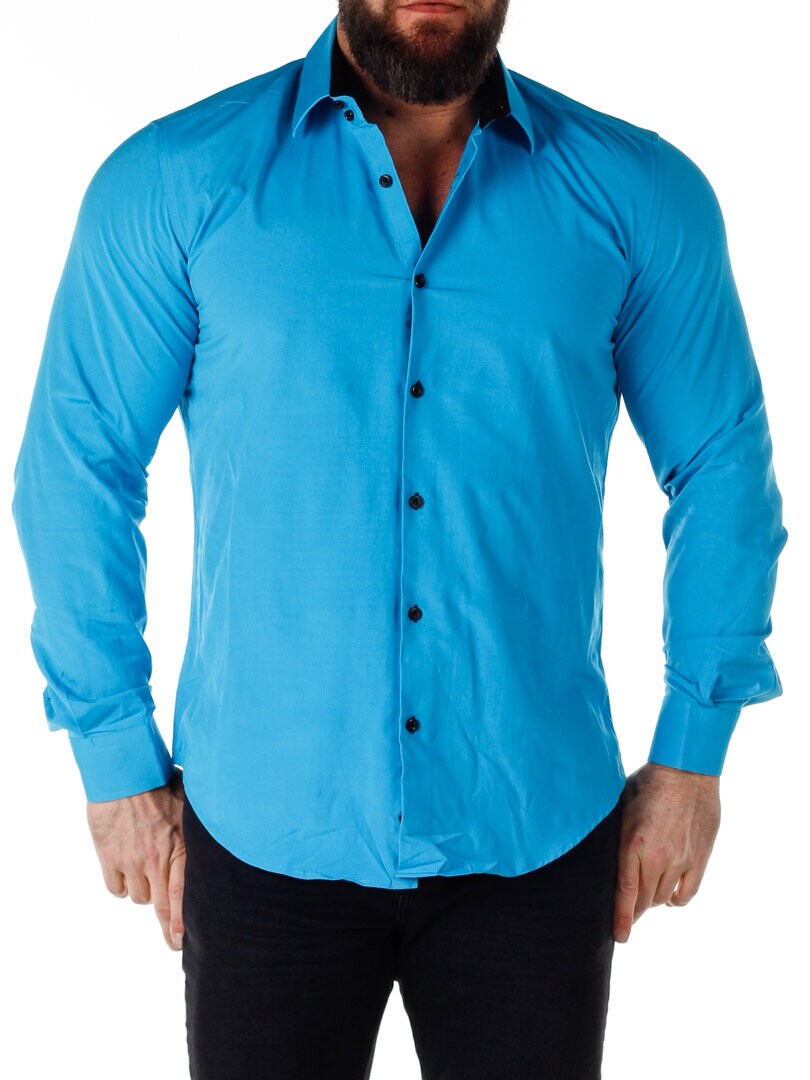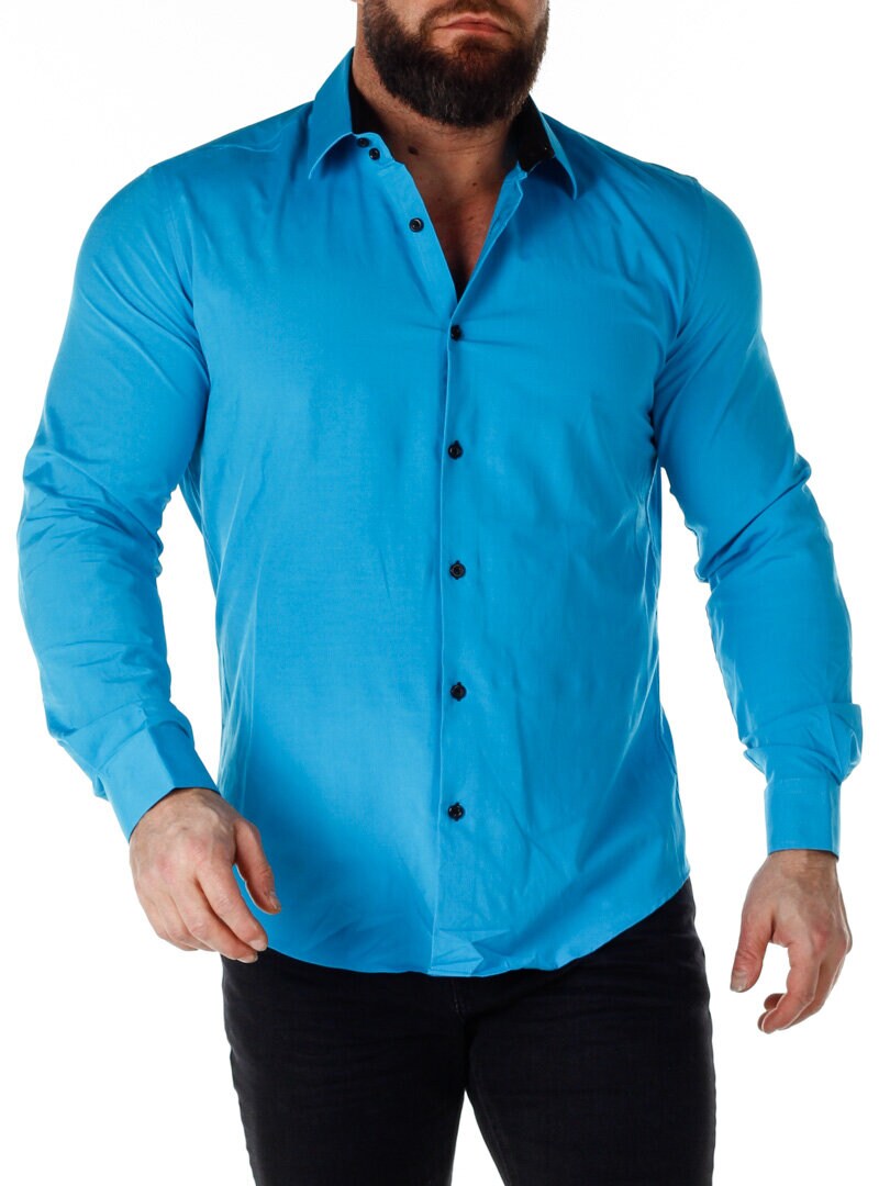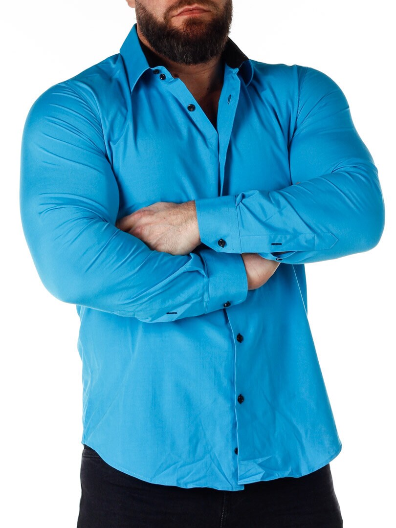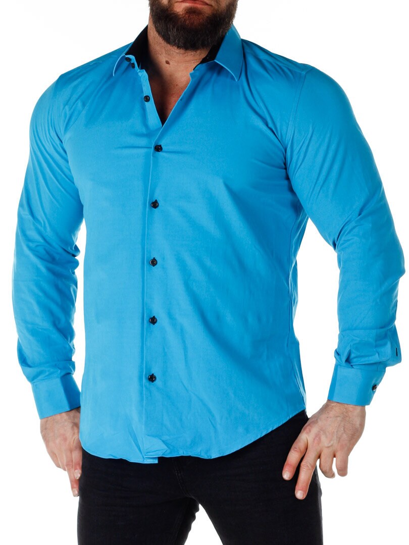 Turkis skjorte med sort bånd på innsiden av kragen. Sorte knapper i front og ytterst på ermene. Sort kontrastfarge på innsiden av ermene. Laget i en flott bomullsmiks med litt stretch. Finnes i flere farger!