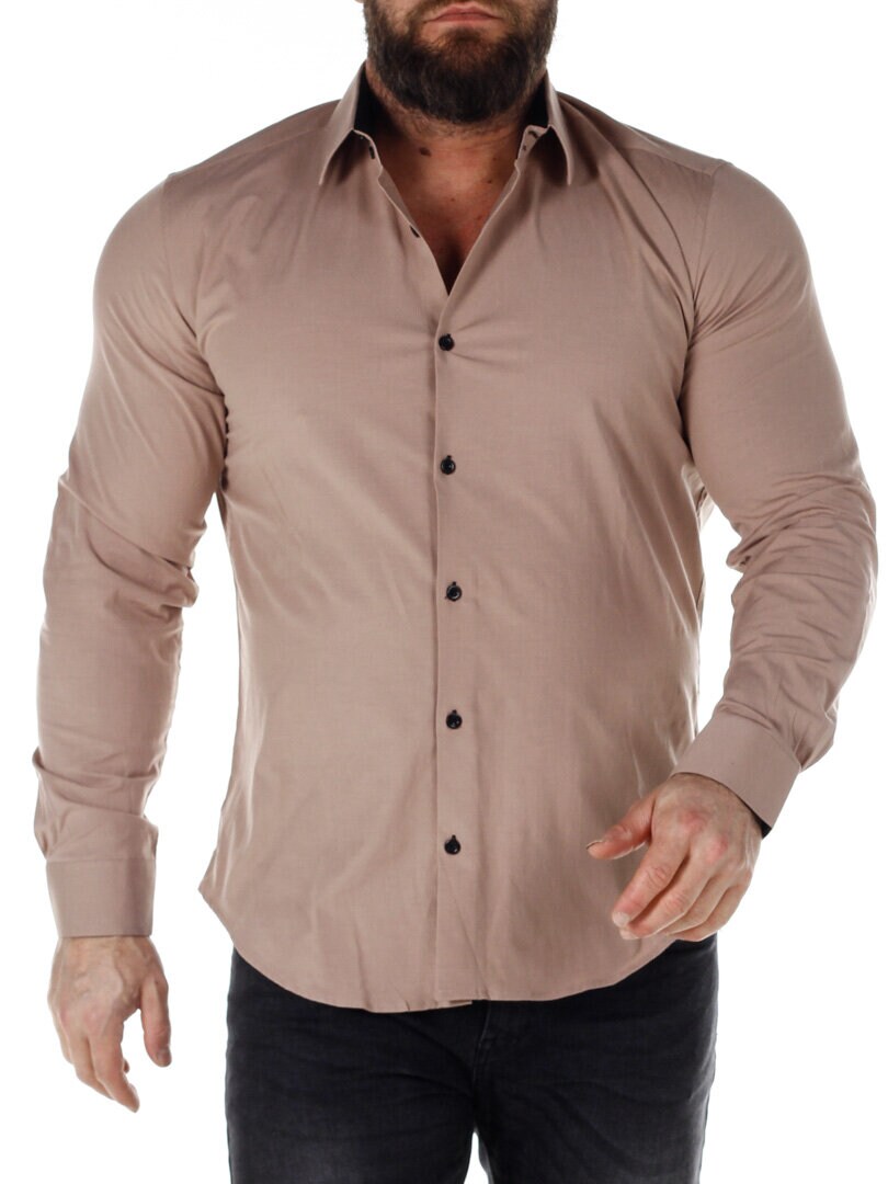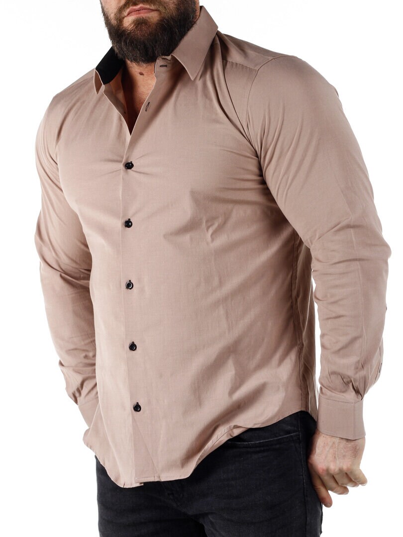 Bomuldsskjorte i en bekvem model, som er noget stretchig. Beige base med knapper, indvendig krave og enderne af ærmerne i en kontrastfarve. En smallere model med afrundet linning forneden og med forstærket krave, som holder formen. Findes i flere farver!