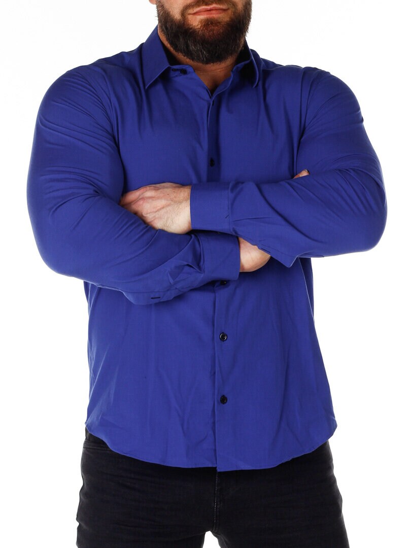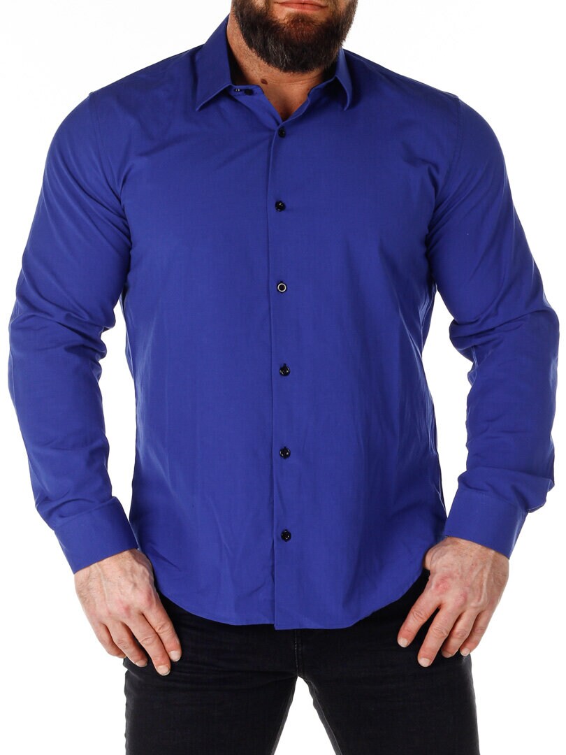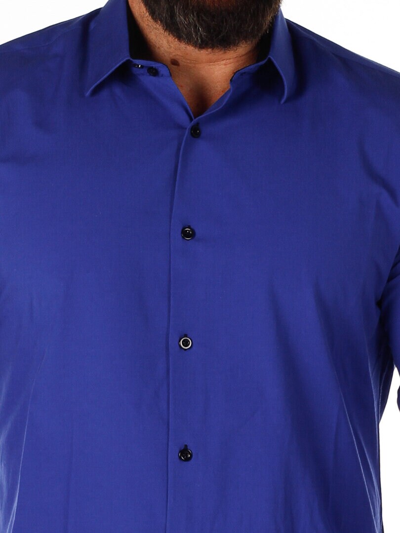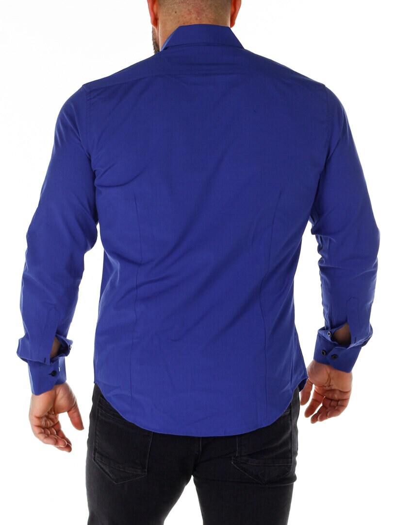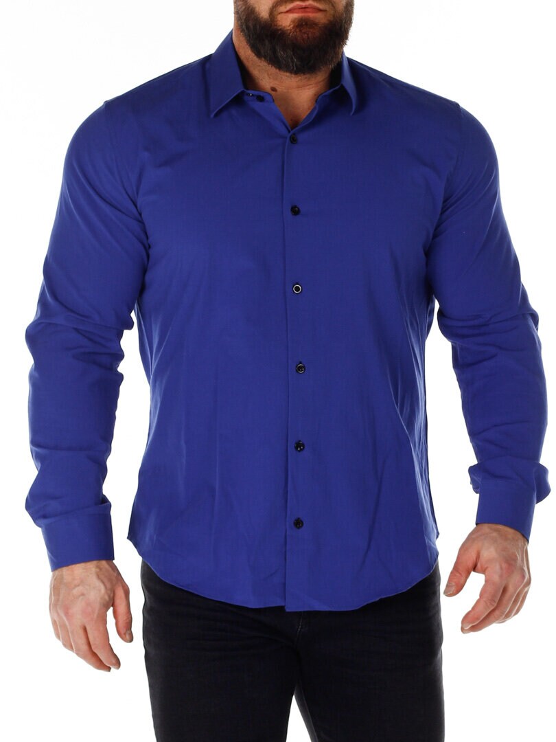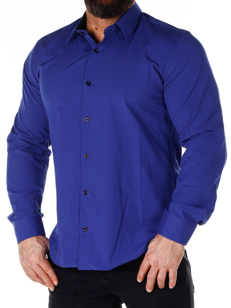 Bomuldsskjorte i en bekvem model, som er noget stretchig. Blå base med knapper, indvendig krave og enderne af ærmerne i en kontrastfarve. En smallere model med afrundet linning forneden og med forstærket krave, som holder formen. Findes i flere farver!