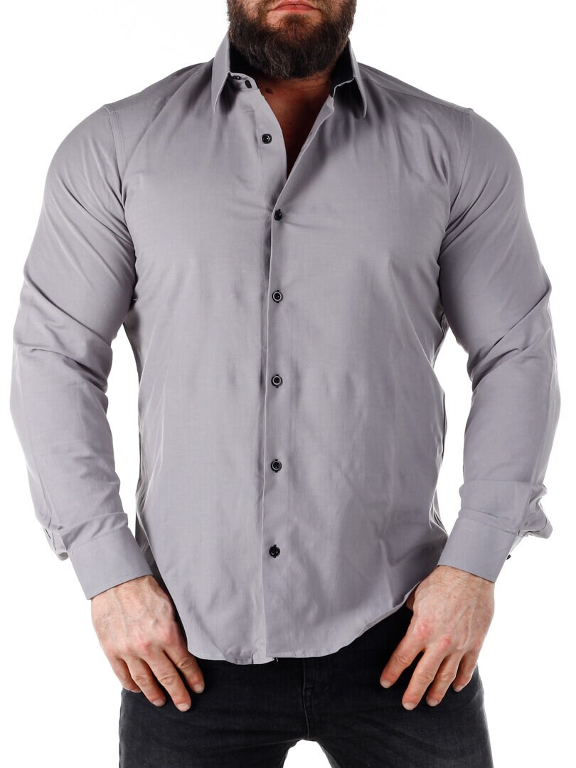 Bomuldsskjorte i en bekvem model, som er noget stretchig. Grå base med knapper, indvendig krave og enderne af ærmerne i en kontrastfarve. En smallere model med afrundet linning forneden og med forstærket krave, som holder formen. Findes i flere farver!