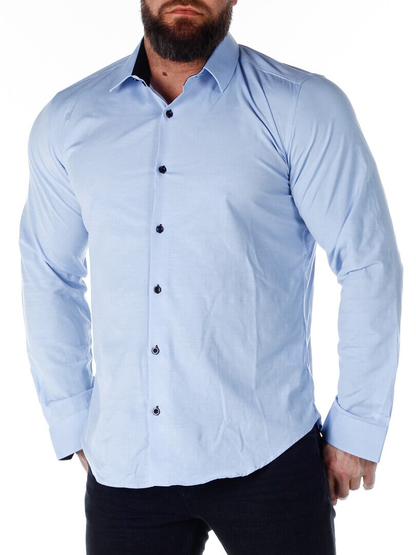 Bomuldsskjorte i en bekvem model, som er noget stretchig. Lyseblå base med knapper, indvendig krave og enderne af ærmerne i en kontrastfarve. En smallere model med afrundet linning forneden og med forstærket krave, som holder formen. Findes i flere farver!