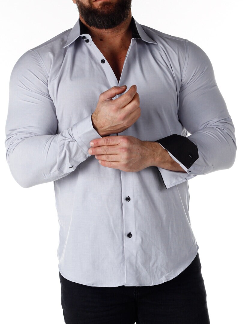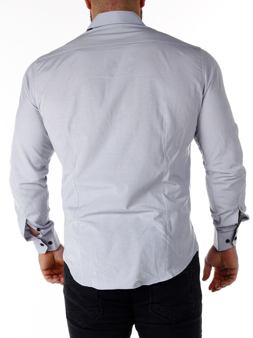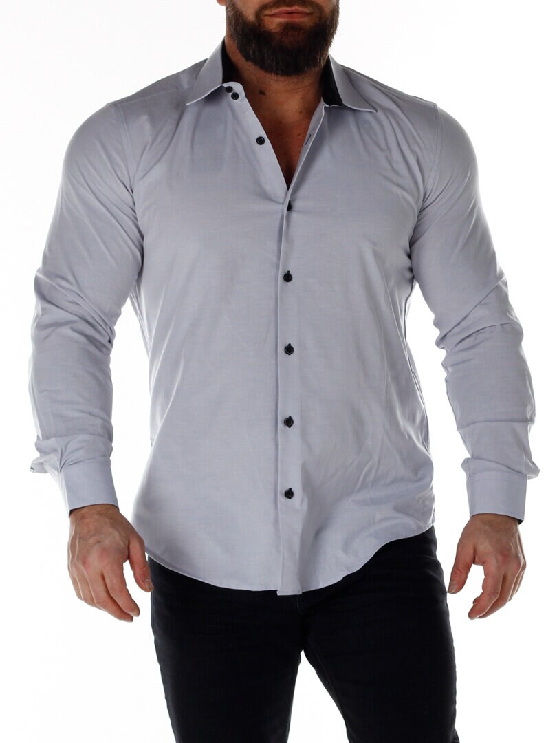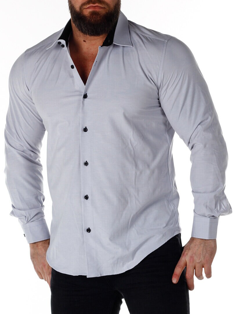 Bomuldsskjorte i en bekvem model, som er noget stretchig. Lysegrå base med knapper, indvendig krave og enderne af ærmerne i en kontrastfarve. En smallere model med afrundet linning forneden og med forstærket krave, som holder formen. Findes i flere farver!