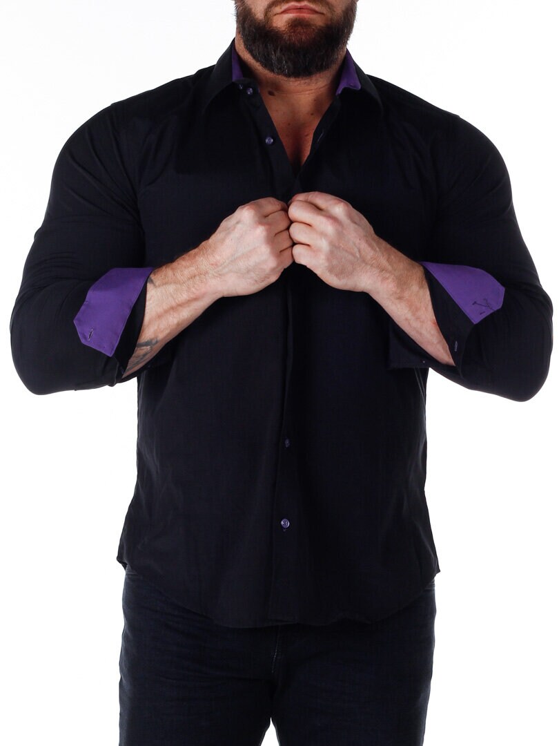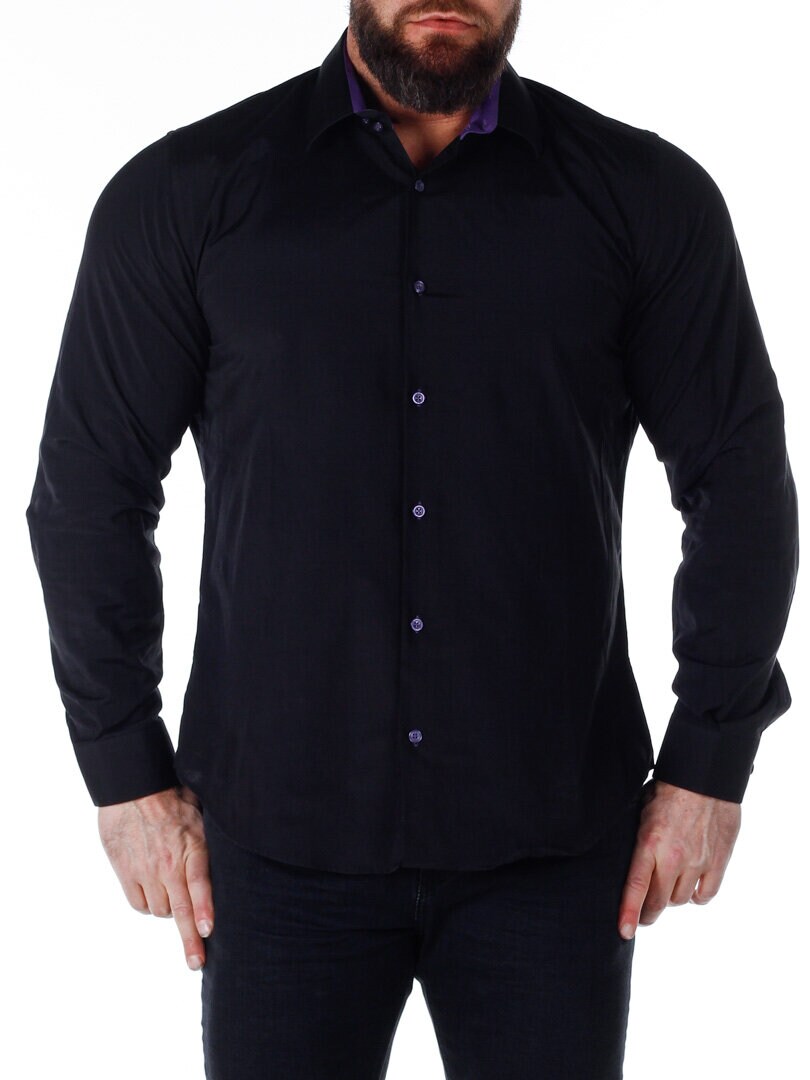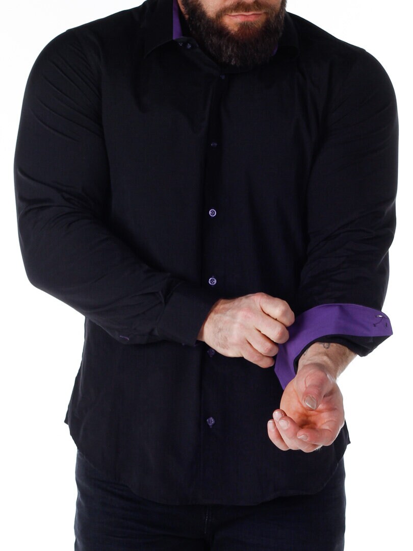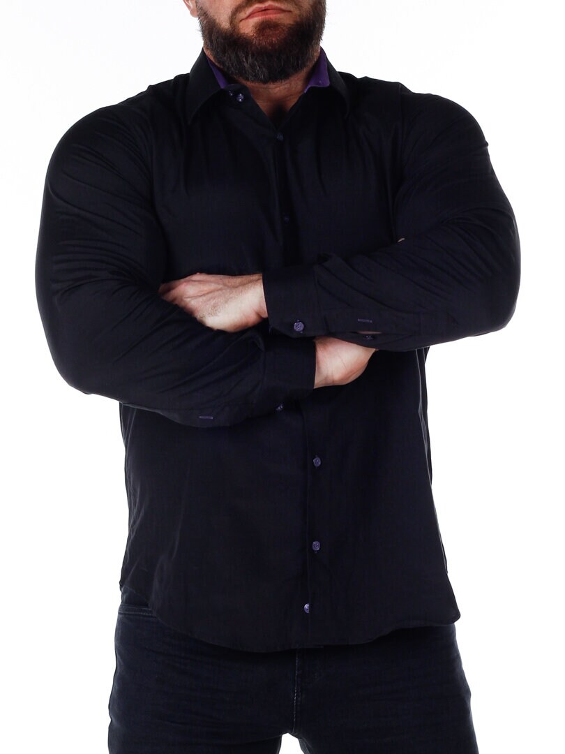 Bomuldsskjorte i en bekvem model, som er noget stretchig. Sort base med knapper, indvendig krave og enderne af ærmerne i en kontrastfarve. En smallere model med afrundet linning forneden og med forstærket krave, som holder formen. Findes i flere farver!