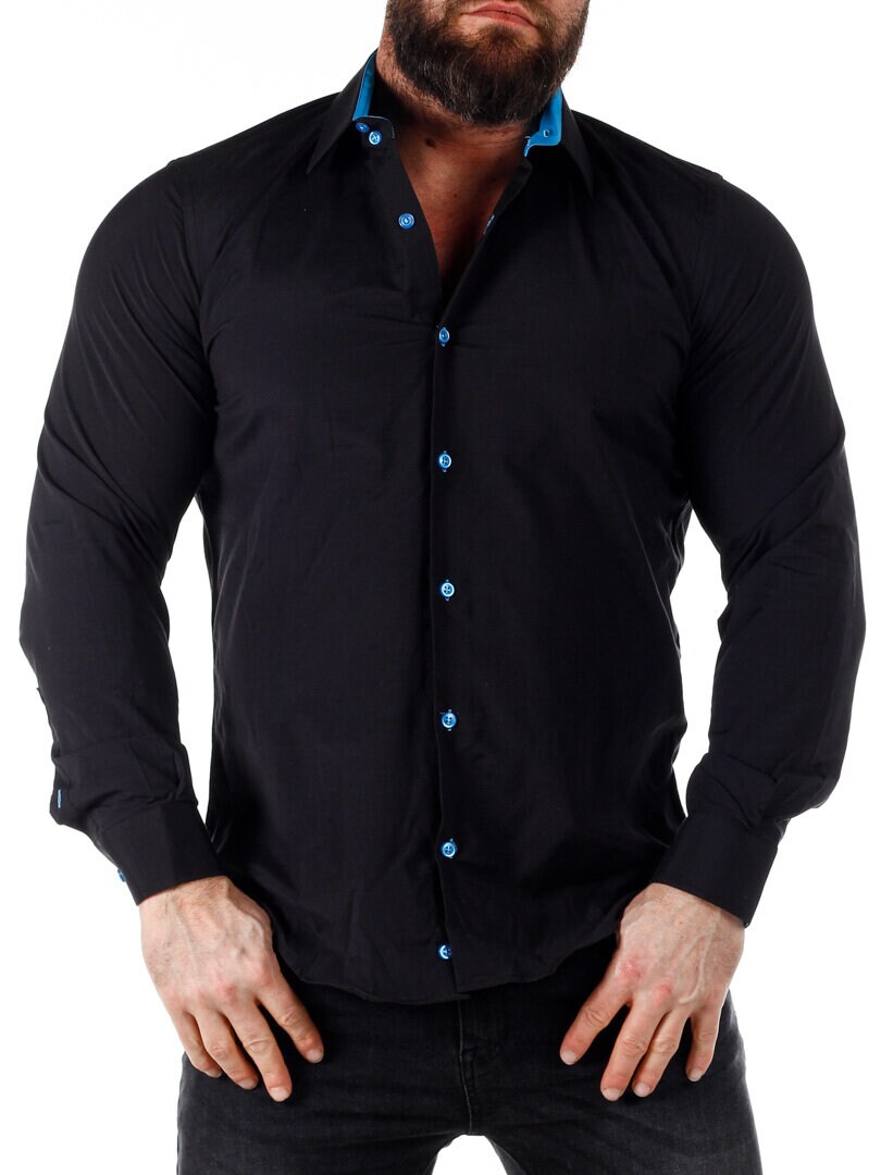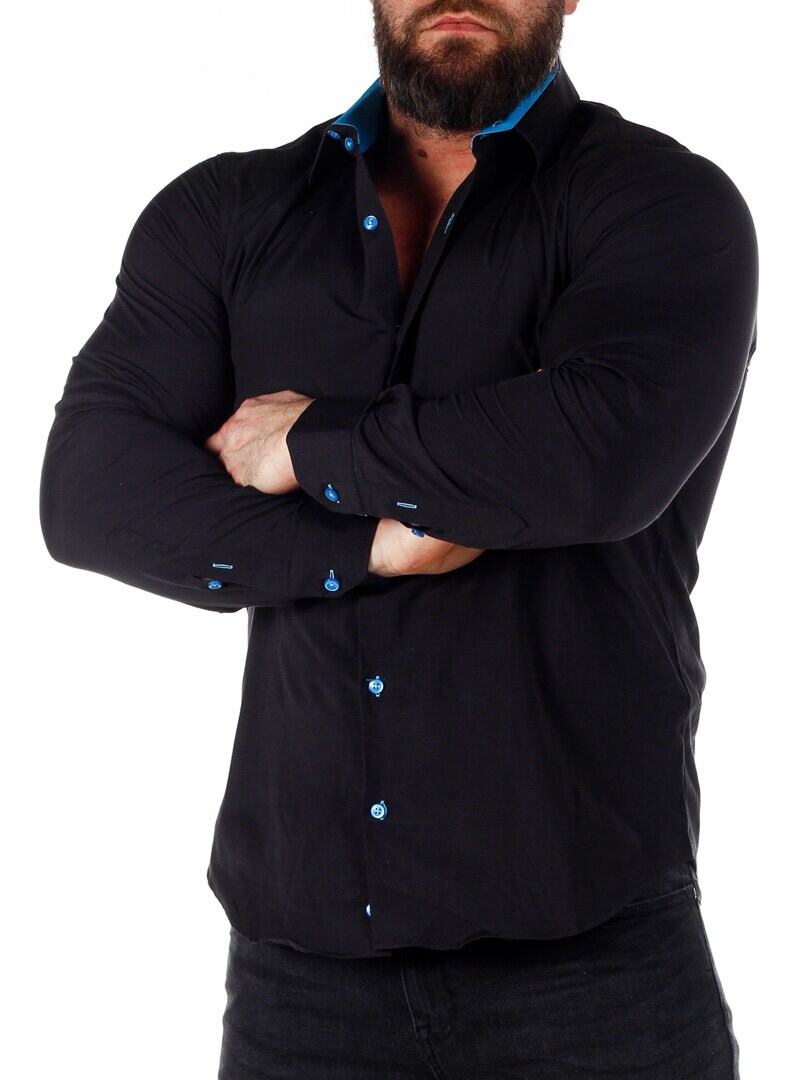 Bomuldsskjorte i en bekvem model, som er noget stretchig. Sort base med knapper, indvendig krave og enderne af ærmerne i en kontrastfarve. En smallere model med afrundet linning forneden og med forstærket krave, som holder formen. Findes i flere farver!