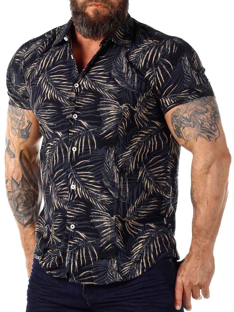 Kortærmet skjorte med bladmotiv. Den har knapper fortil, en krave og en afrundet linning forneden. Dette er en kølig skjorte, der passer godt under den varme del af sæsonen!