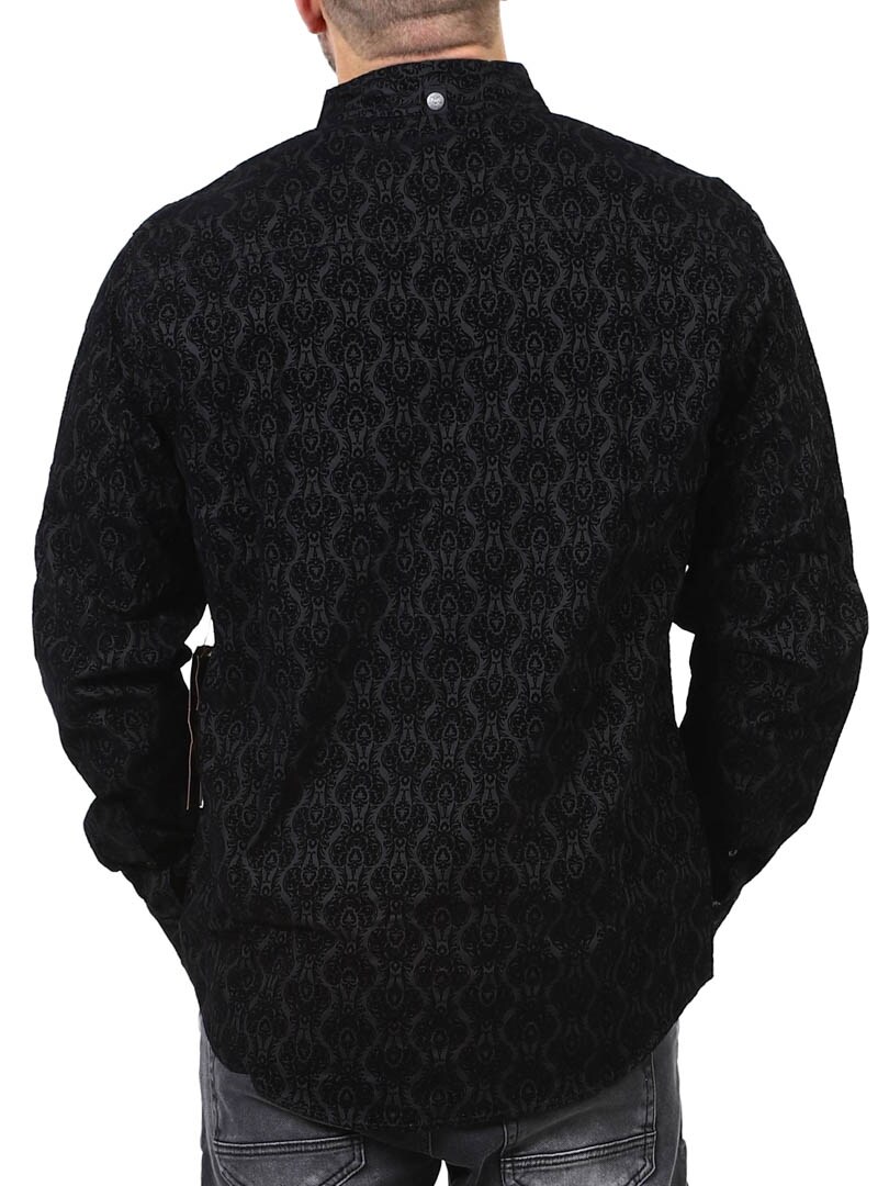 Denne premiumskjorte fra Rocknrolla Collection kombinerer mørk elegance med ren attitude. Den er fremstillet af 100% blød, forvasket bomuld og udmærker sig med et sort-på-sort brokademønster i flocket fløjl, som giver en ophøjet struktur. Skjorten er fuld af gennemtænkte detaljer som knapper i ældet metal med dødningehovedmotiv og et kontrasterende stof med dødningehovedroser på indersiden af krave og manchetter. Med sin moderne, smallere pasform sidder den flot på kroppen.
