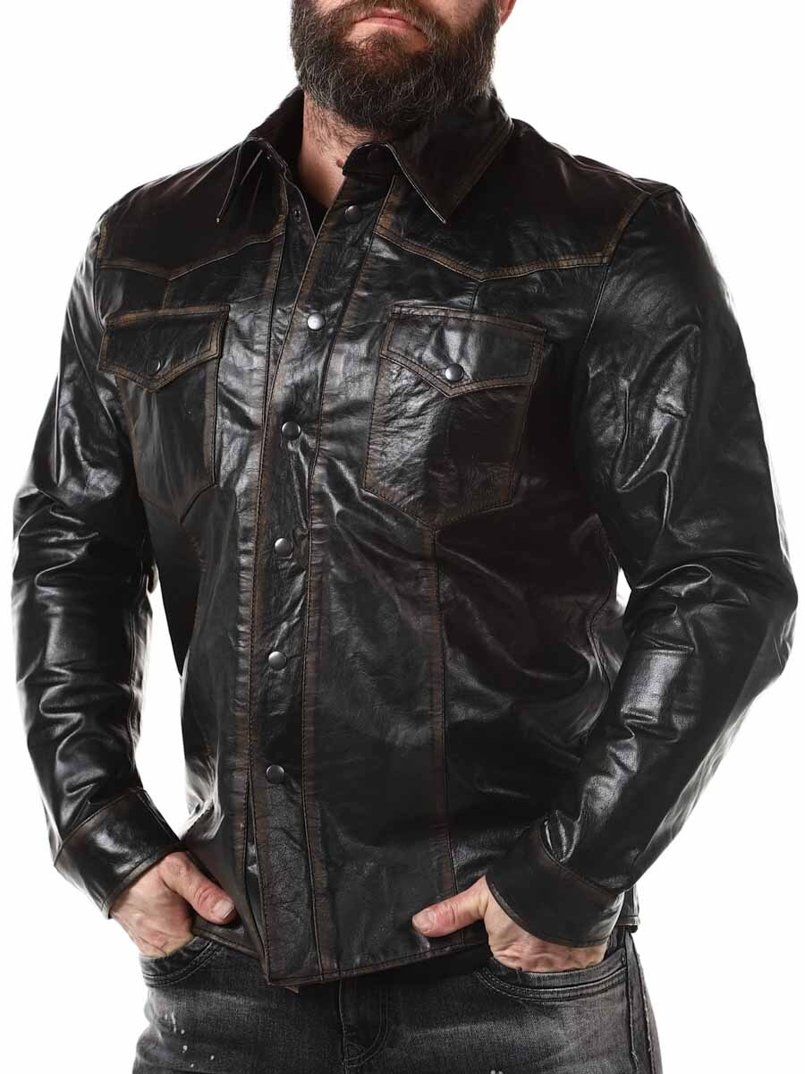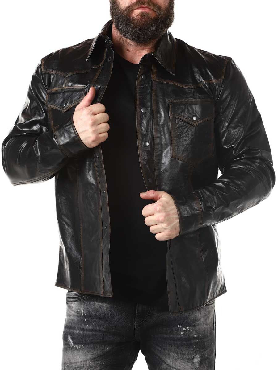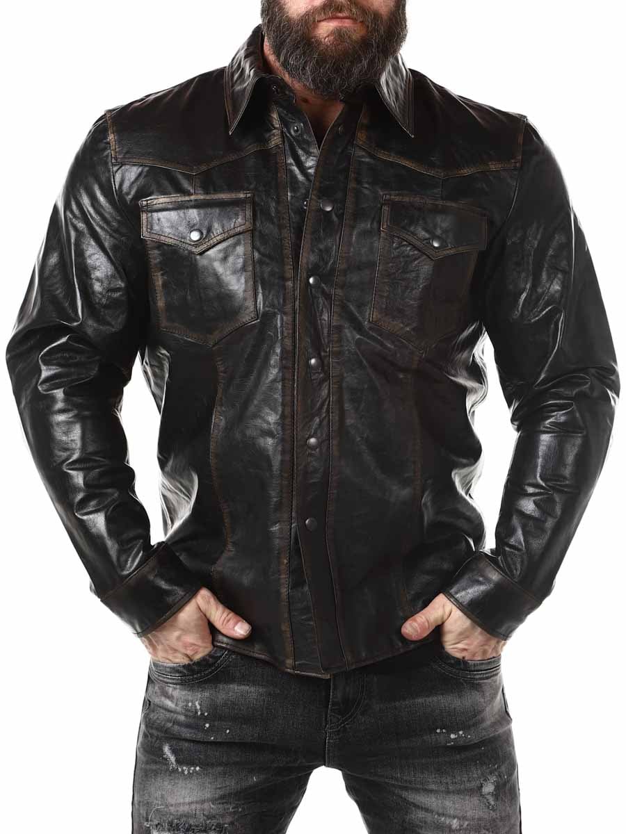 Skjorte i 100 % bøffellæder, fabrikeret i en vintage stil for en mere autentisk følelse. Den er designet med trykknapper, to lommer fortil på brystet og to lommer indvendigt. Denne elegante top kan bruges som både skjorte og jakke!