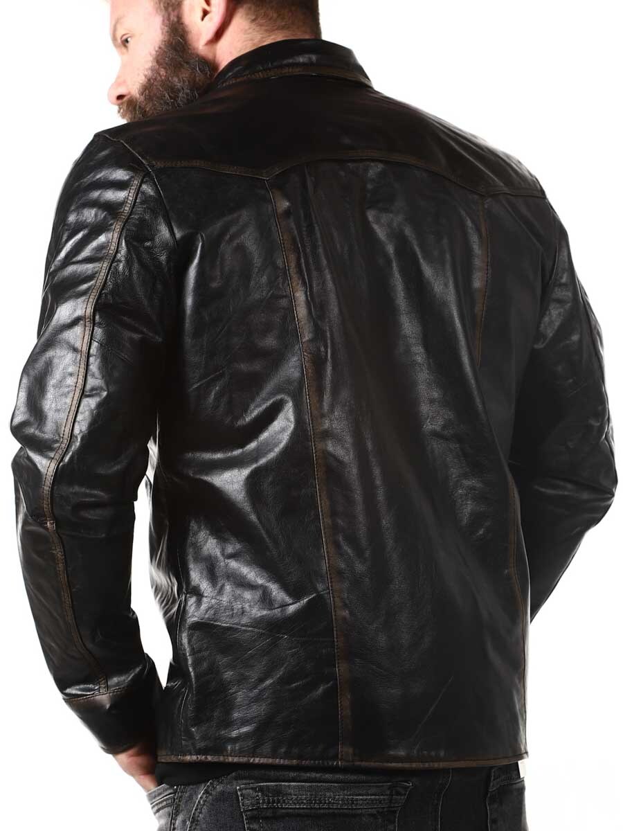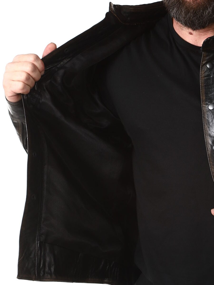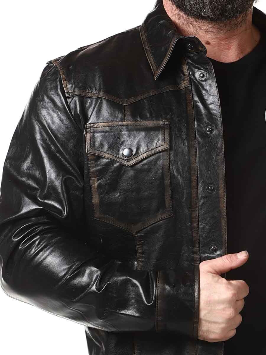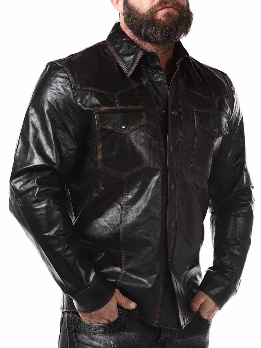 Skjorte i 100 % bøffellæder, fabrikeret i en vintage stil for en mere autentisk følelse. Den er designet med trykknapper, to lommer fortil på brystet og to lommer indvendigt. Denne elegante top kan bruges som både skjorte og jakke!
