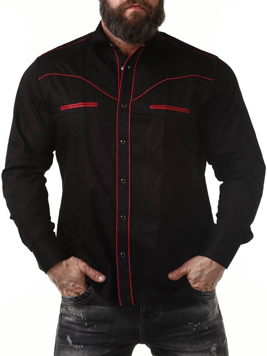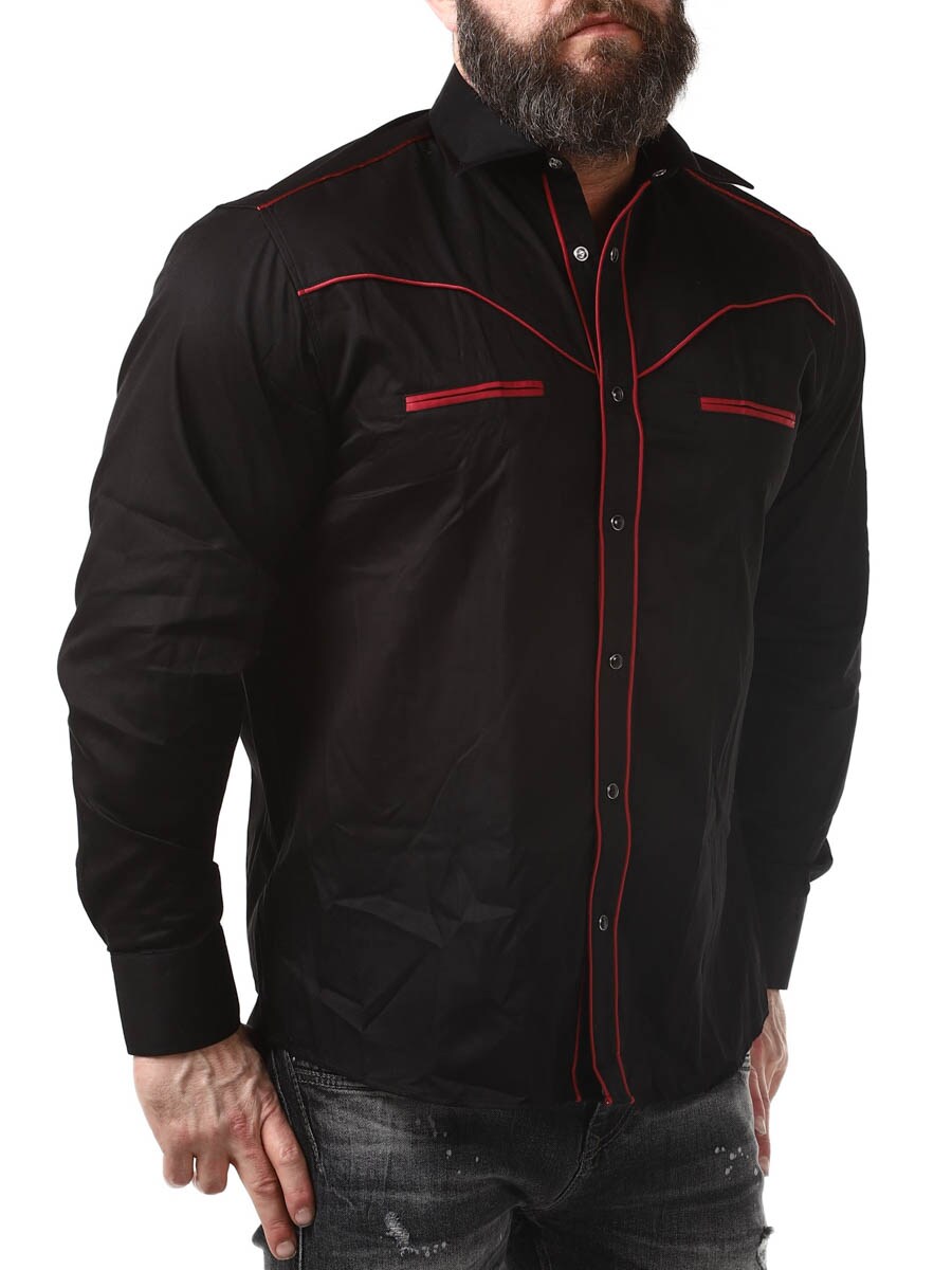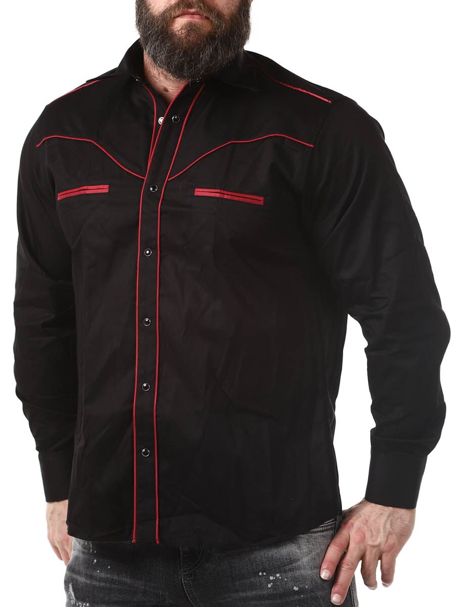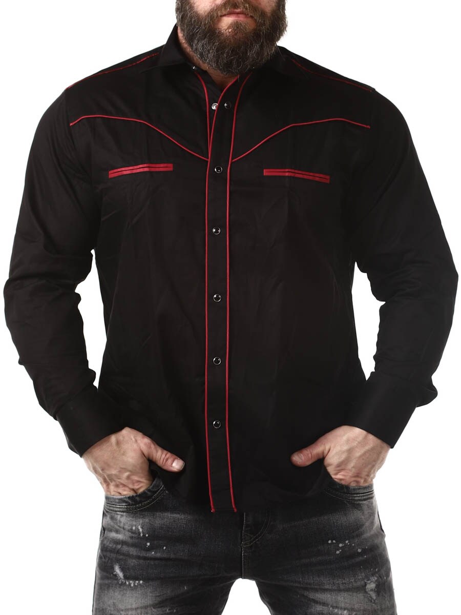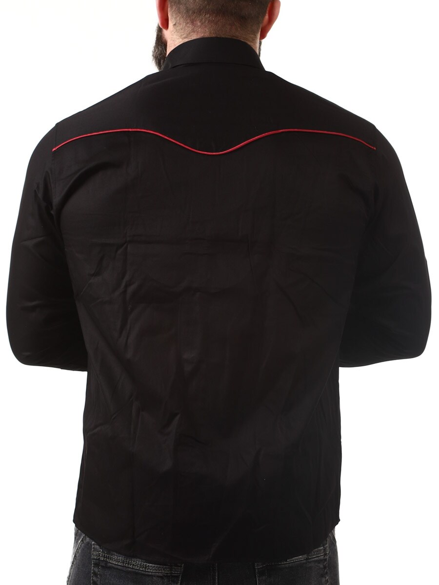 Sort skjorte med kontrastsyninger, der giver et stilrent western-look. Den er sesignet med trykknapper, to snydelommer der findes fortil og en afrundet linning for enden. Skjorten er fremstillet af 100 % bomuld.
