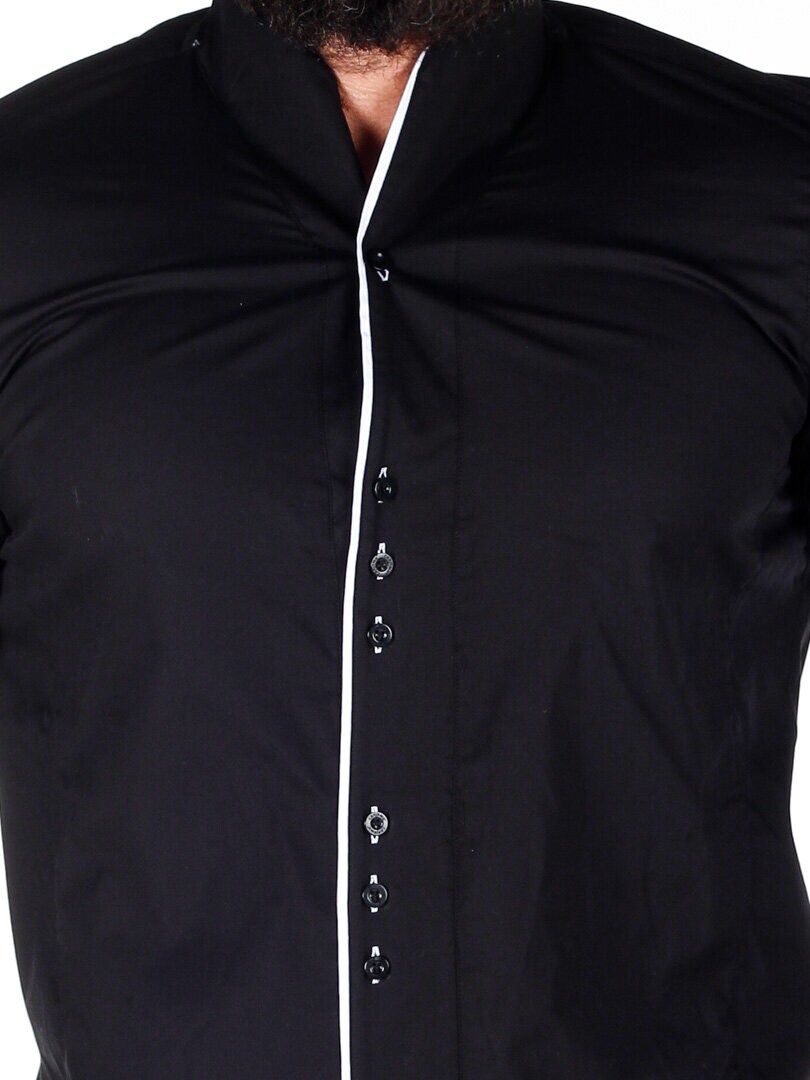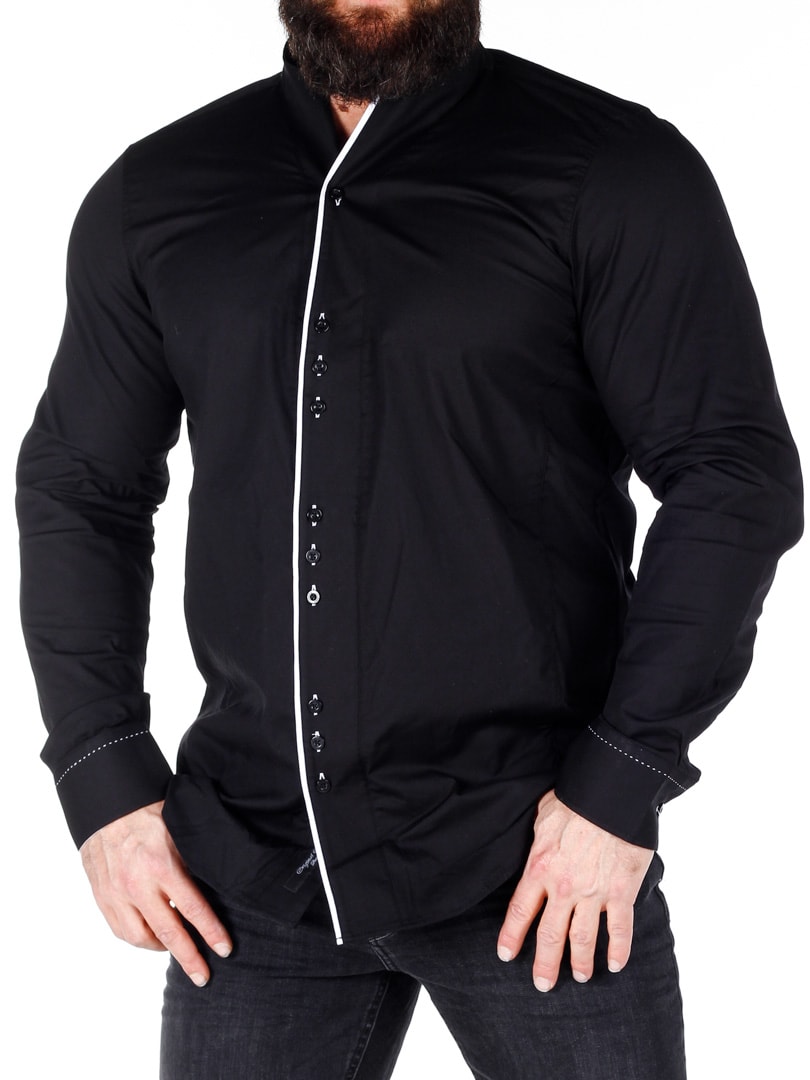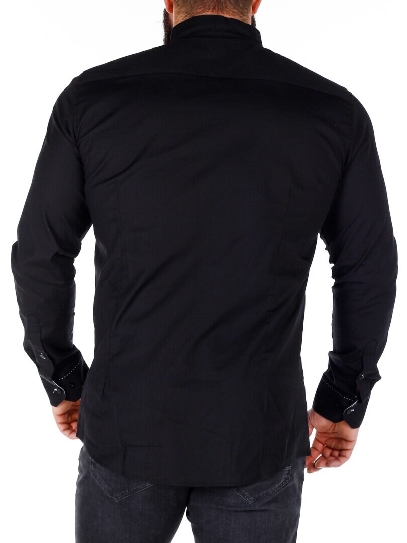 Elegant skjorte i et sort design, der udfordrer den klassiske stil. Den er fremstillet i et blødt bomuldsmateriale, der er noget elastisk, og som har sorte knapper og en slank pasform. Den har hvide kontrastdetaljer, som giver en flot effekt til den sorte base.