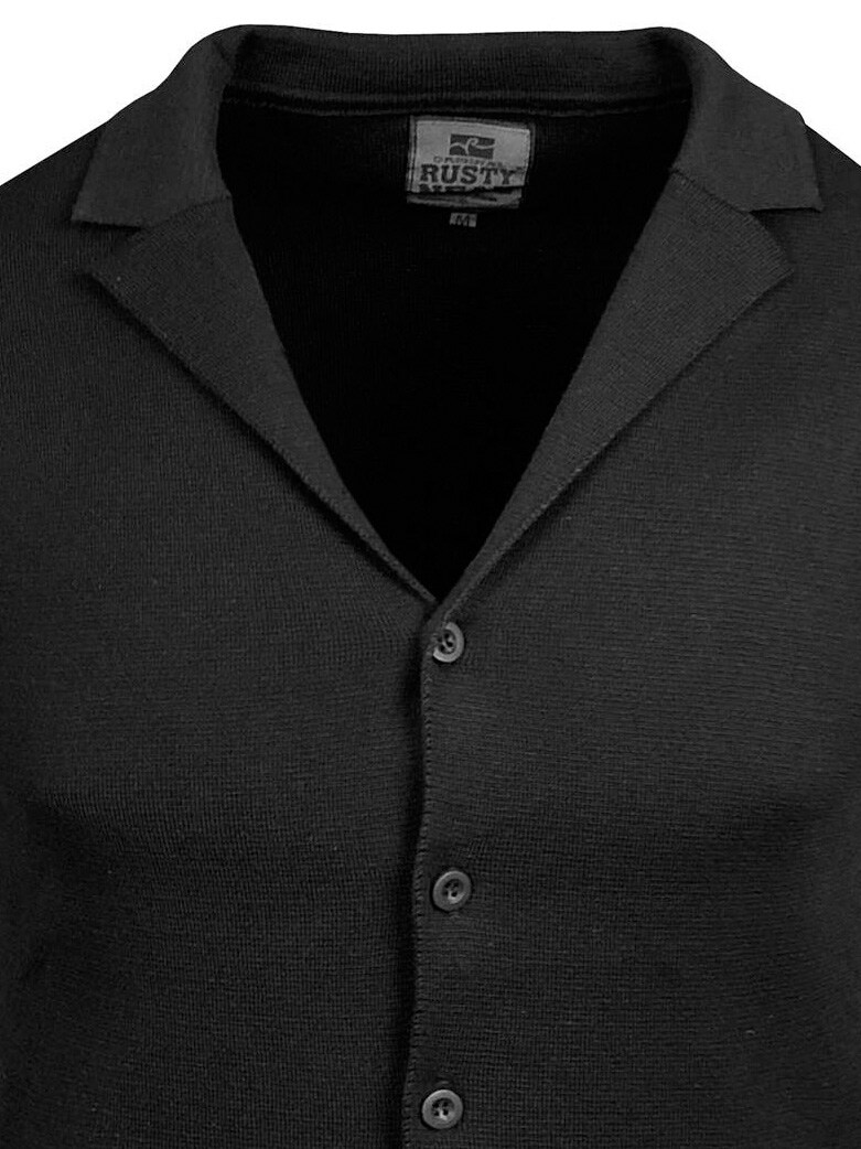 Sort vest i en strikket bomuldsblanding med en v-udskæring samt krave. Dette er en elastisk model med ribbede kanter som lukkes ved hjælp af knapper. Vesten er stilren og ensfarvet, hvilket gør den let at kombinere med andre beklædningsgenstande.