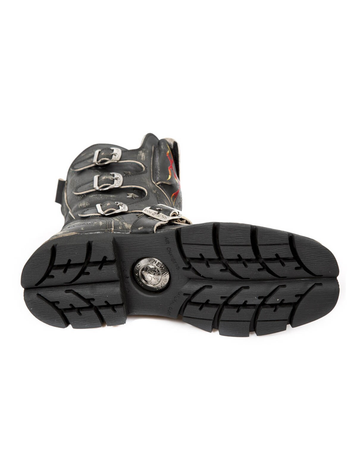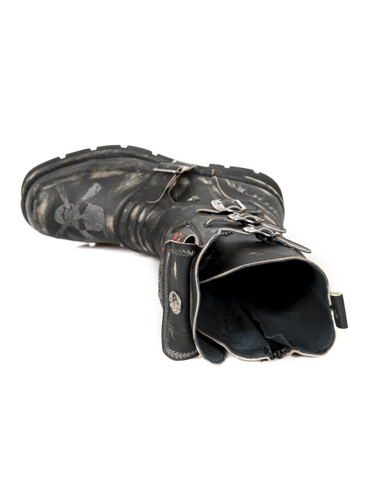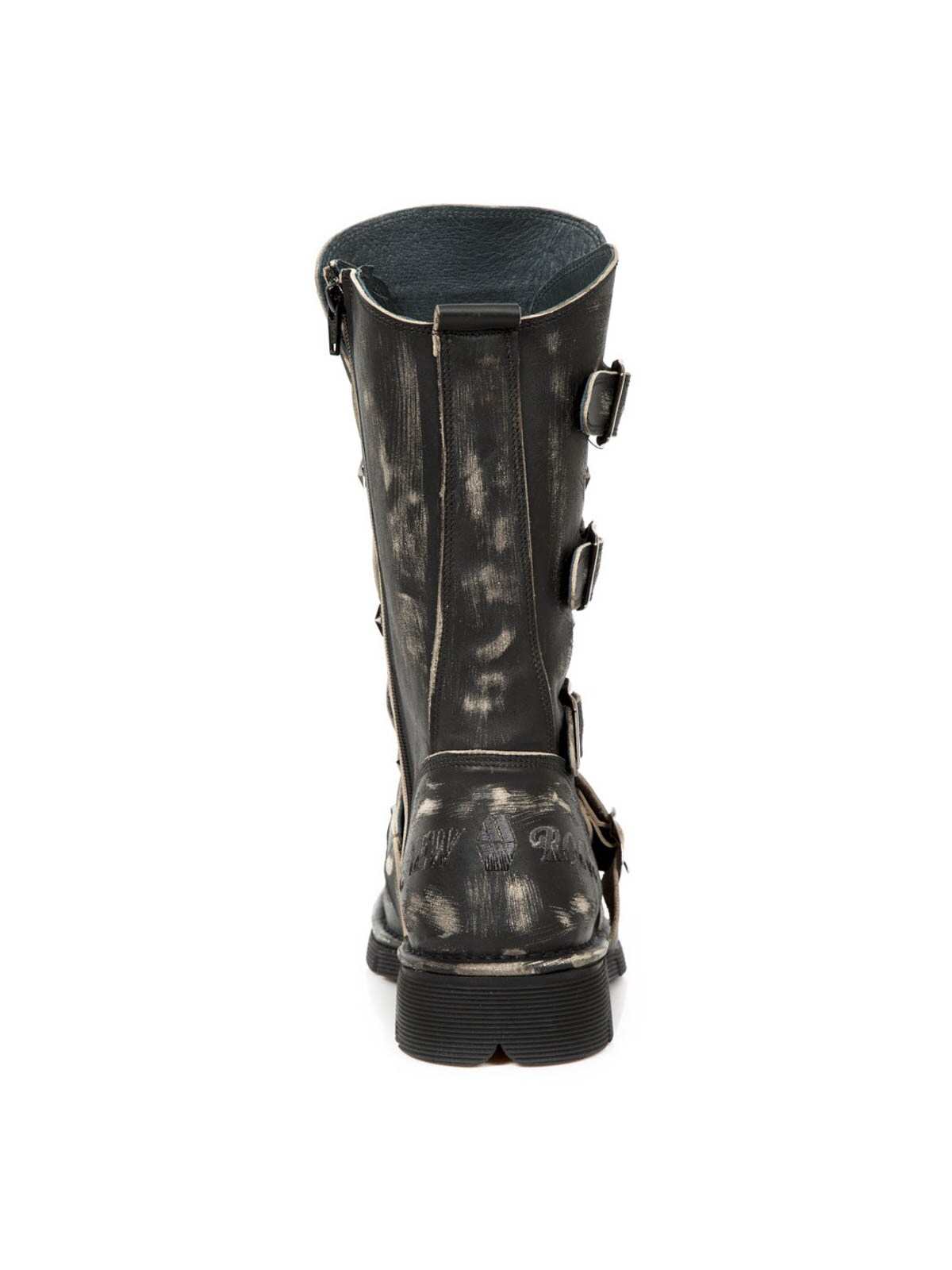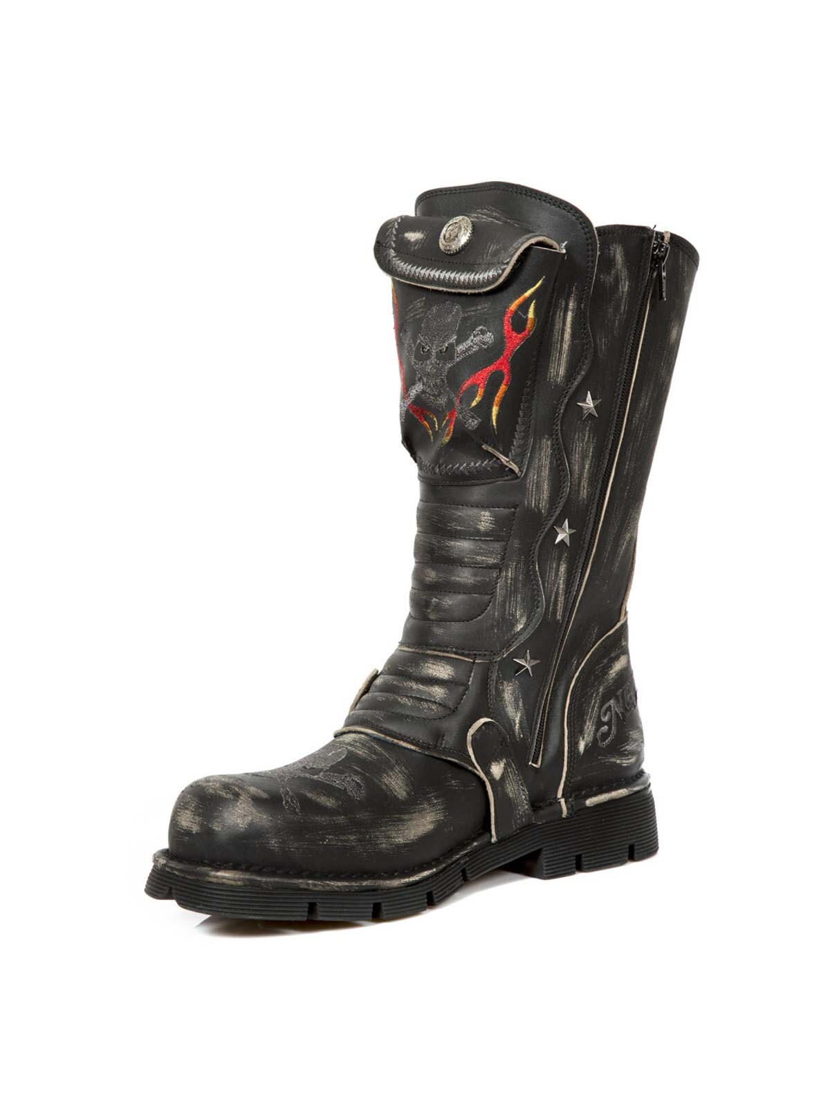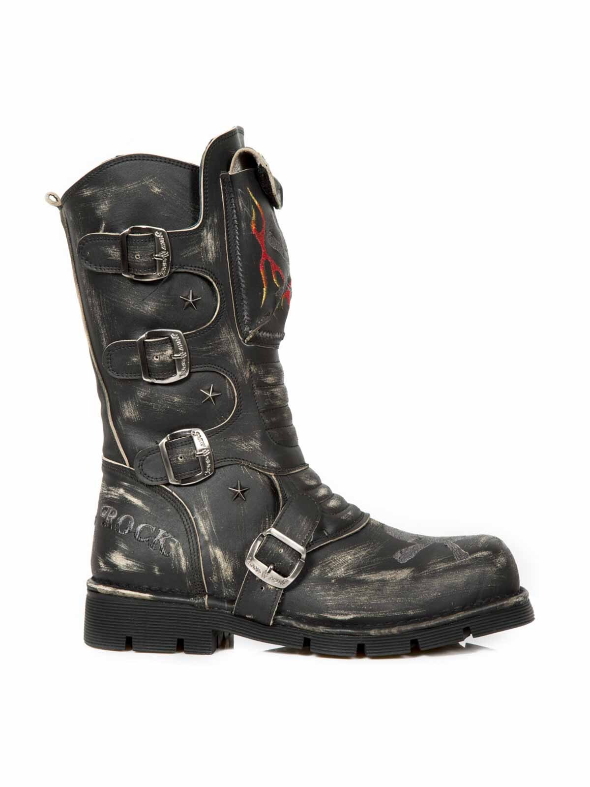 Sko med et højt skaft og mønsterbroderier. De er designede med en lomme, øverst på skaftet, der kan lukkes. Et spænde i læder, med et lås i metal, findes fortil. Hertil kommer en lynlås på indersiden, der gør dem lette at tage af og på. New Rock sko er håndlavede i ægte læder, og de findes kun i et begrænset antal, hvilket gør begge sko unikke.