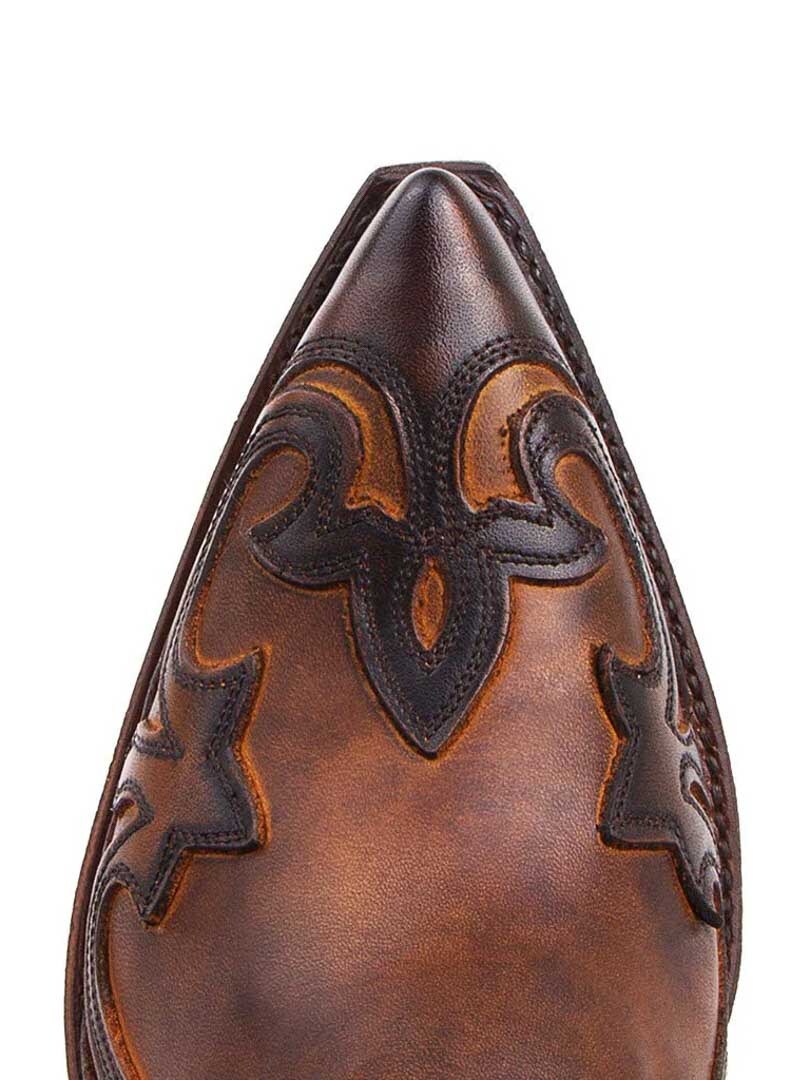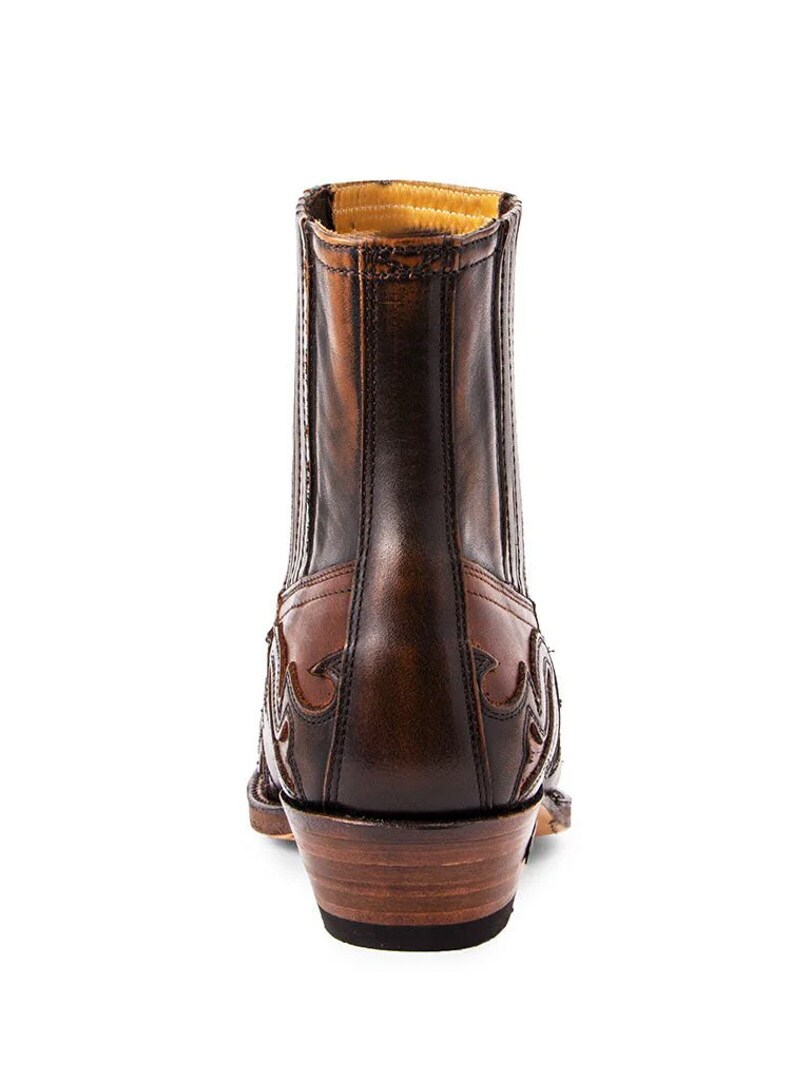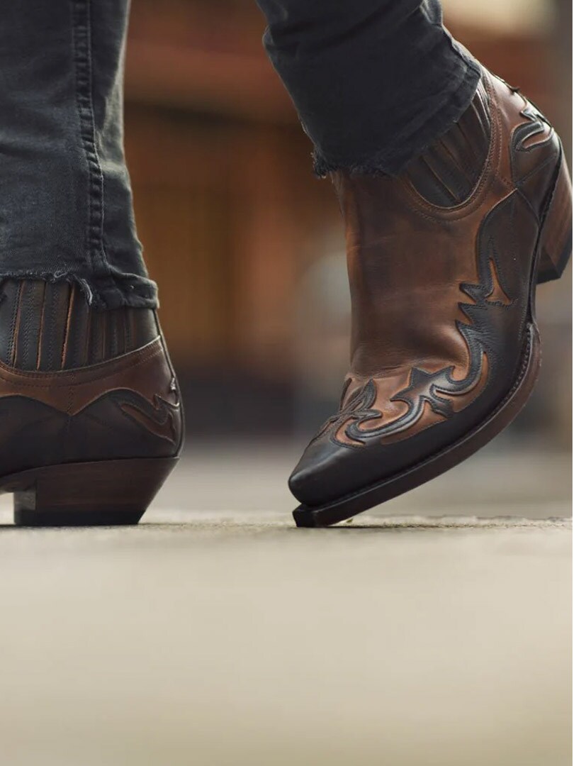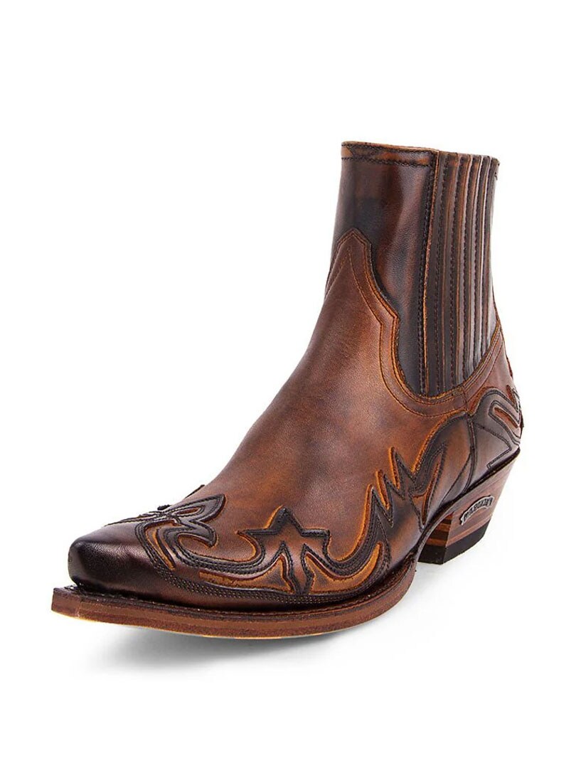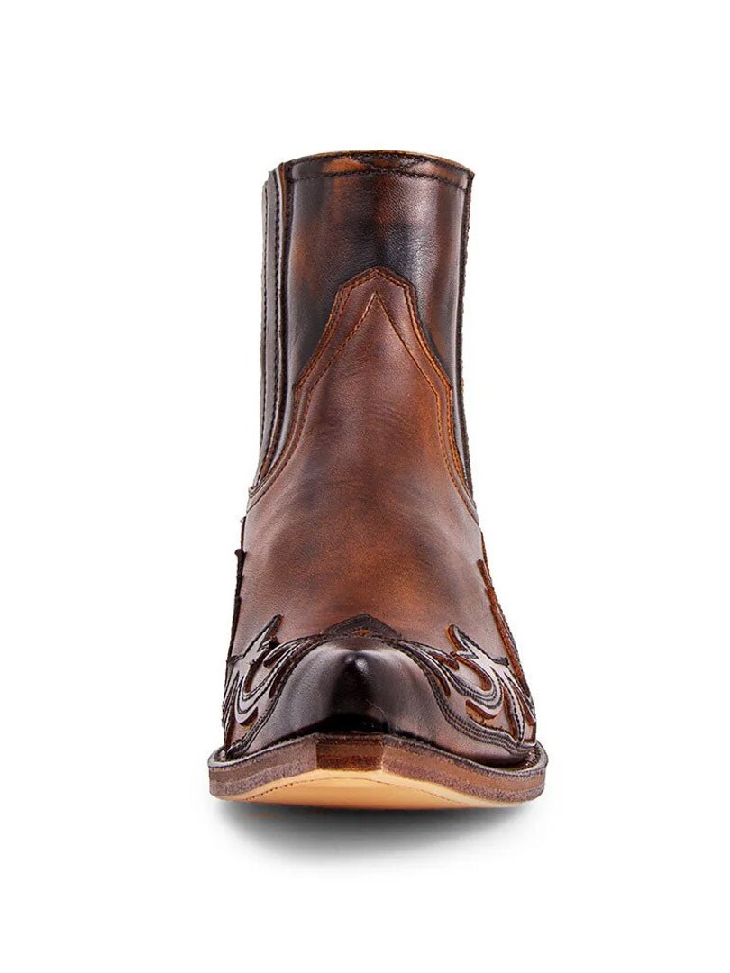 Korte westernstøvler i ægte brunt læder med broderet flammemønster. De elastiske paneler i siderne gør den nem at tage af og på, mens den spidse tå og den vinklede hæl bevarer den traditionelle vestlige karakter. Perfekt til dem, der ønsker et par alsidige støvler med karakter.