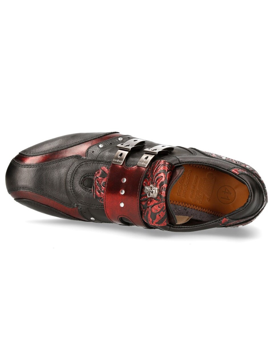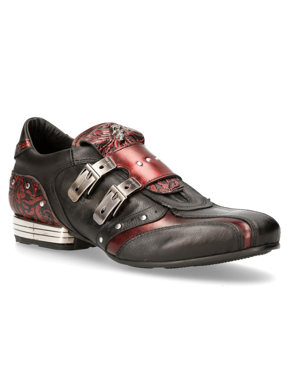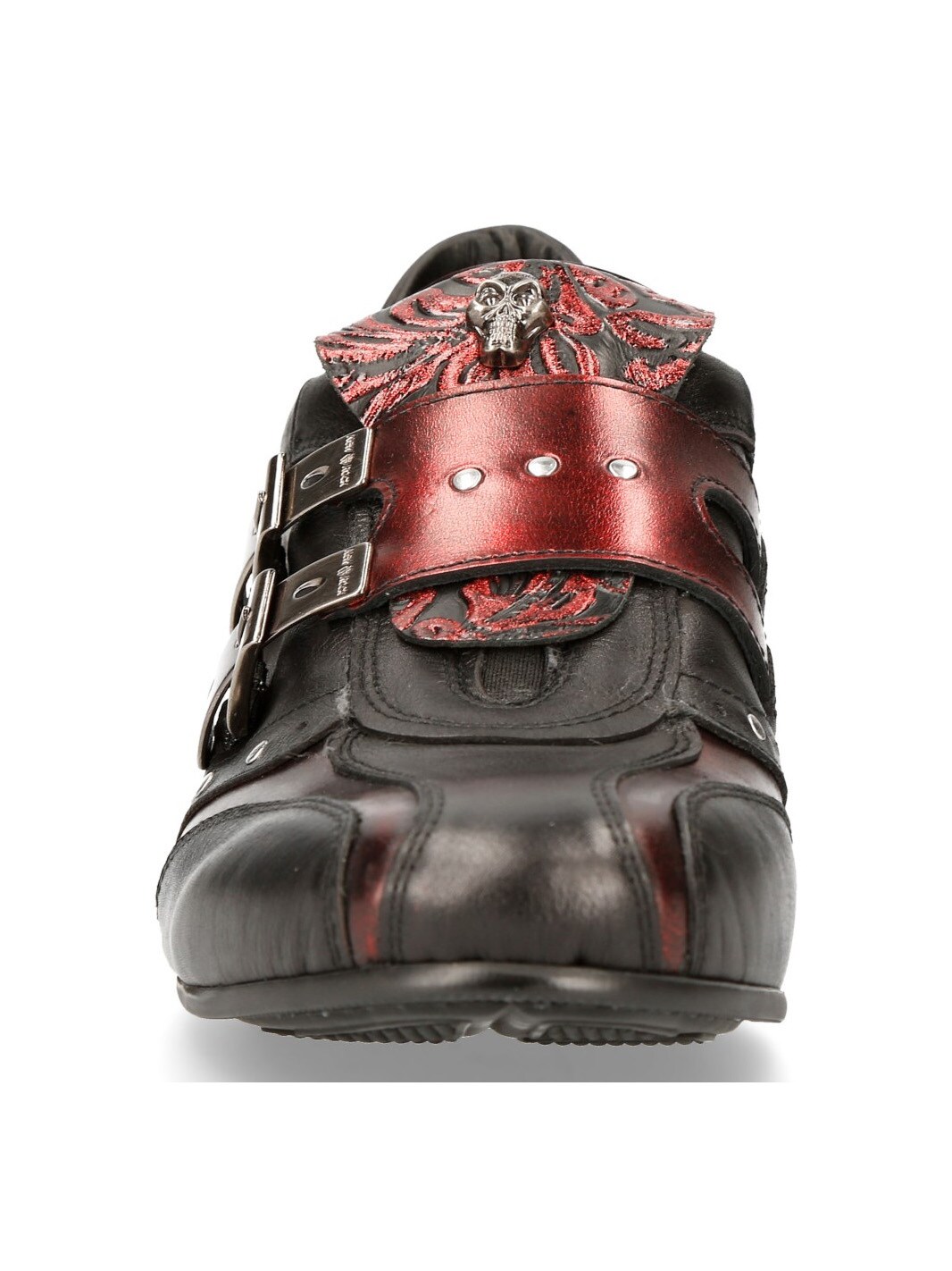 Sorte sko i ægte læder i et mønster og med et lavt skaft. De er detaljerede med røde partier, nitter og en rem i læder, hvor der sidder to spænder i metal på. Fortil på skoene findes en lap med dødningehoveder. Denne sko findes i et begrænset oplag!