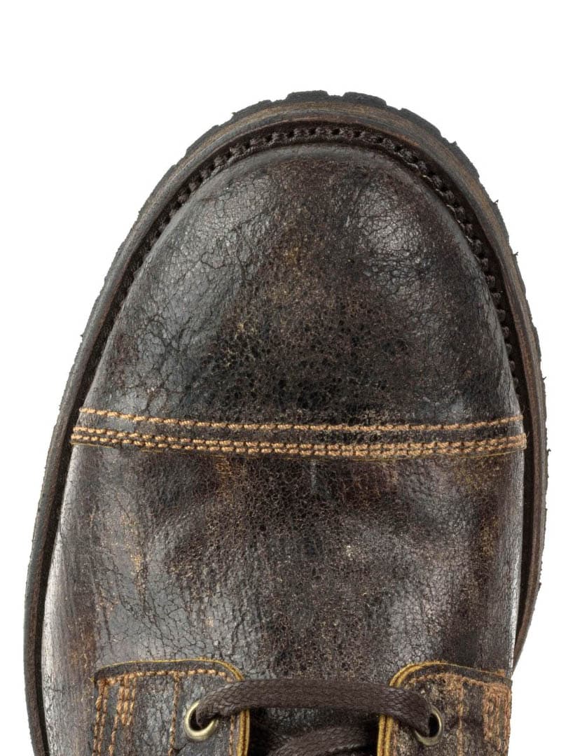 Et kraftfuldt og karakterfuldt par støvler i håndaldreret læder, som giver et autentisk, slidt look. Modellen kombinerer klassisk vintage-stil med moderne, militærinspirerede detaljer. Støvlen er bygget til at holde, med en læder- og gummisål syet efter det prestigefyldte Goodyear Welted-system, hvilket giver overlegen holdbarhed og stabilitet. En støvle med tidløs attitude – lige flot til jeans som til mere dressed outfits.