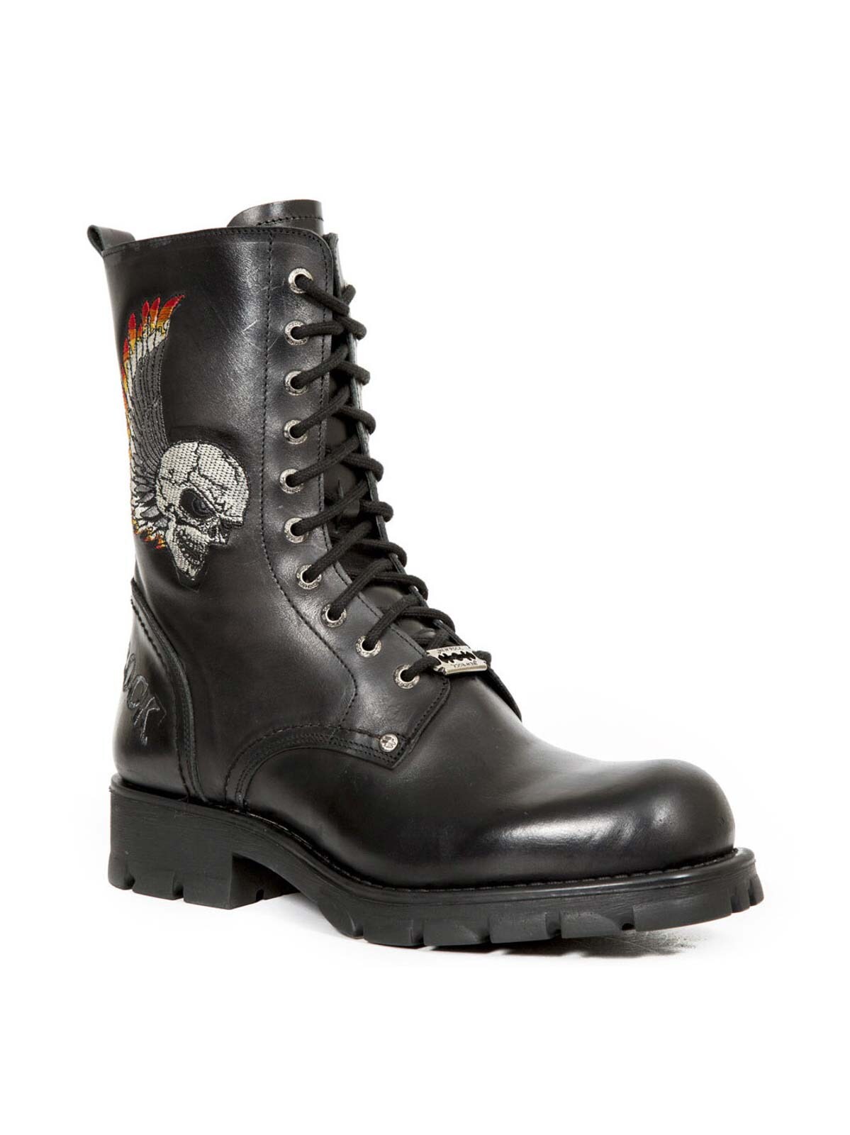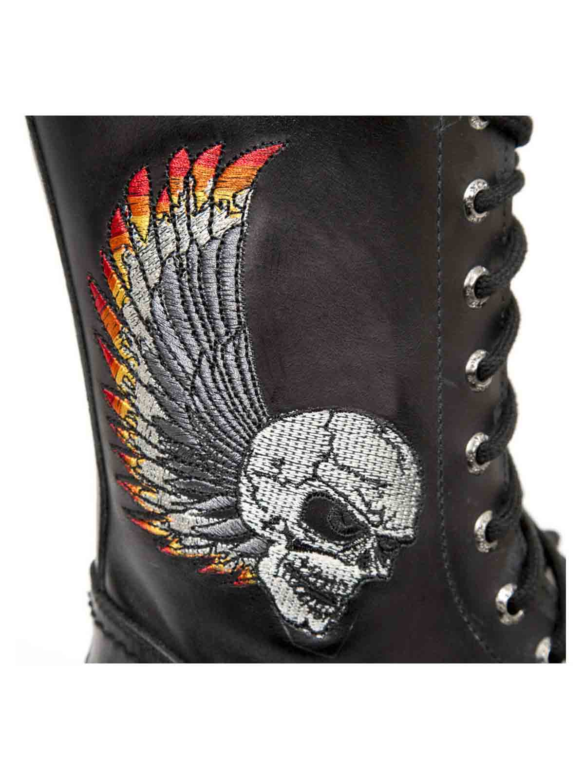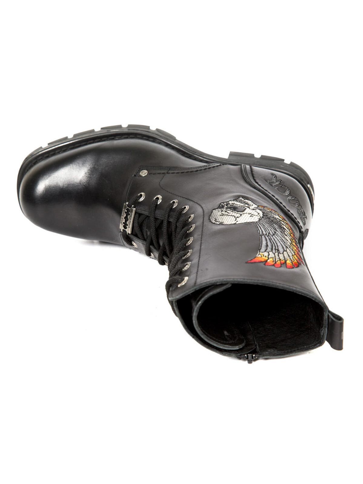 Sorte sko med mønsterbroderier. Disse støvler har et højt skaft med snøring, samt en lynlås på indersiden, hvilket gør dem lette at tage af og på. De er fremstillede i ægte læder og findes kun i et begrænset antal. Det er med til at gøre hver enkelt sko unik.