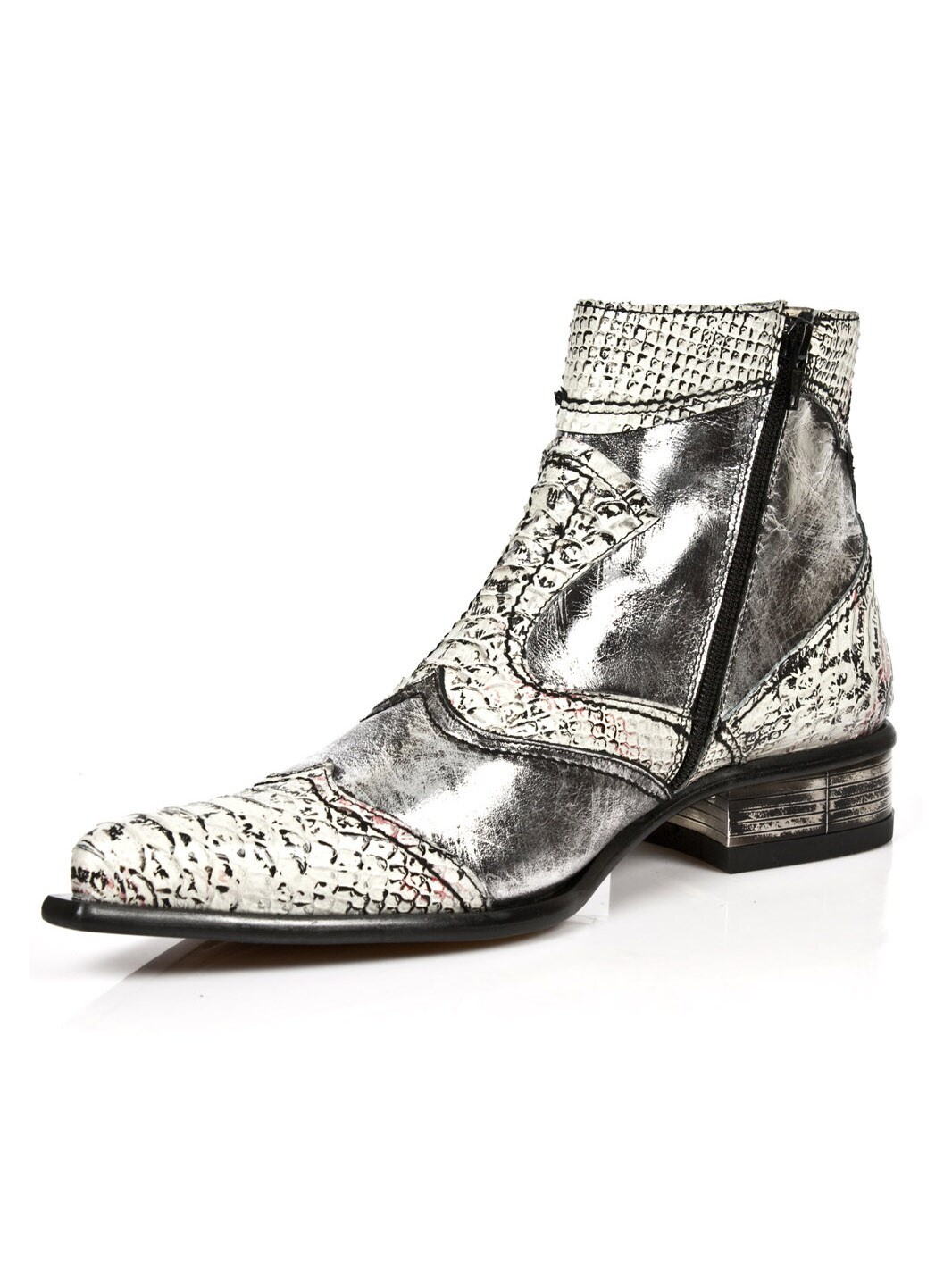 Slangeskindsmønstrede støvler med sølvskinnende effekter i en cowboy/rock-stil. Dette er en spids model med en lav hæl. Der findes en lynlås på indersiden, hvilket gør dem lette at tage af og på. Det er unikke sko der kun fremstilles i få eksemplarer!