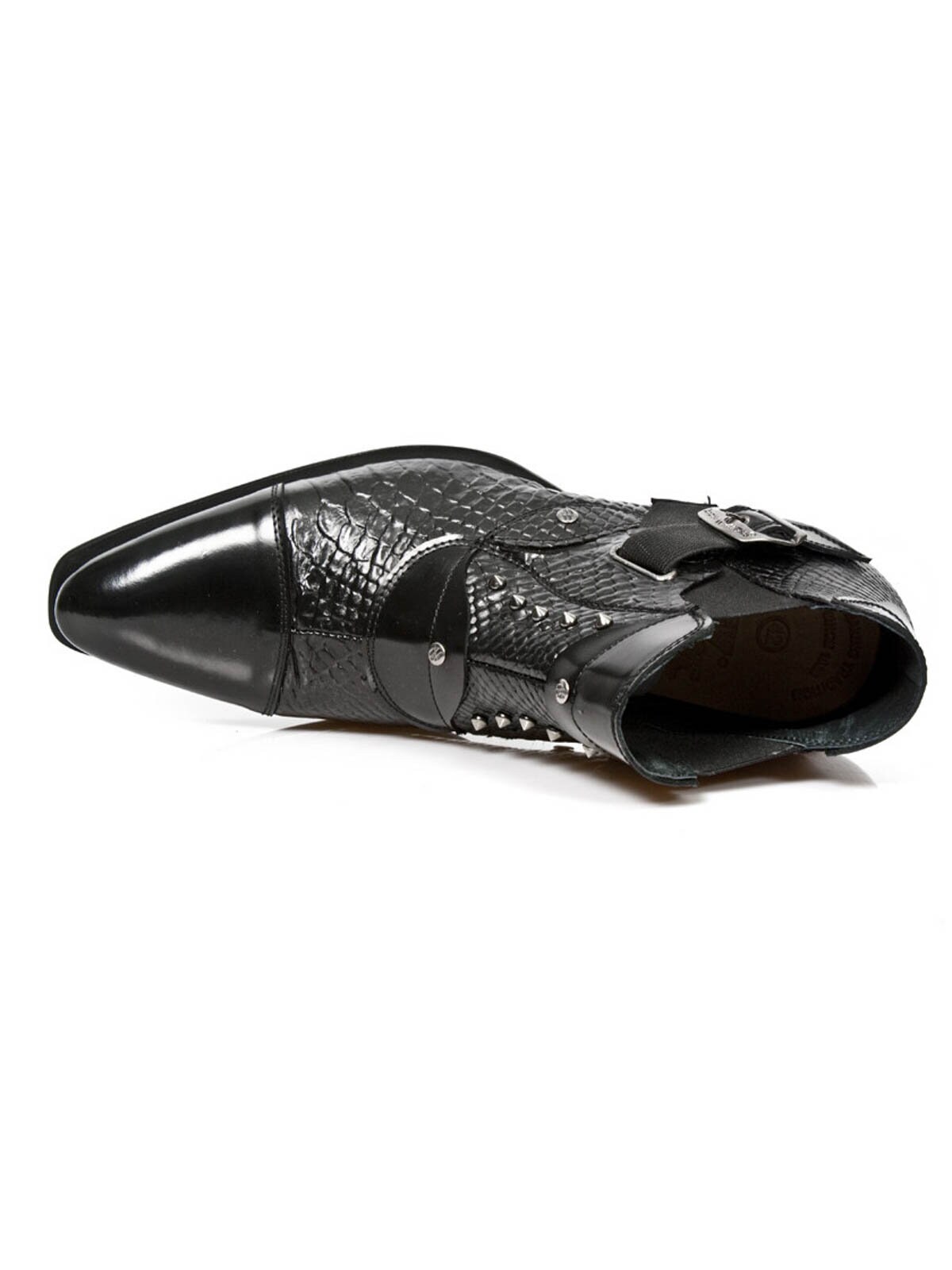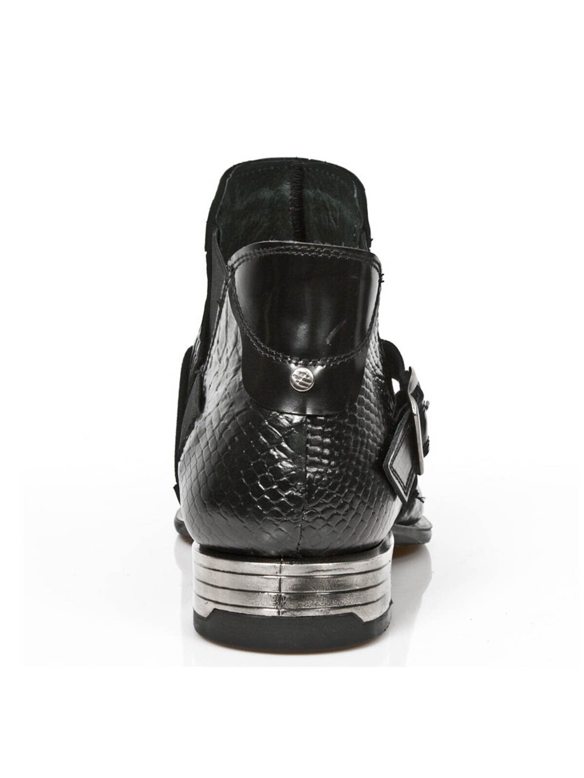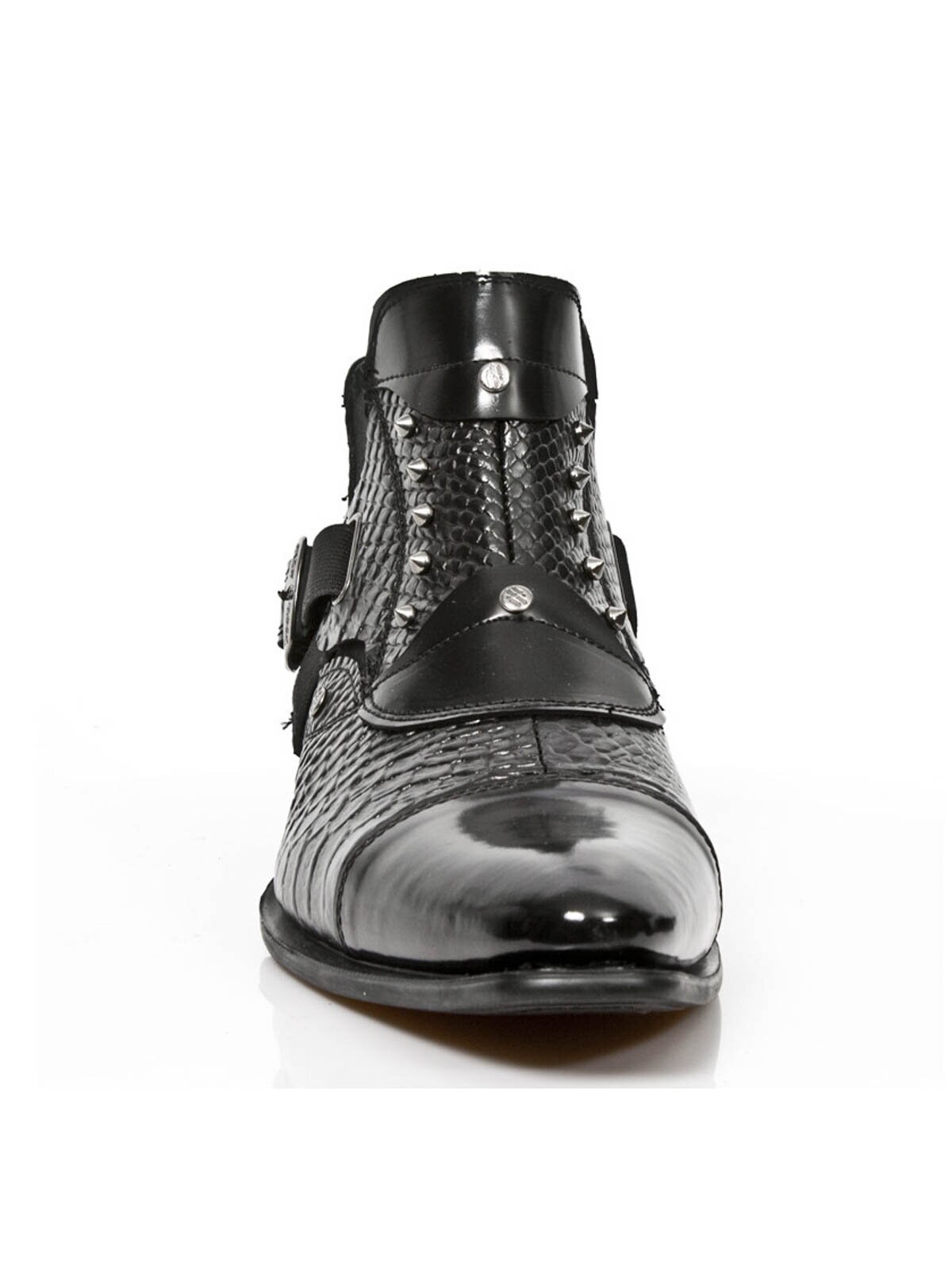 Sorte sko i ægte læder med mønster og lavt skaft. Detaljerede med nitter og stropper i elastik med spænde i metal. Elastik ved skaftets åbning, på begge sider, hvilket gør det lettere at tage dem af og på. Denne unikke sko findes i et begrænset oplag!