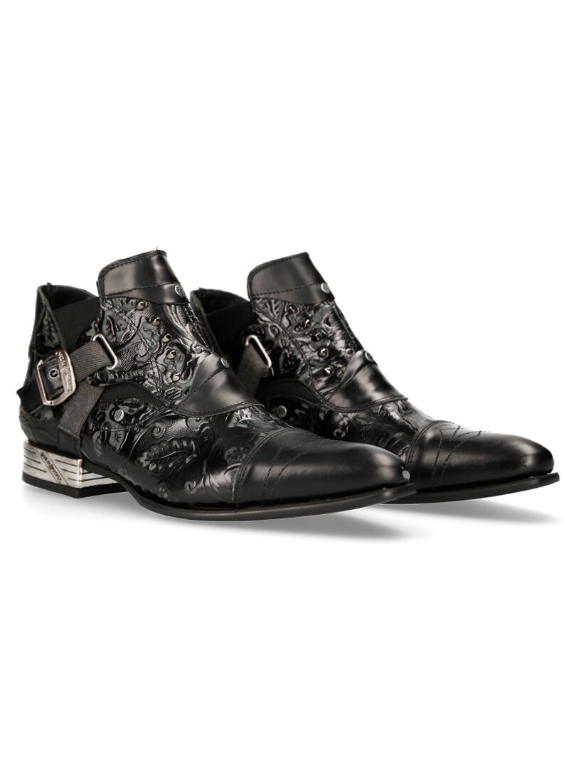 Sorte sko i ægte læder med mønster og lavt skaft. Detaljerede med nitter og stropper i elastik med spænde i metal. Elastik ved skaftets åbning, på begge sider, hvilket gør det lettere at tage dem af og på. Denne unikke sko findes i et begrænset oplag!