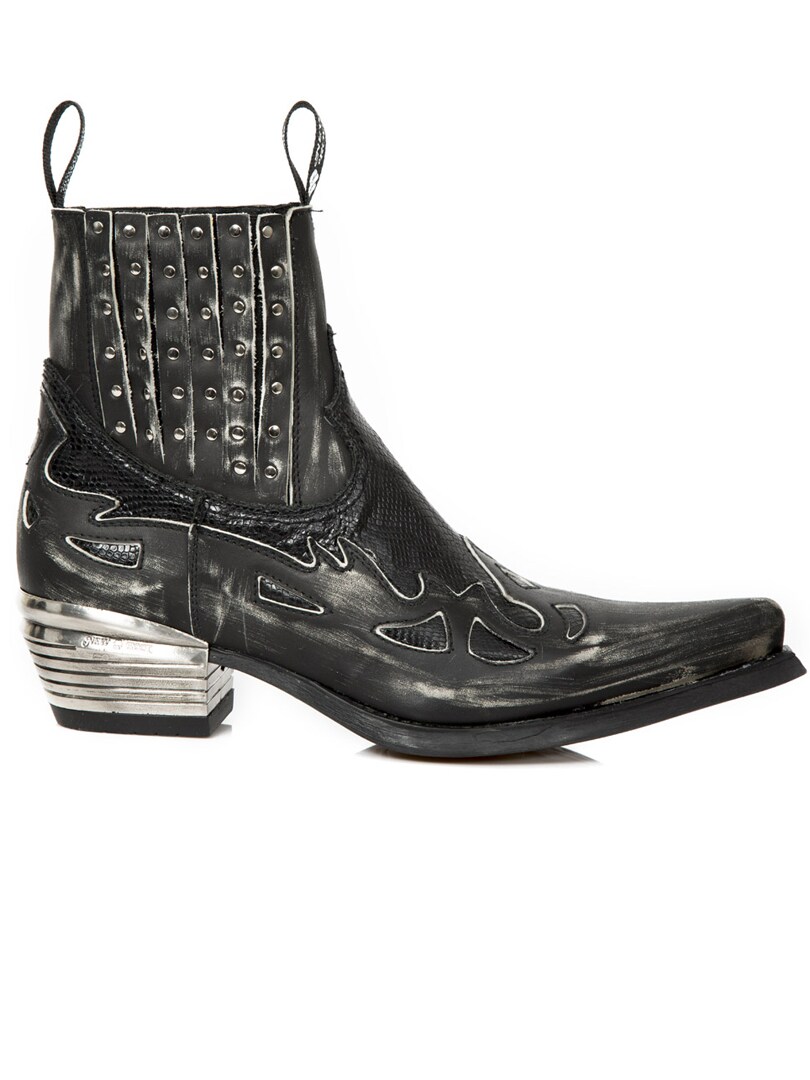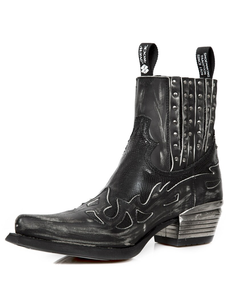 Sorte støvler i en cowboy / rock stil. Støvlerne er lavet i Spanien i 100 % ægte kvalitetslæder. Alle støvler fra New Rock er håndlavede, og findes kun i et begrænset oplag, hvilket gør hver sko unik. Gummisål med et kraftigt hælparti af metal.