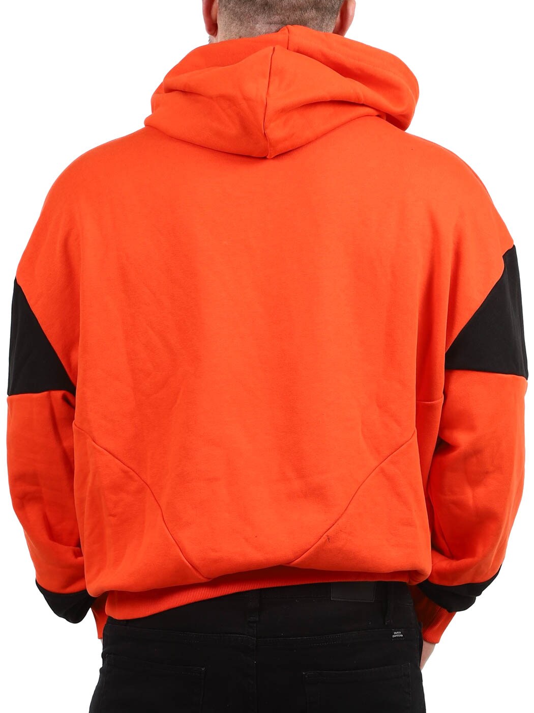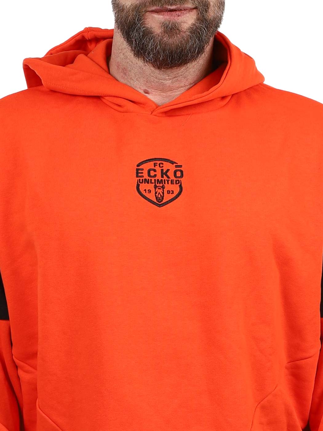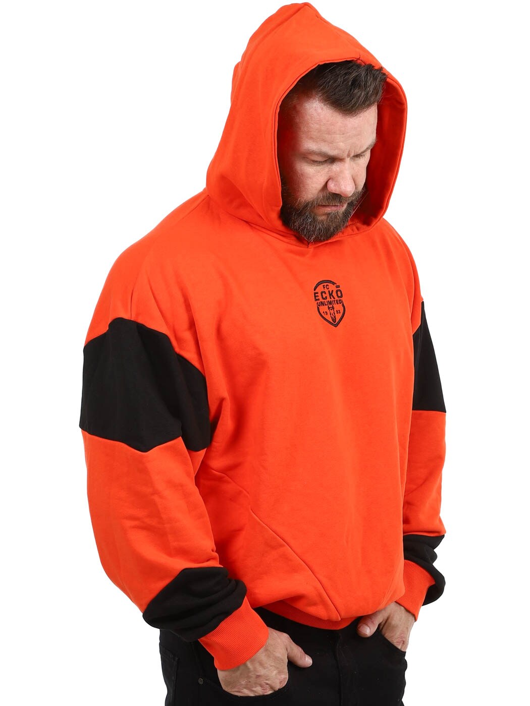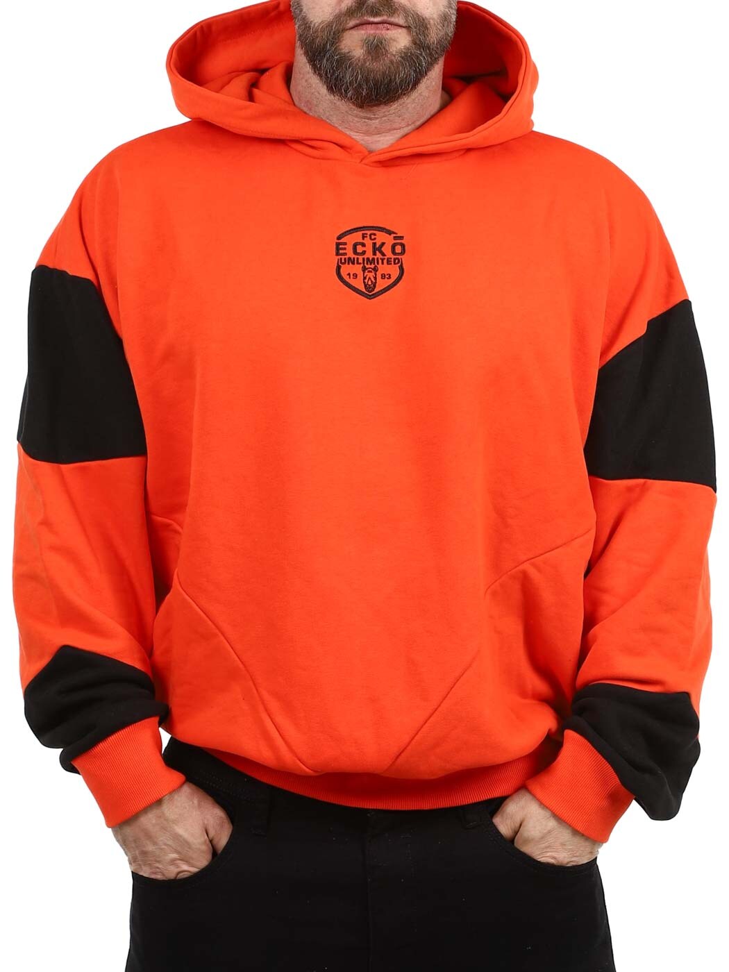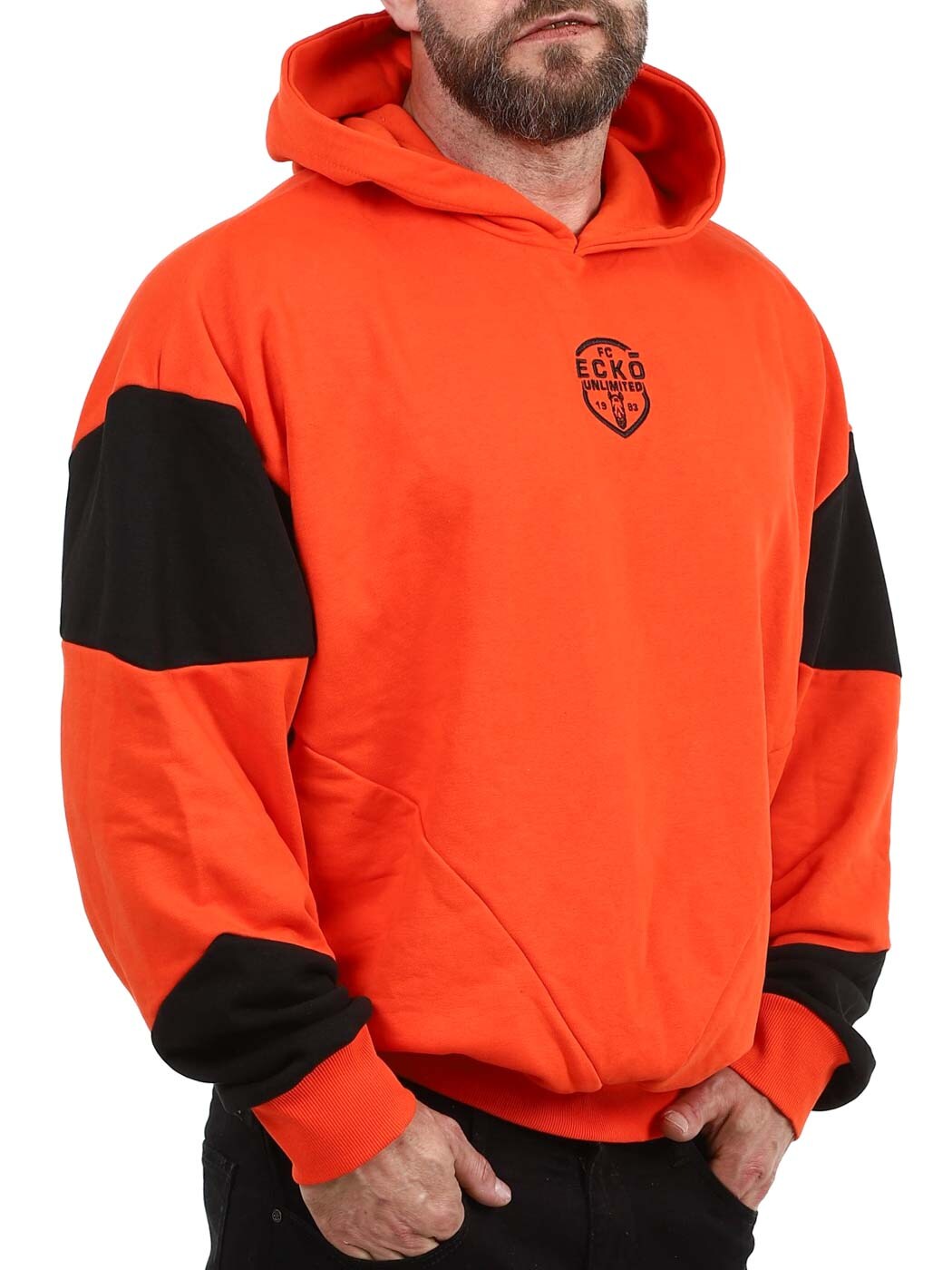 En sweatshirt i en orange tone, der møder de sorte detaljer langs ærmerne, for en stil, der både ser gennemtænkt ud og samtidig også føles gennemtænkt. Den har en hætte, et skræddersyet logo på brystet og ribbede kanter i enderne.