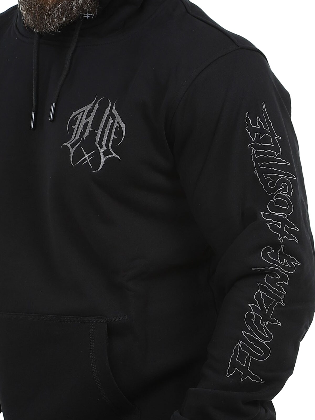 Sort hoodie designet med et fedt, skræddersyet tryk på brystet, ryggen og ærmerne. Hoodien har også et unikt motiv trykt på indersiden af hætten, som virkelig skiller sig ud, når hætten er oppe, og giver trøjen en ekstra cool detalje. Modellen er udstyret med en praktisk kængurulomme foran samt ribkanter ved ærmer og nederkant for en behagelig pasform.