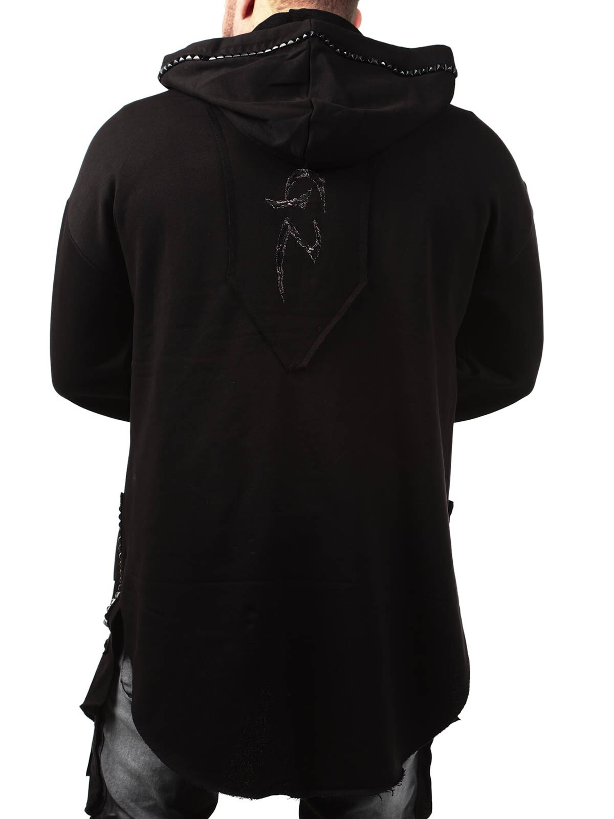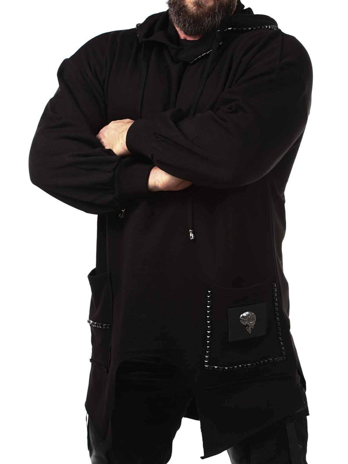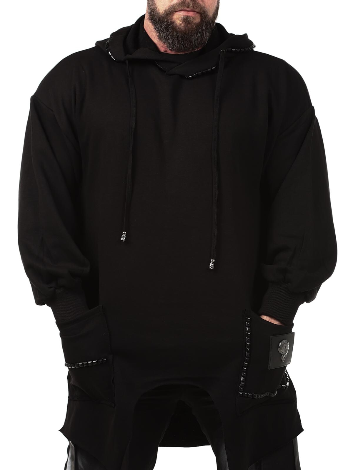 Hoodie i en længere model med en udskæring forneden. Den er detaljeret med sorte nitter, en lap og et fastsyet logo bagtil. Den har en hætte med snøring og to åbne lommer foran.