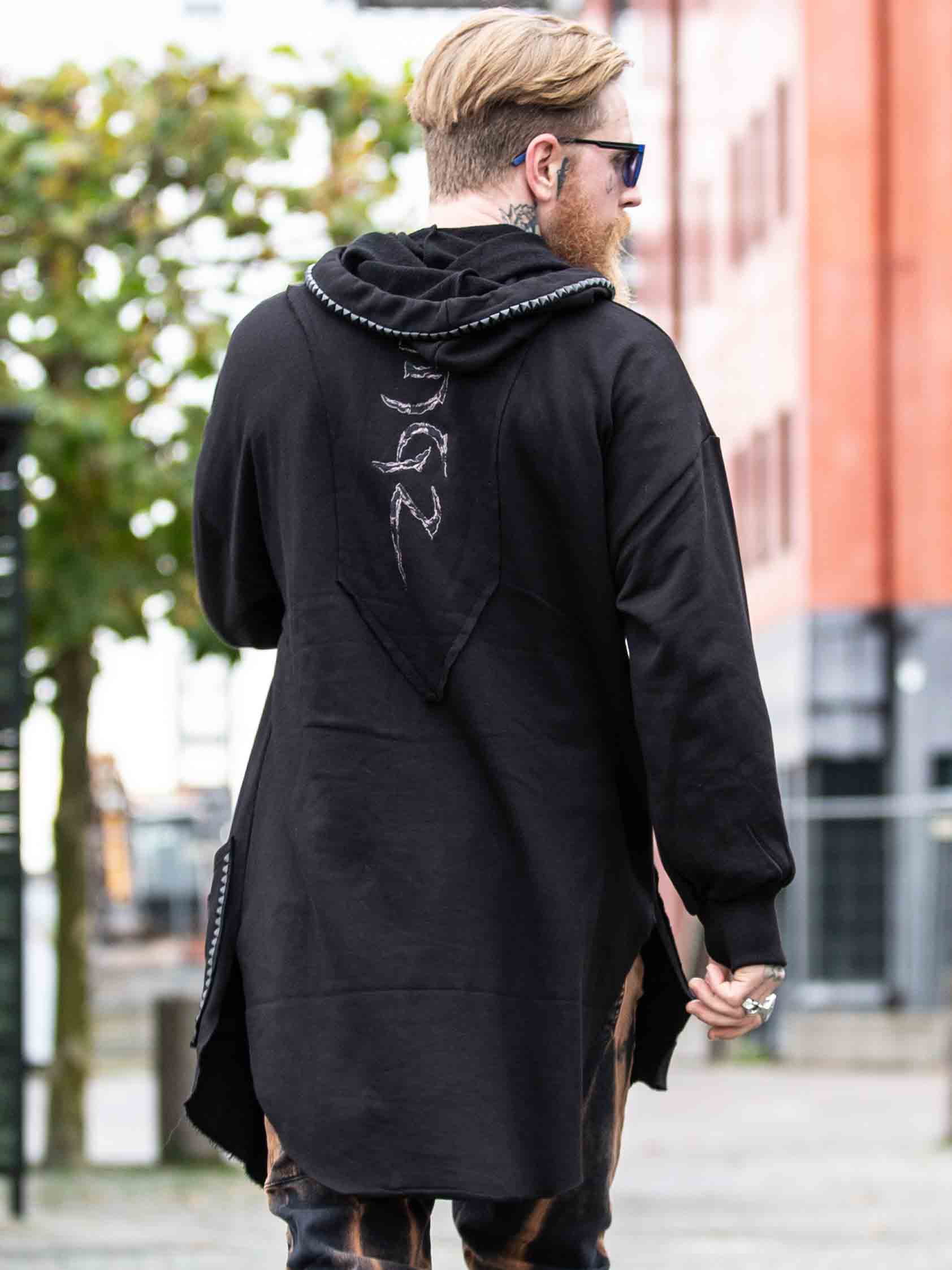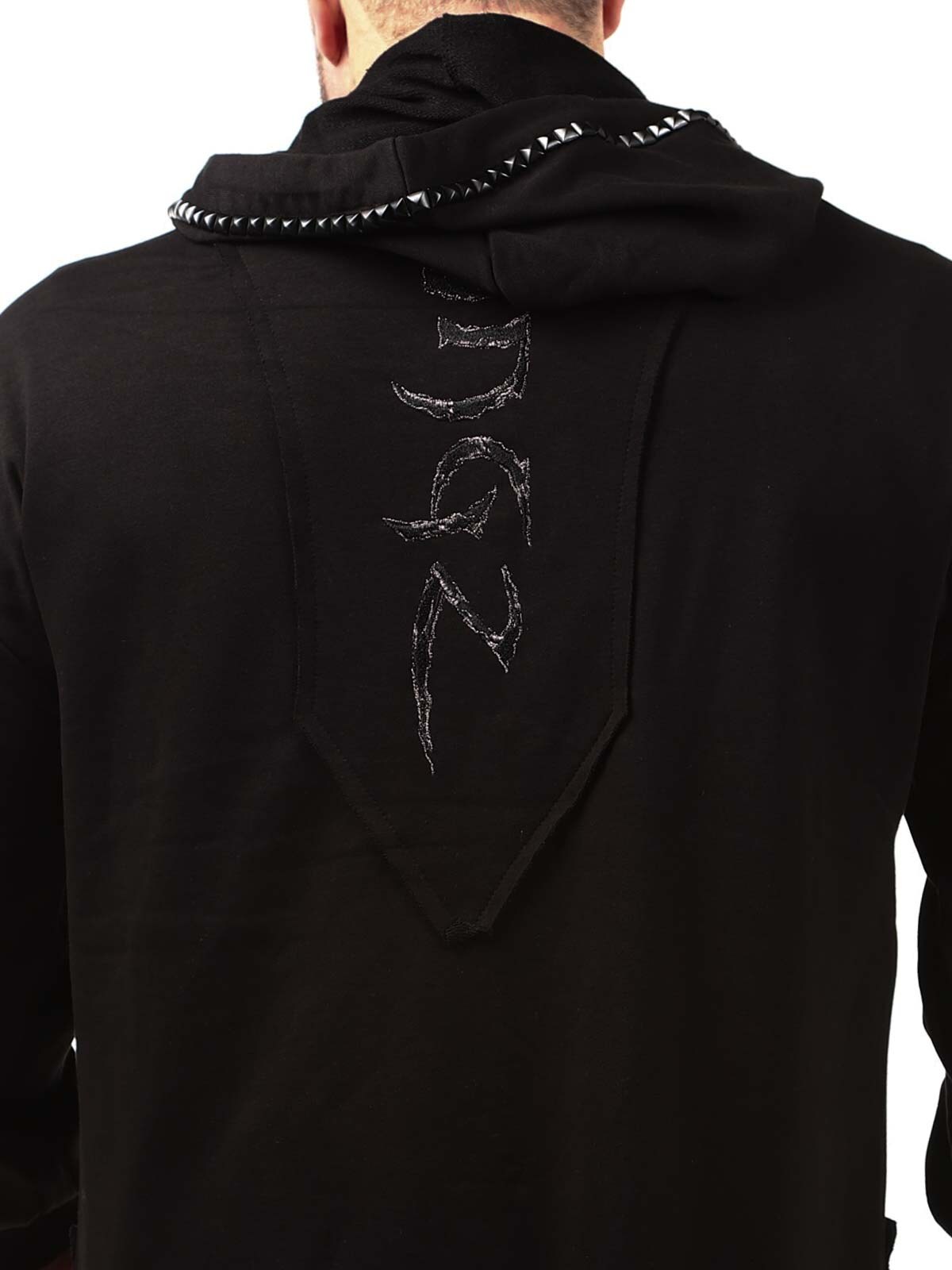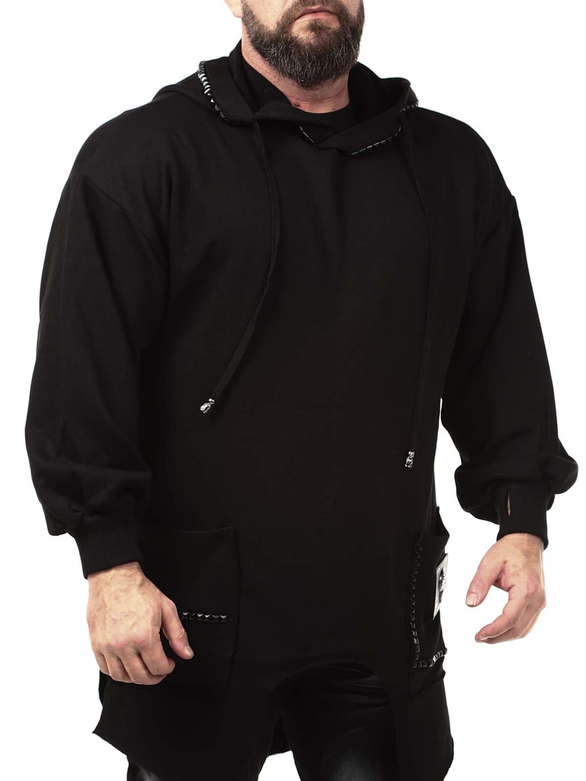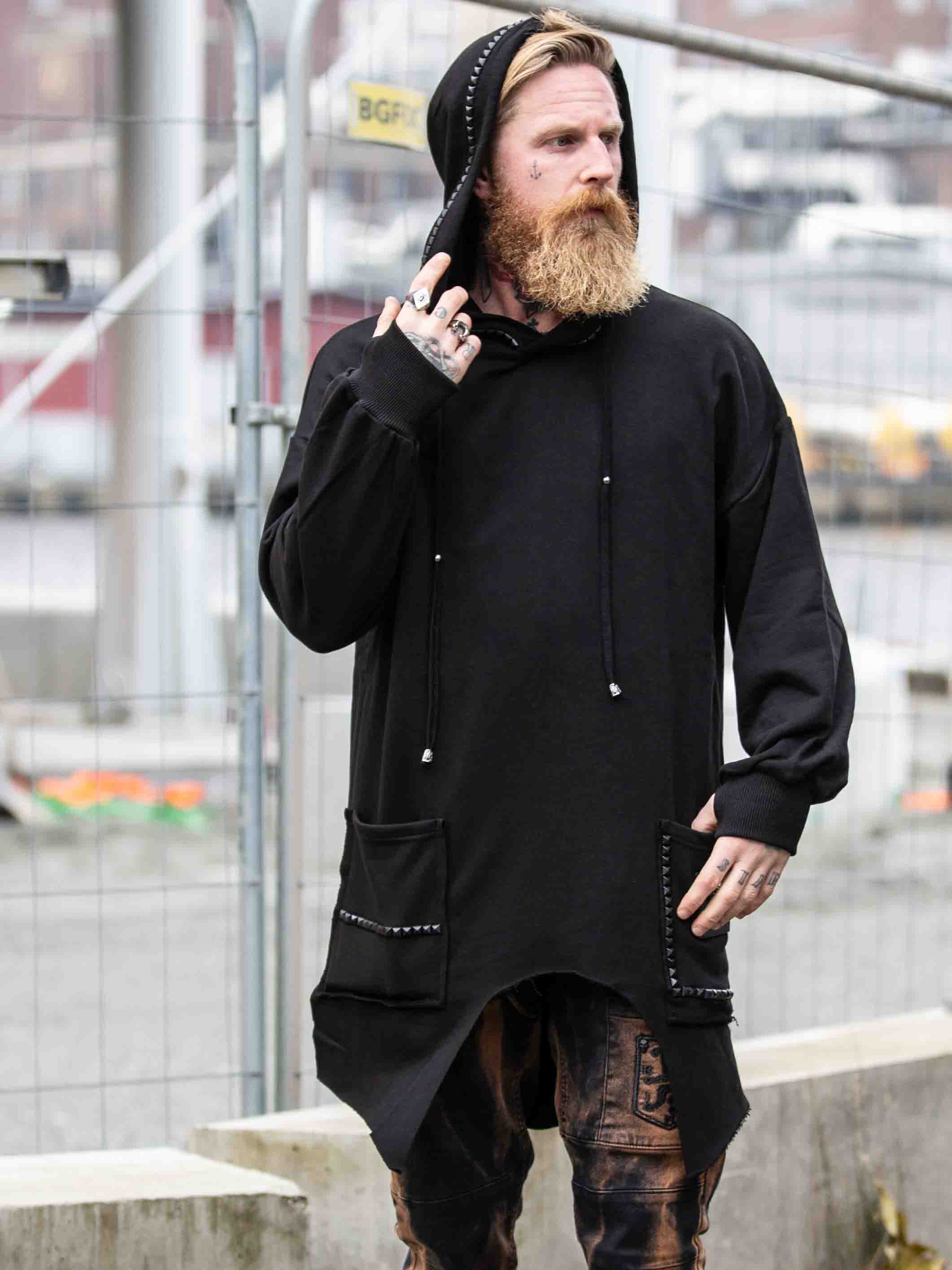 Hoodie i en længere model med en udskæring forneden. Den er detaljeret med sorte nitter, en lap og et fastsyet logo bagtil. Den har en hætte med snøring og to åbne lommer foran.