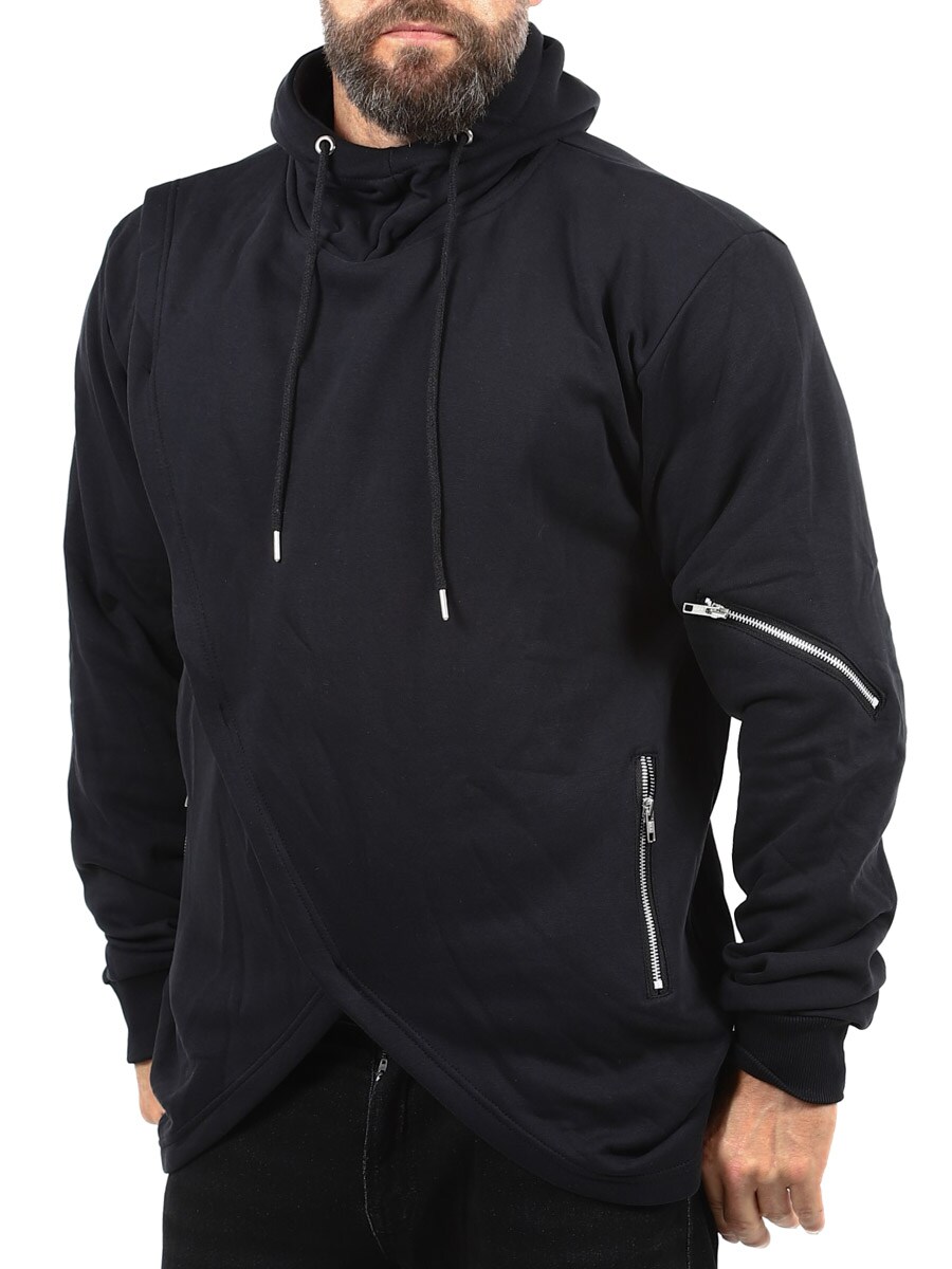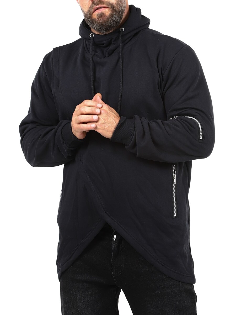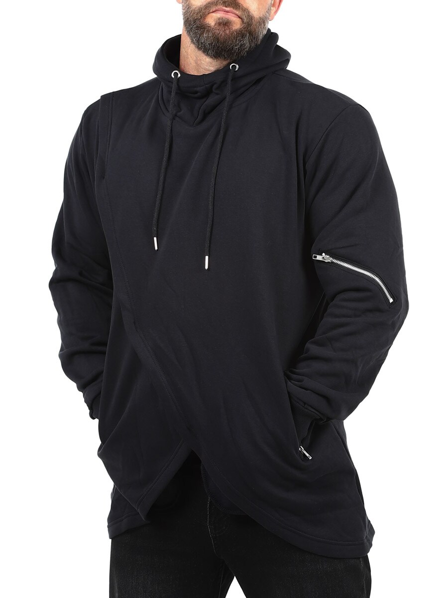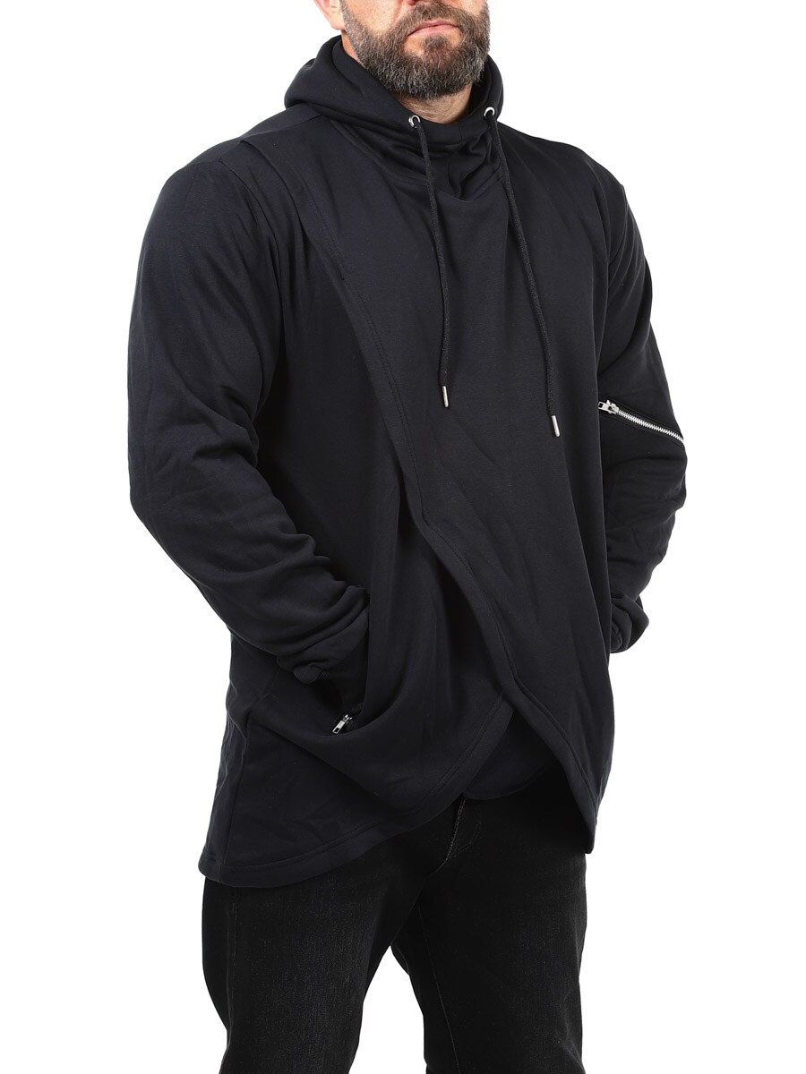 Hættetrøje i en længere model med udskæring forneden. Designet med dekorative lynlåse på ærmerne, hætte med snøre og ribkant i ærmerne. Den har to lommer fortil, der kan lukkes, og en børstet inderside. Denne trøje finder du kun hos RockDenim!