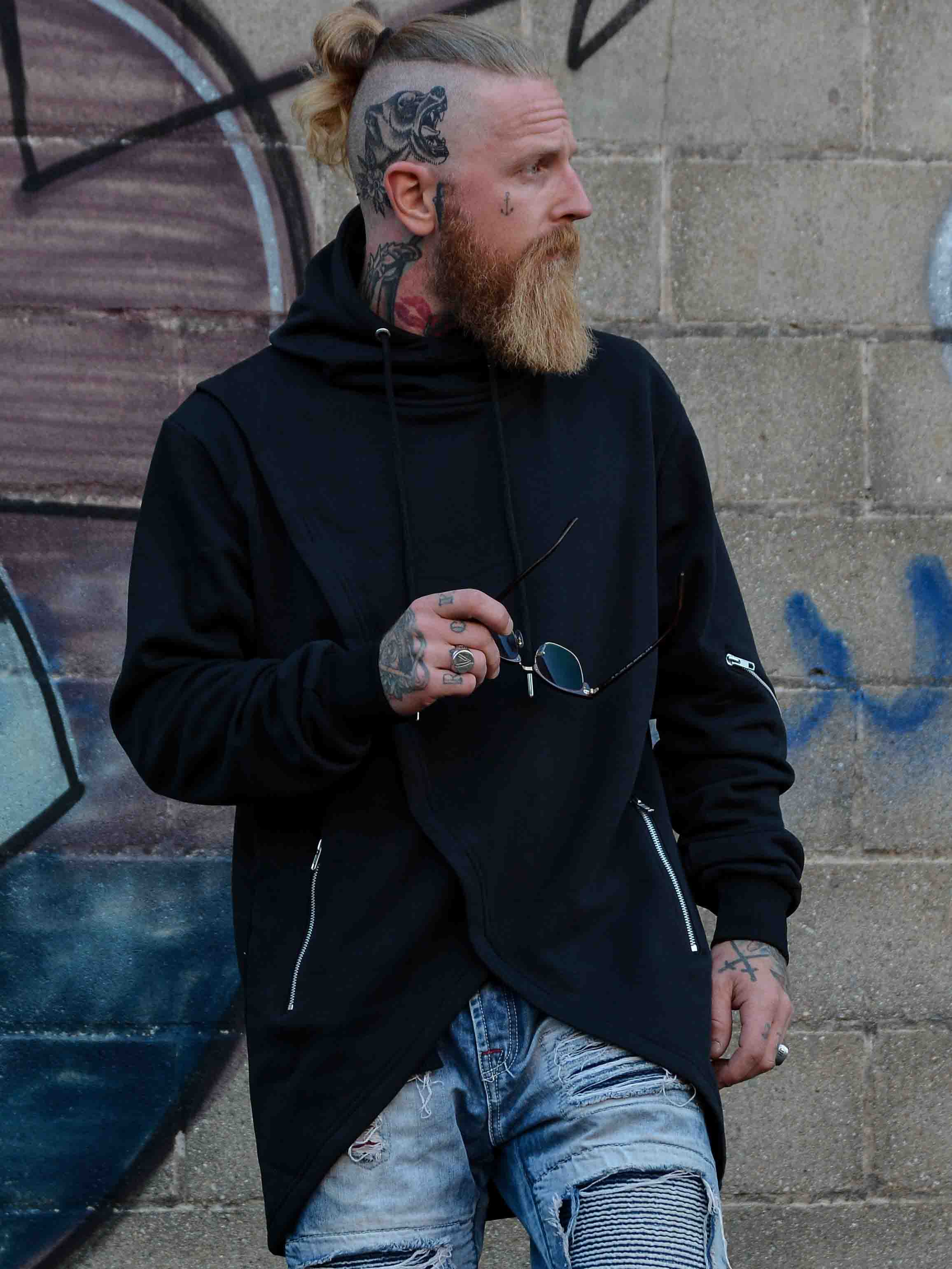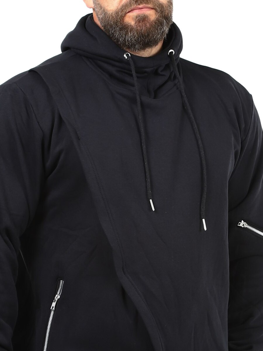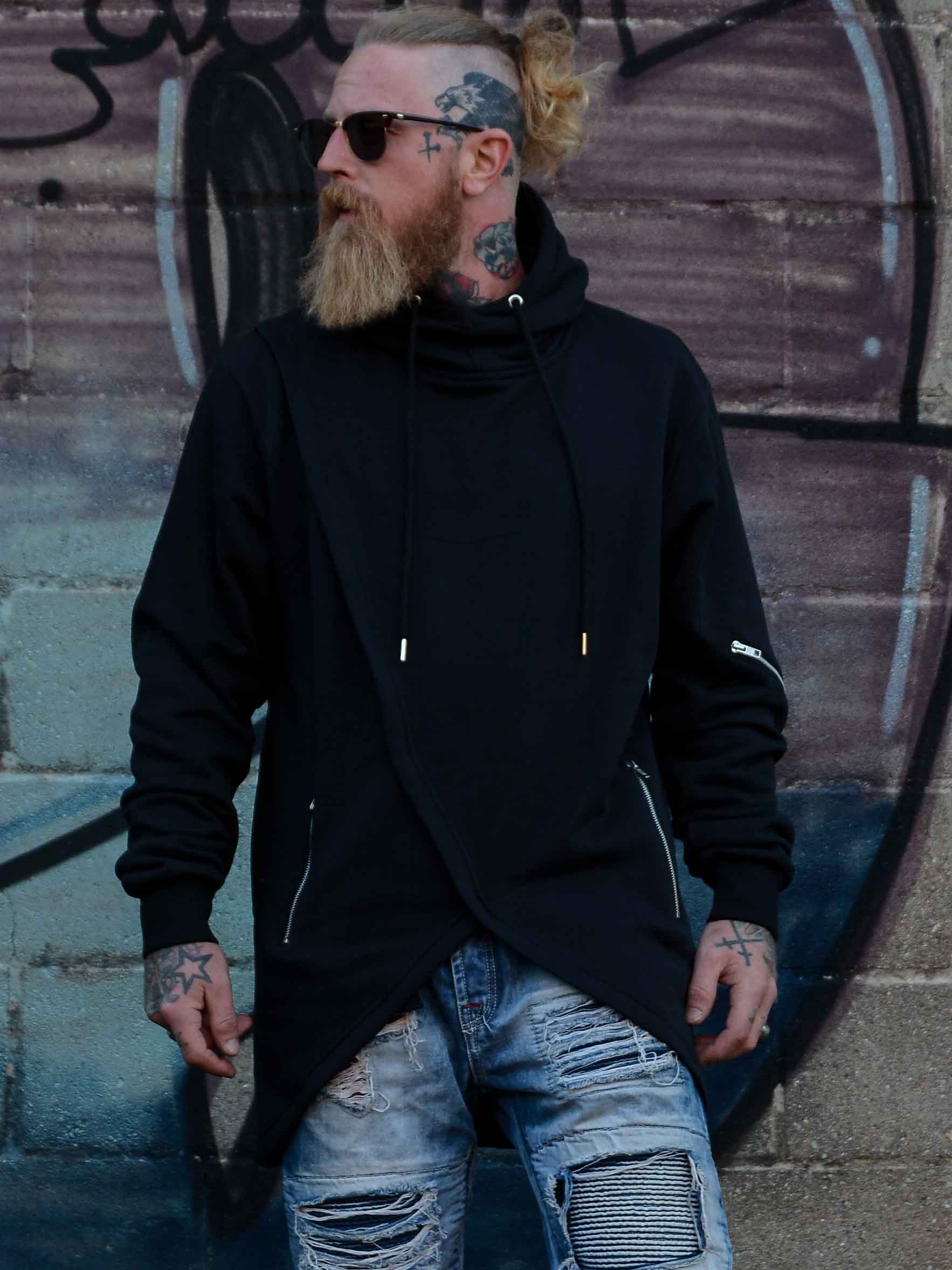 Hættetrøje i en længere model med udskæring forneden. Designet med dekorative lynlåse på ærmerne, hætte med snøre og ribkant i ærmerne. Den har to lommer fortil, der kan lukkes, og en børstet inderside. Denne trøje finder du kun hos RockDenim!