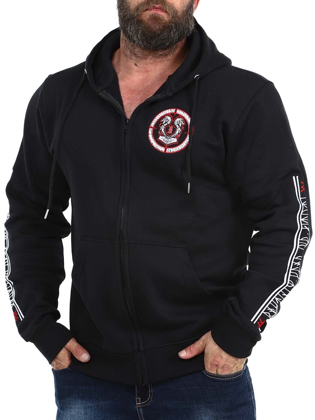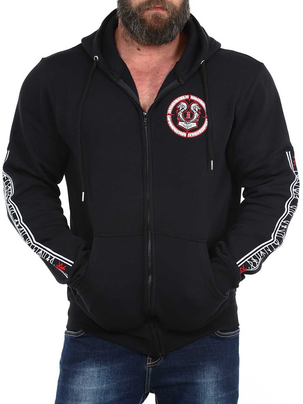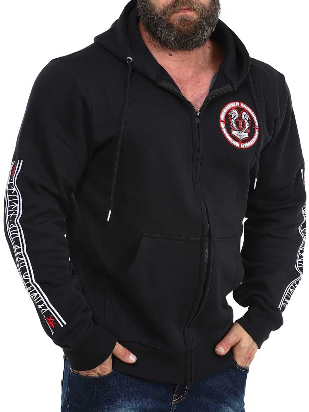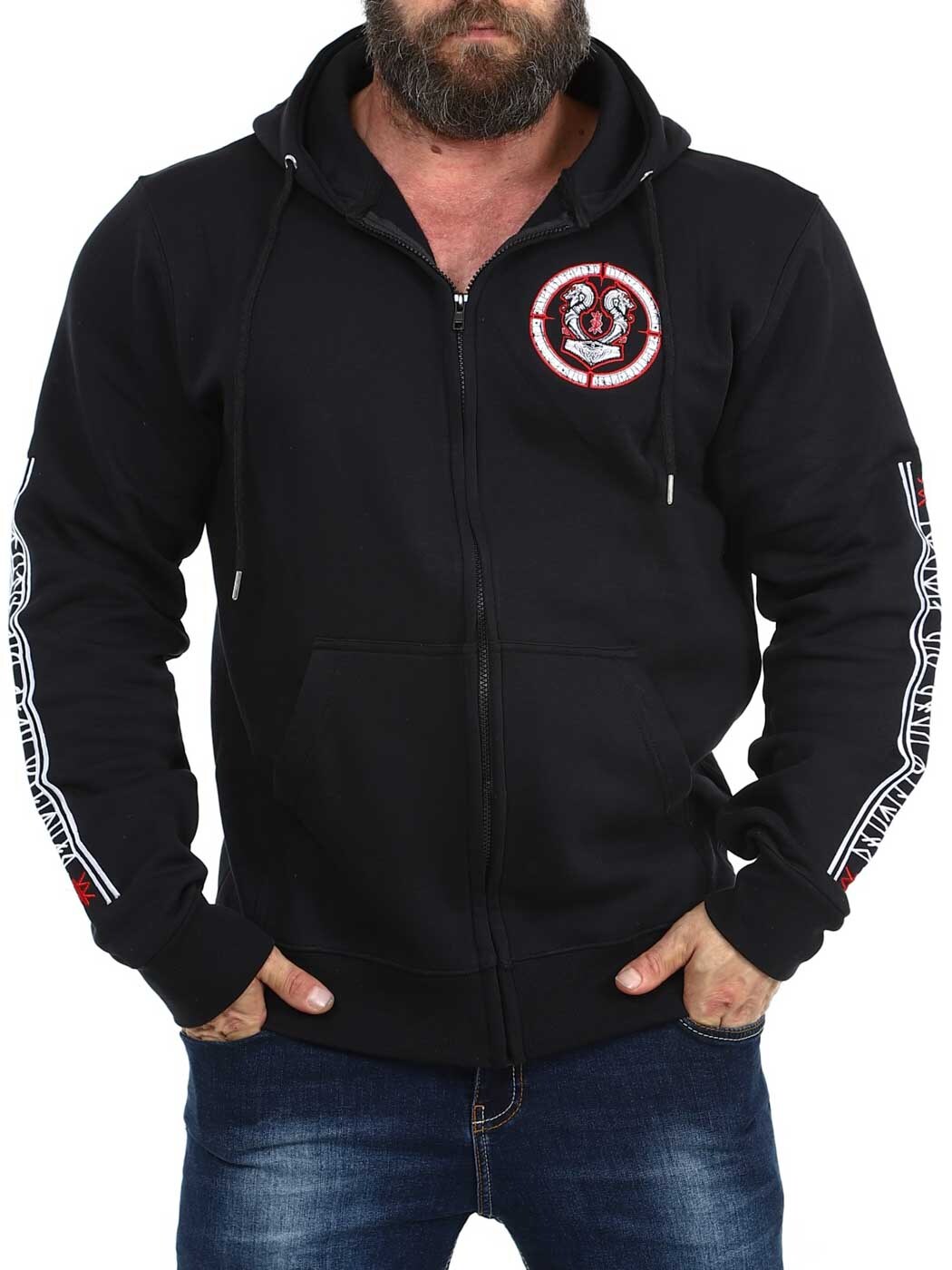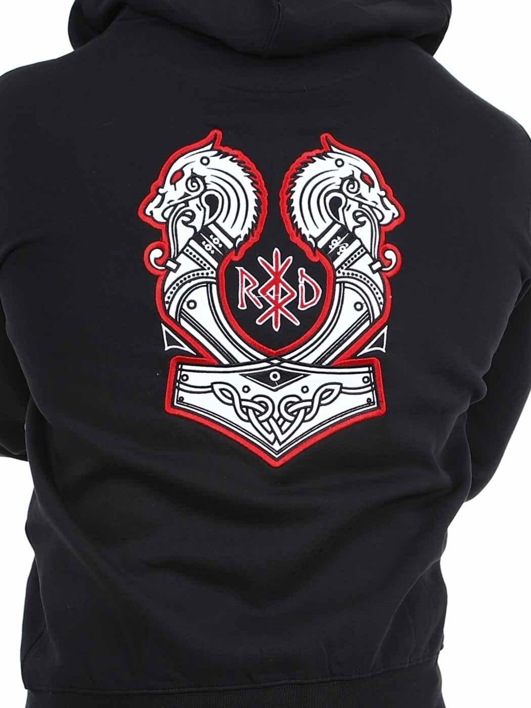 Hættetrøje med lynlås og vikinge-inspirerede motiver. Den har to lommer på maven og ribbede kanter i afslutningerne. Disse unikke shorts findes kun hos RockDenim!