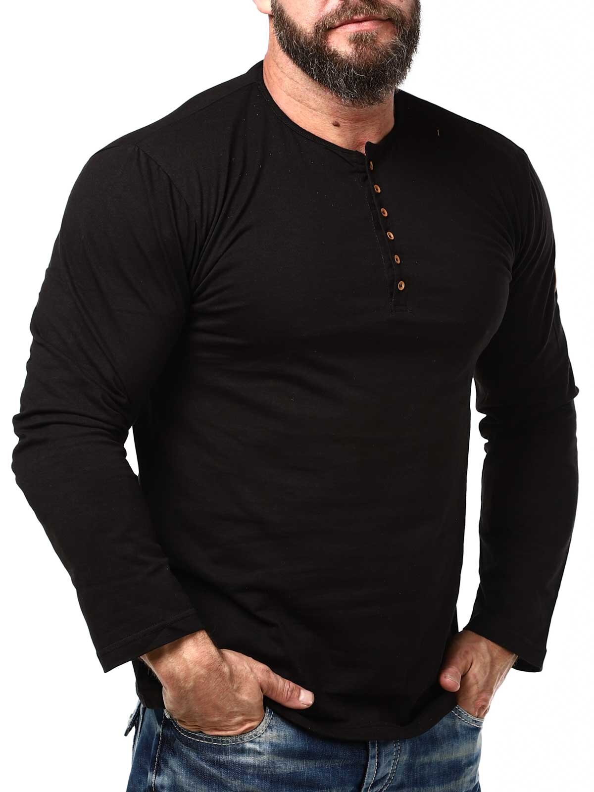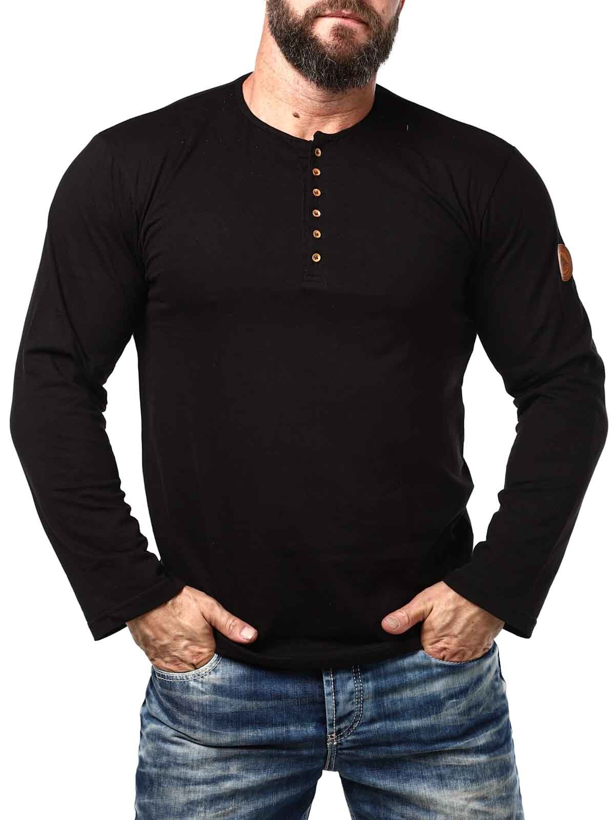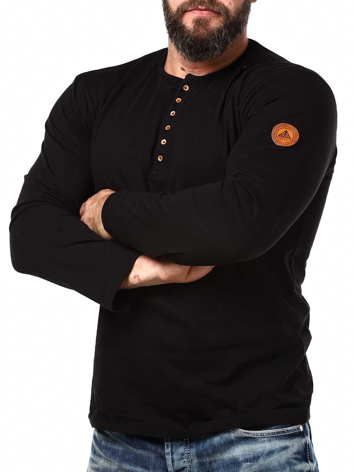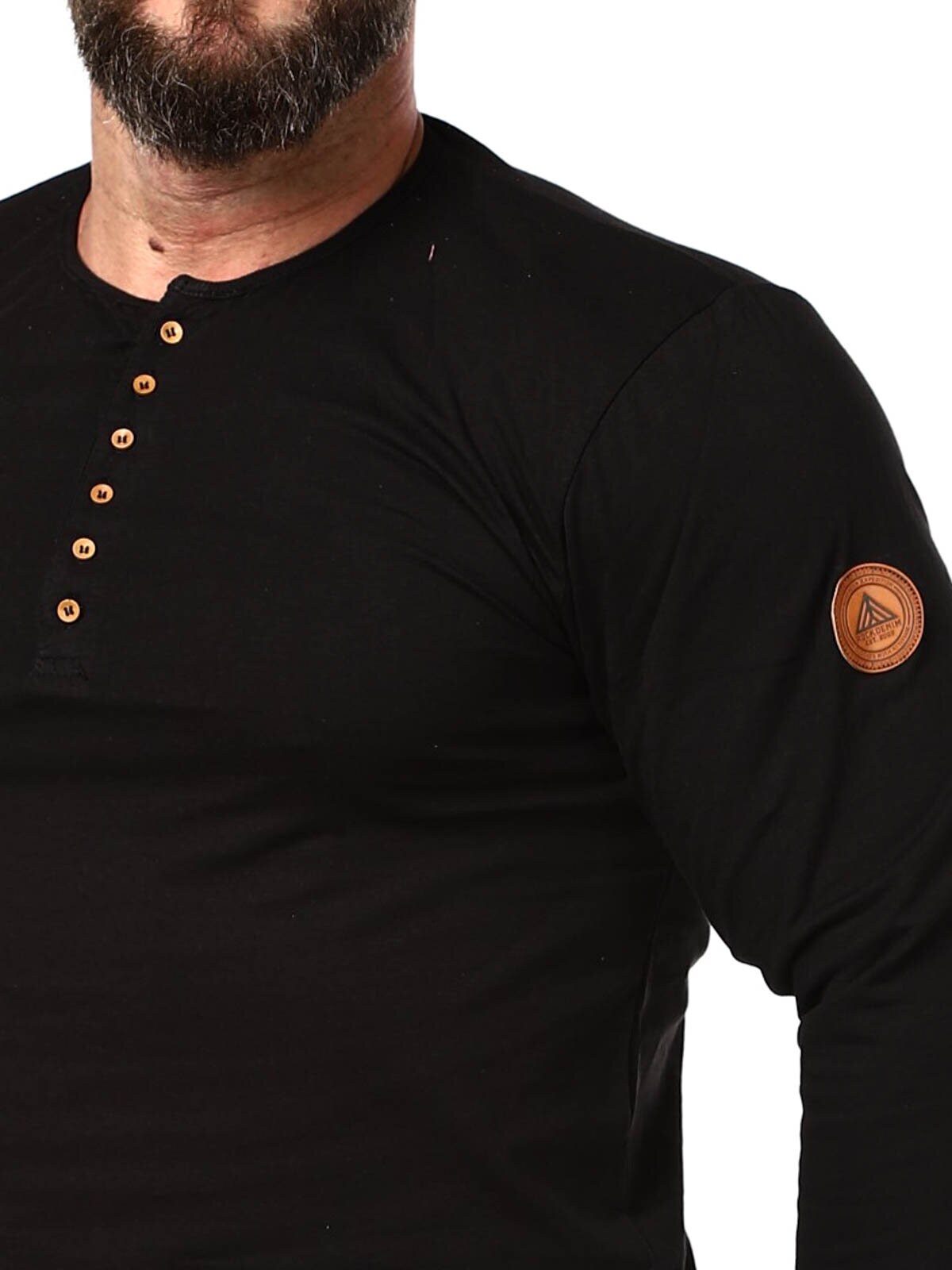 Her har vi fremstillet vores egen longsleeve i 100 % bomuld. Den har en klassisk pasform, og er designet med en knapåbning fortil. En lap, der kommer i en imitation af læder, ses på venstre ærme.