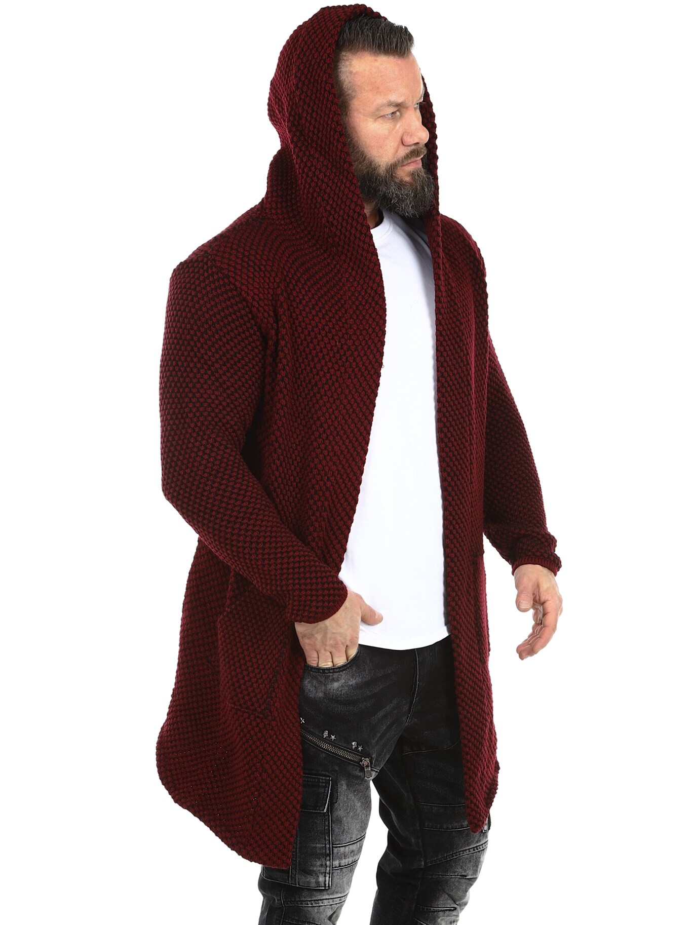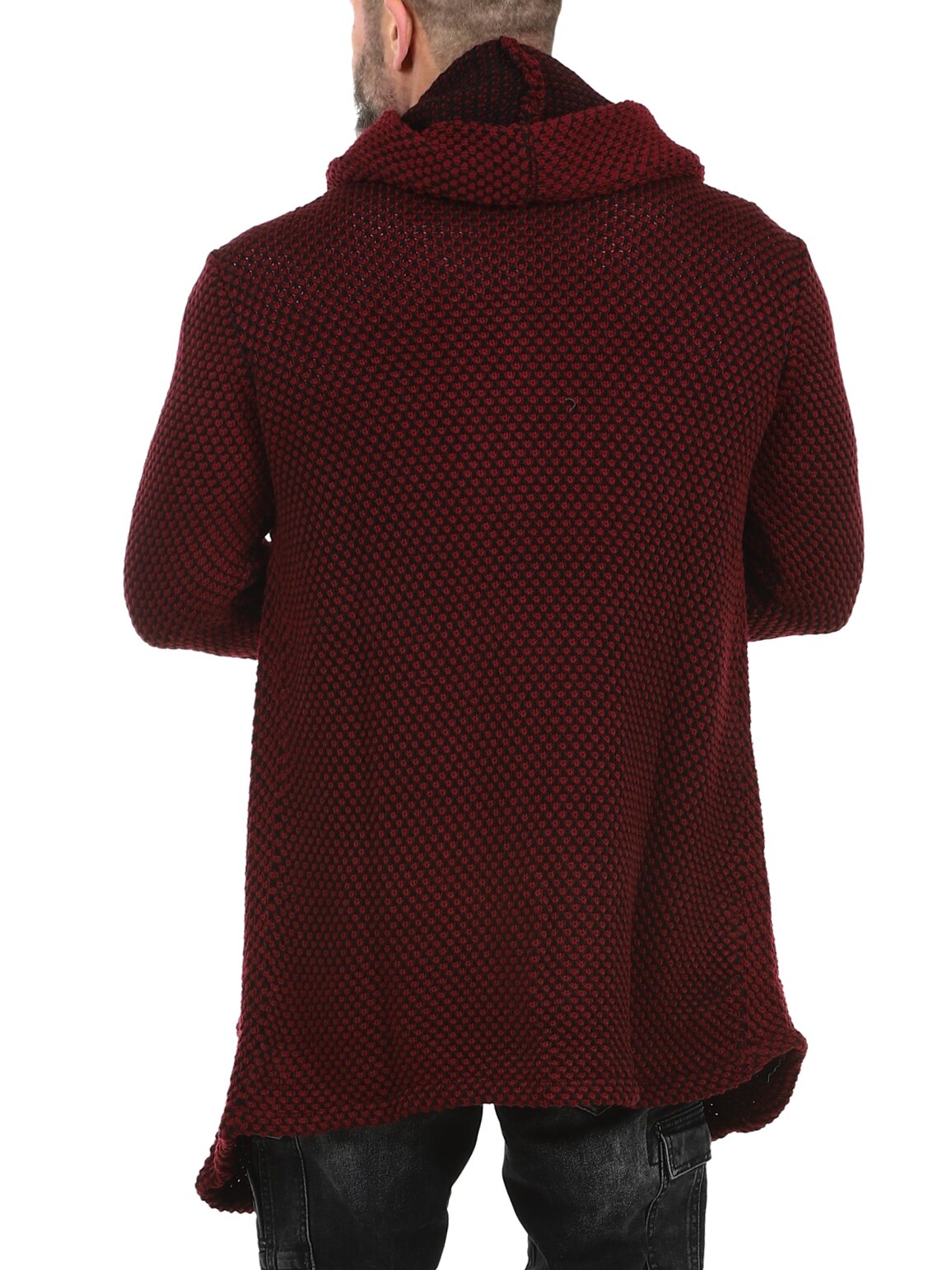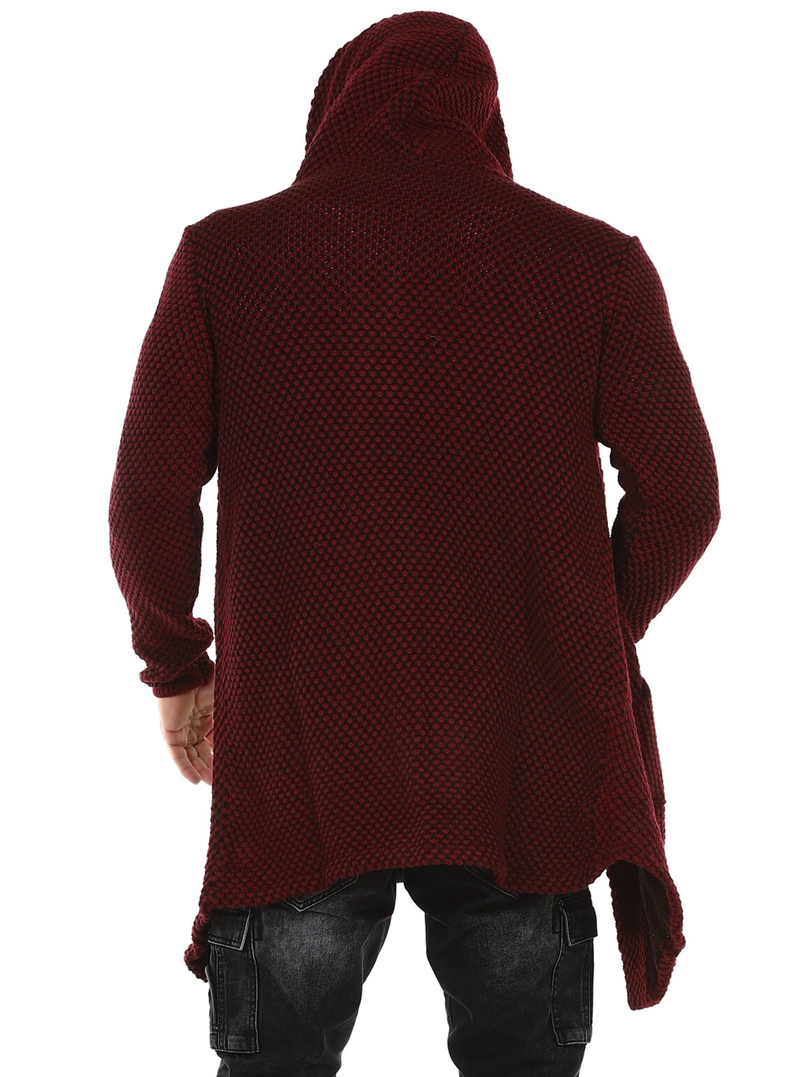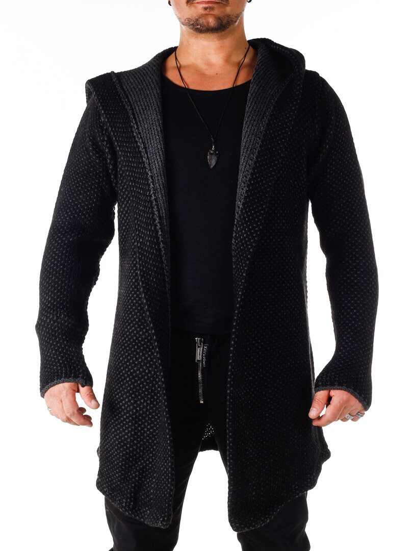Elastisk trøje med et flot mønster. Dette er en lang og elastisk model med en rummelig hætte og et spidst snit fortil. Den er fremstillet i et behageligt og varmende materiale.