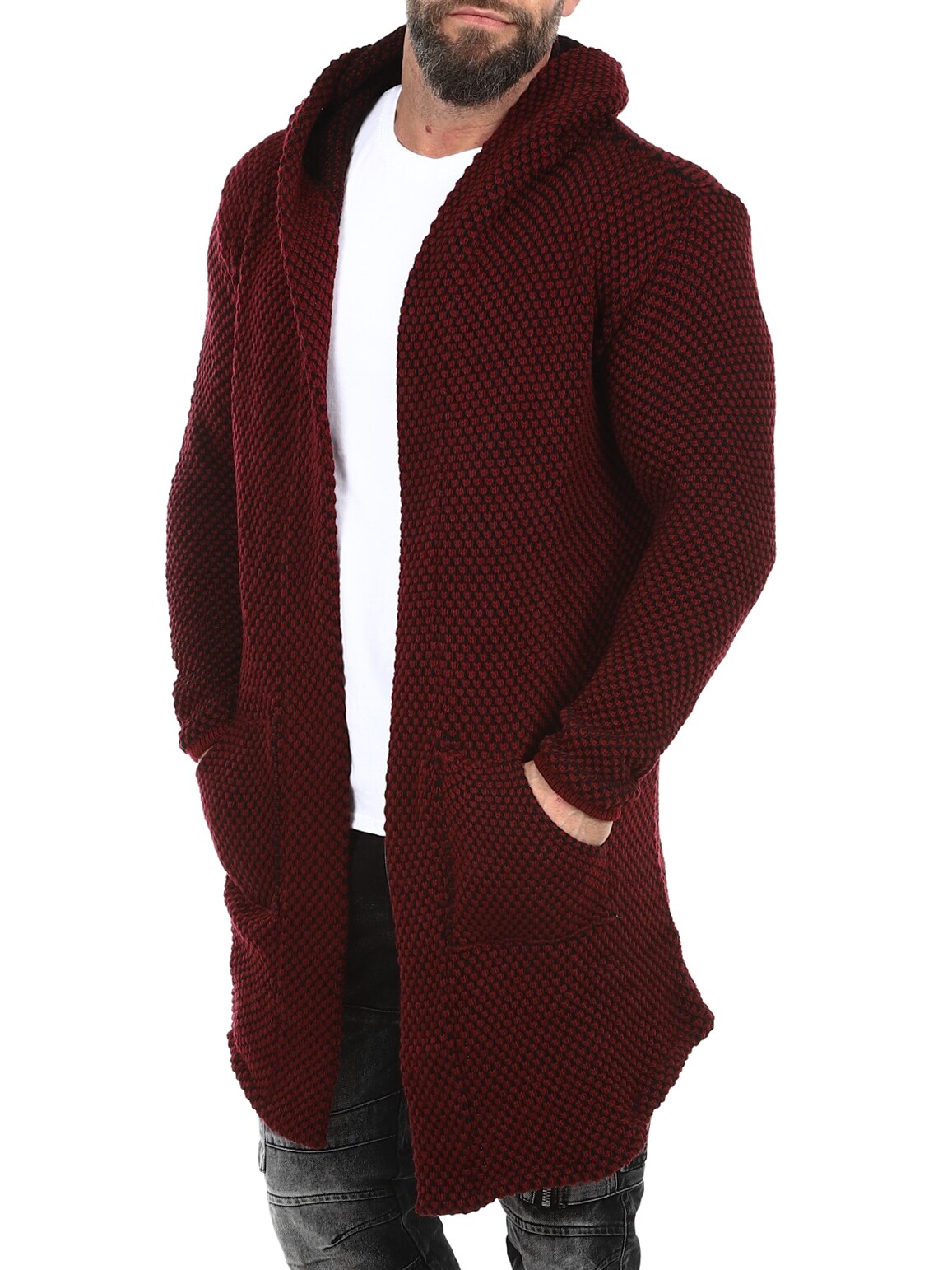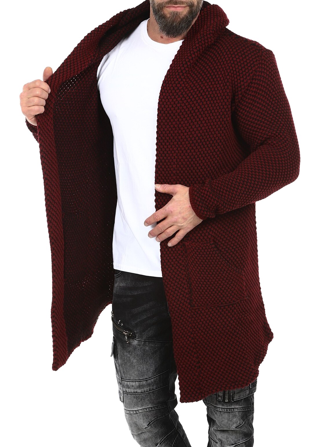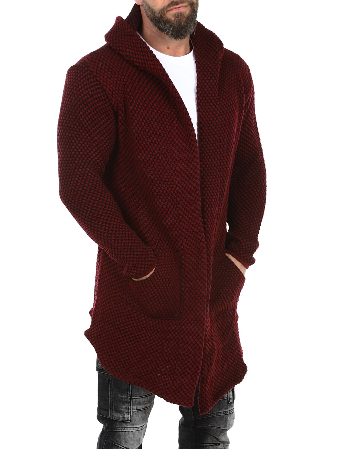Elastisk trøje med et flot mønster. Dette er en lang og elastisk model med en rummelig hætte og et spidst snit fortil. Den er fremstillet i et behageligt og varmende materiale.