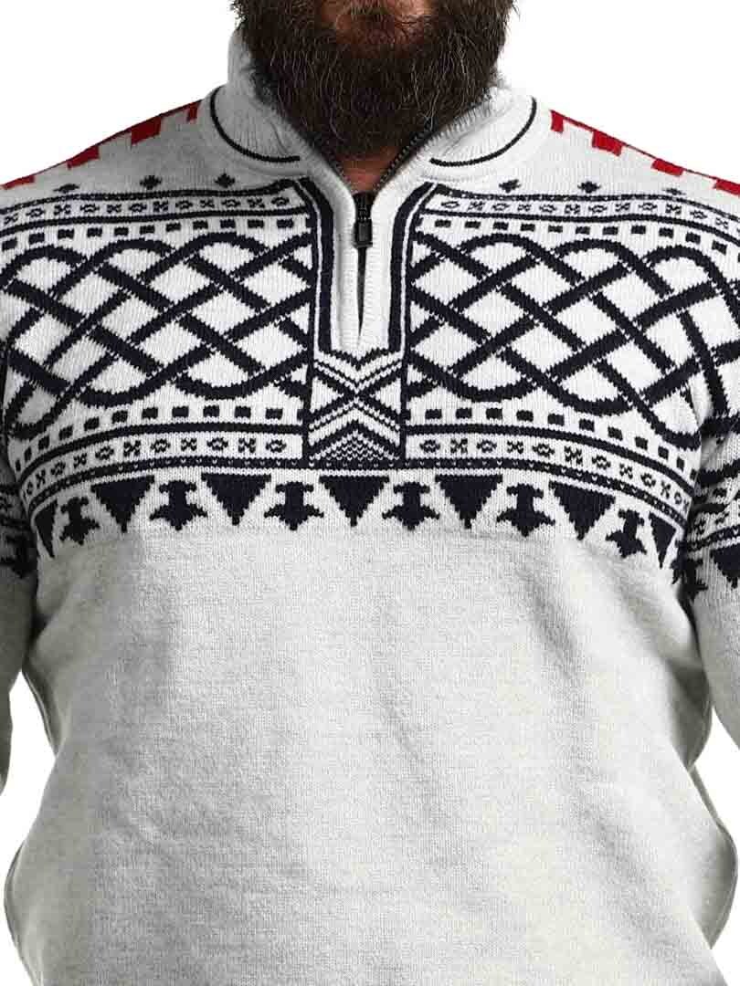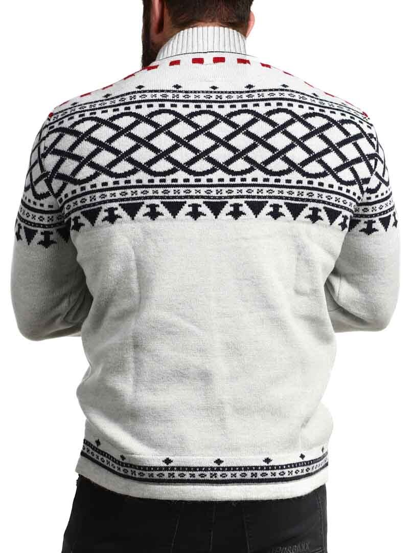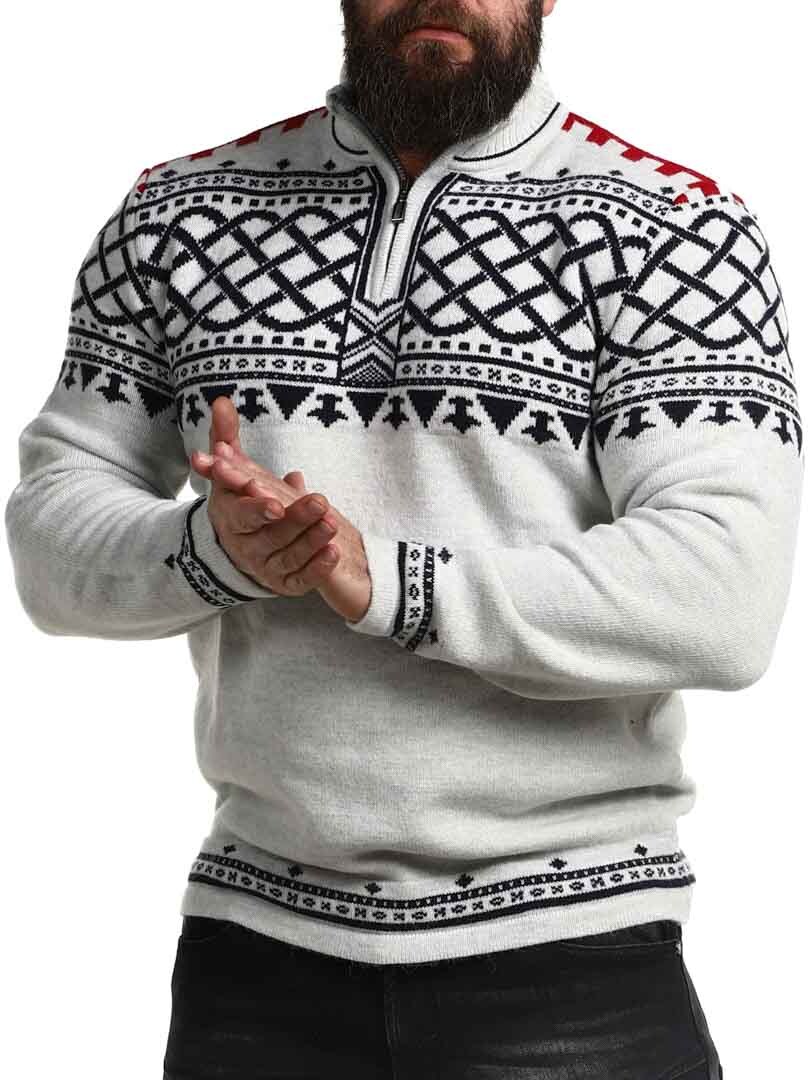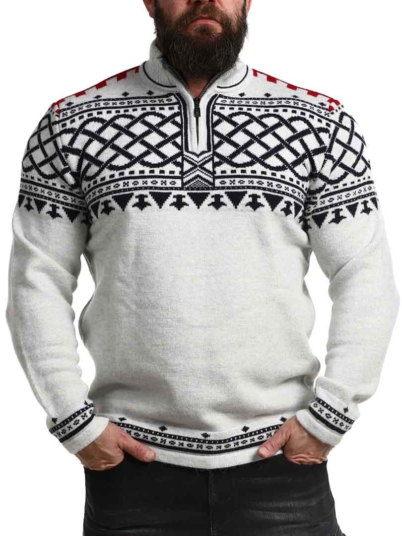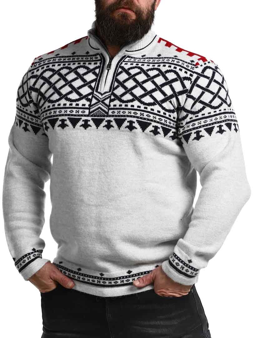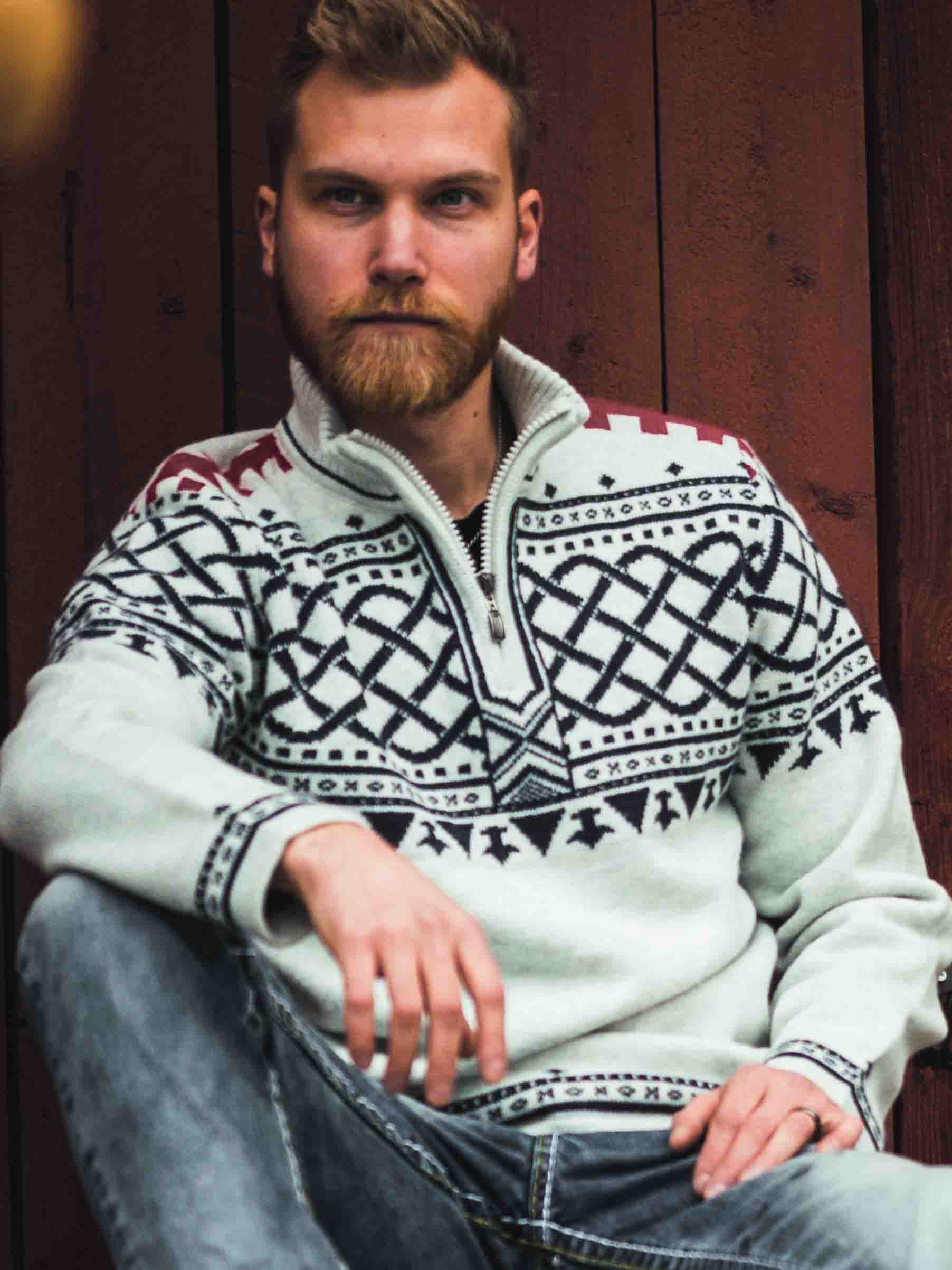 En robust og stilren trøje inspireret af nordisk tradition og vikingeånd! Strikket i en eksklusiv garnblanding, der giver både varme og komfort hele dagen. Trøjen har en klassisk krave med lynlås ved halsåbningen. Perfekt til at justere stil og varme efter behov.