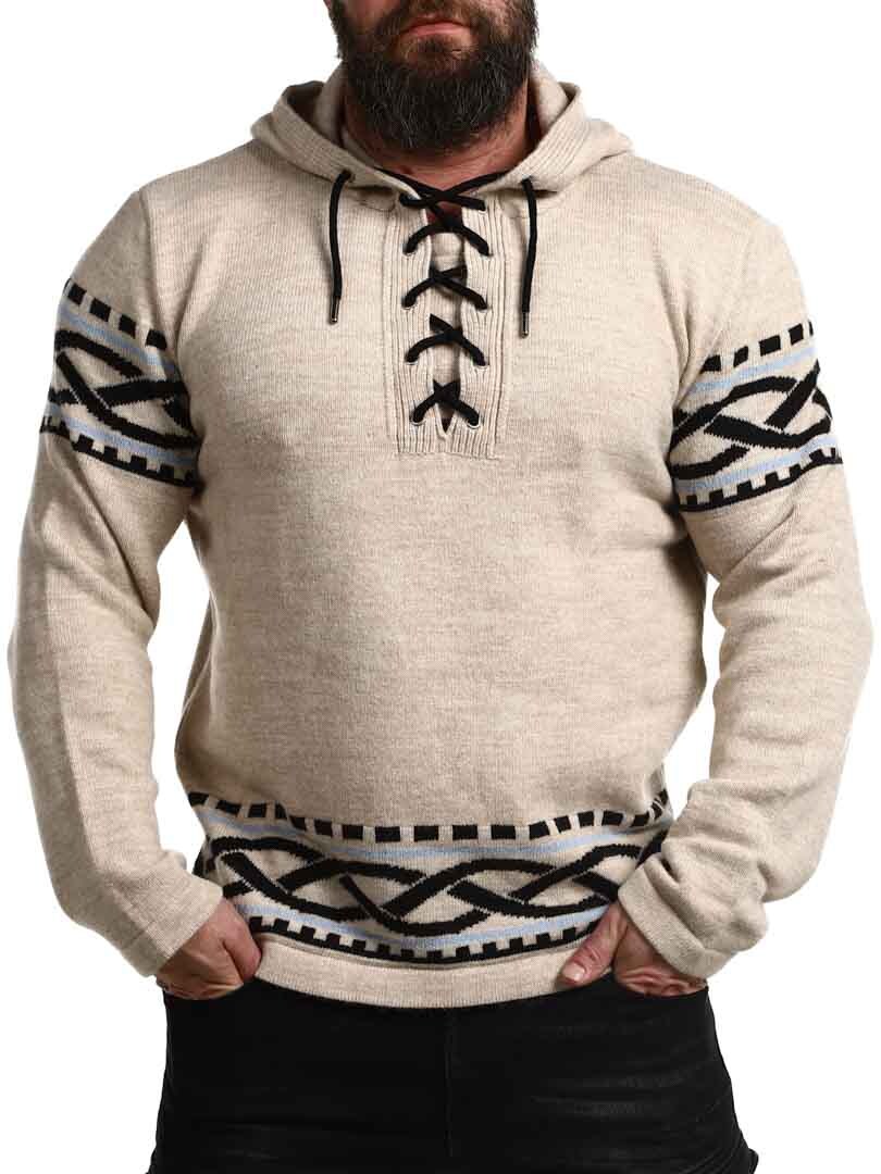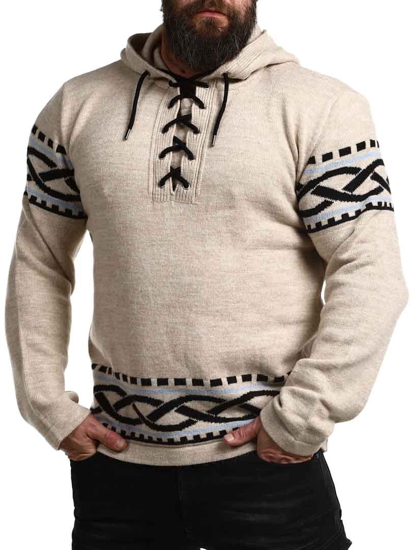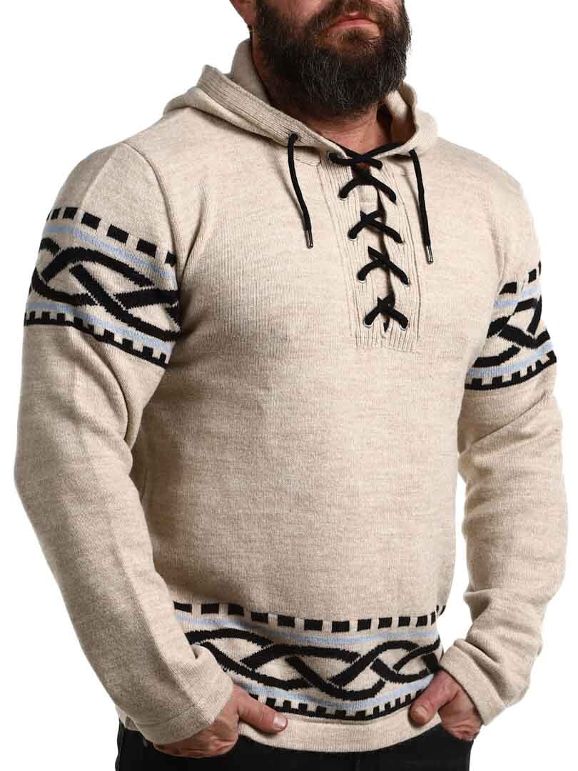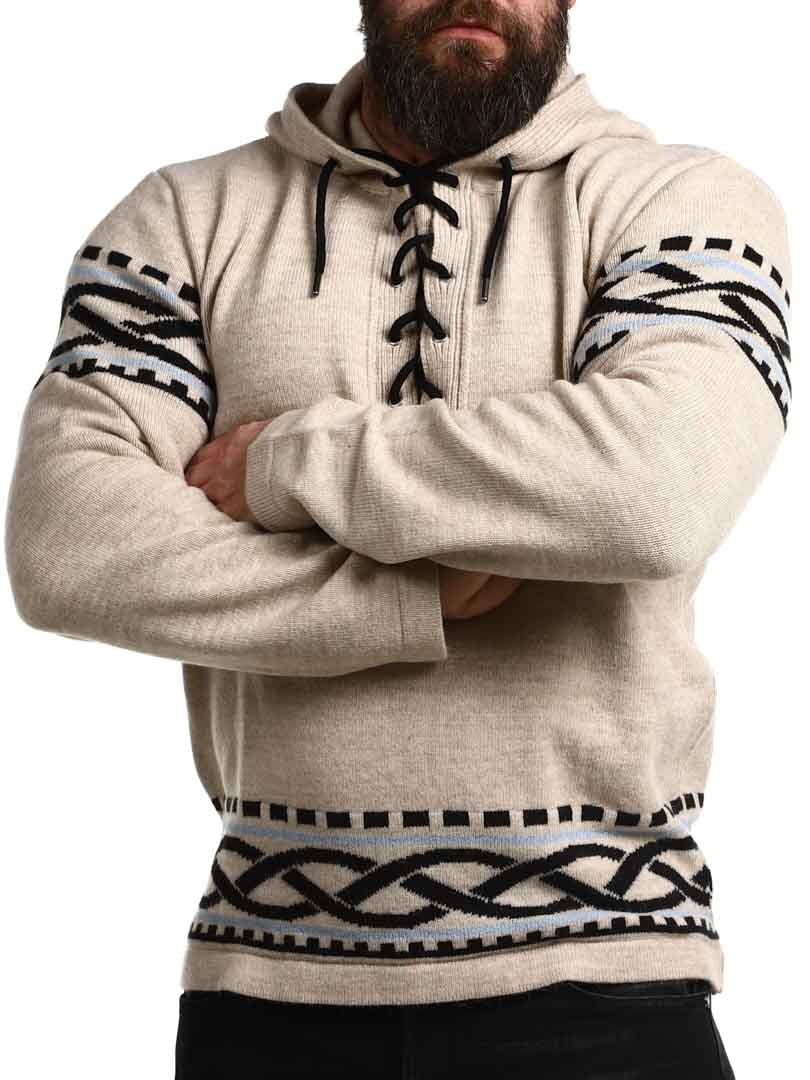 Mærk kraften fra Norden med vores vikingeinspirerede hættetrøje – en perfekt kombination af rå stil og moderne komfort. Trøjen har et autentisk nordisk mønster med tydelige vikingedetaljer på ærmer og kant, samt snøre ved halsåbningen, der giver et traditionelt og kraftfuldt udtryk. Den er lavet i et blødt og varmt materiale, der holder dig komfortabel hele dagen – uanset om du er ude i naturen eller vil skille dig ud i hverdagen.